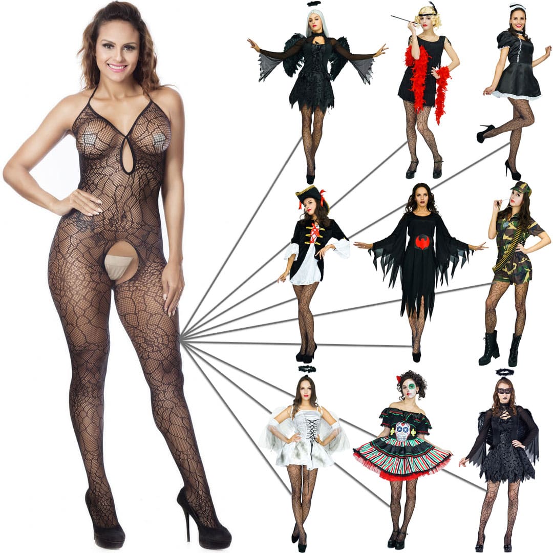 Еротичний прозорий БодіСтокінг (Боді комбінезон Сітка, ігровий костюм, костюм для рольових ігор) через шию в дрібну сітку з малюнком павутина, між грудьми виріз крапля, по центру ластавніци (в паху) розріз.