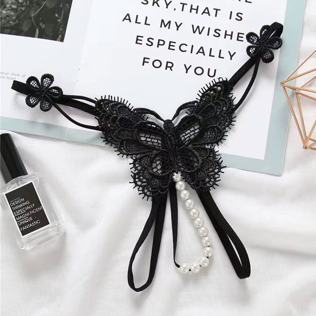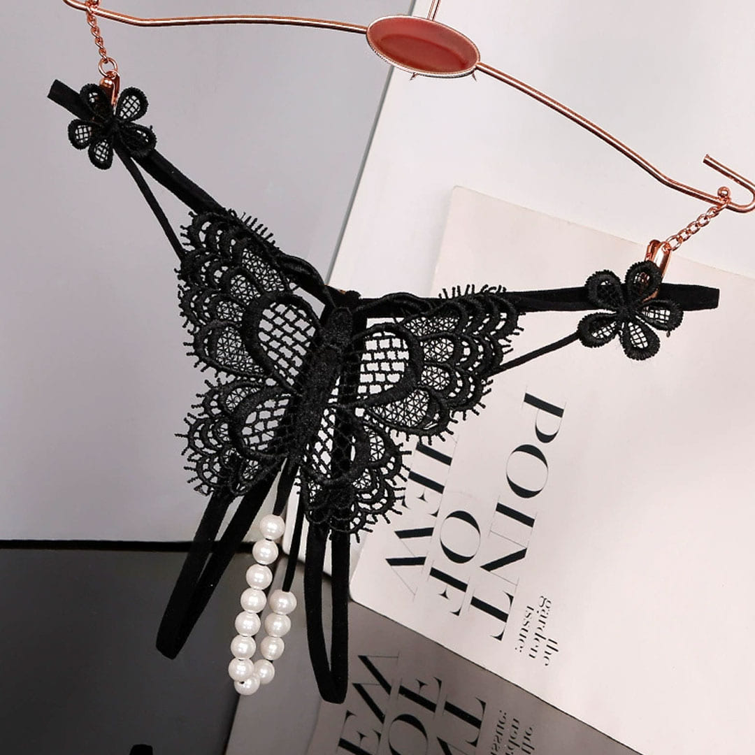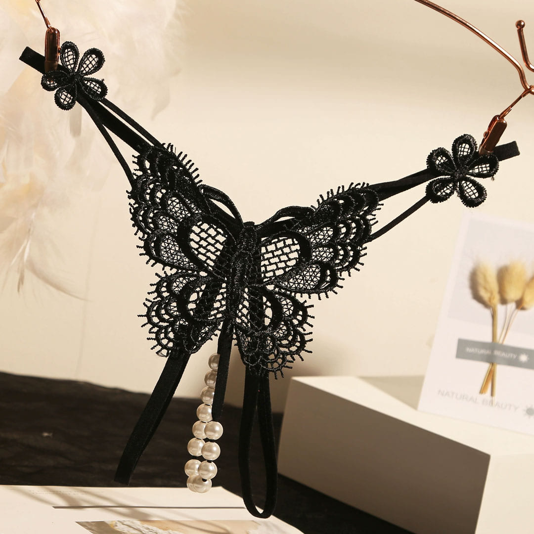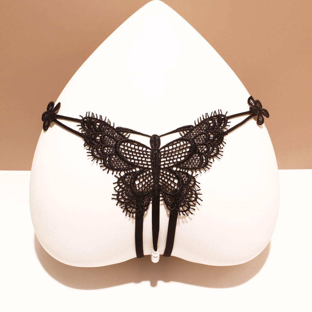 Чорні еротичні трусики з перлинною ниткою та мереживом у формі метелика.