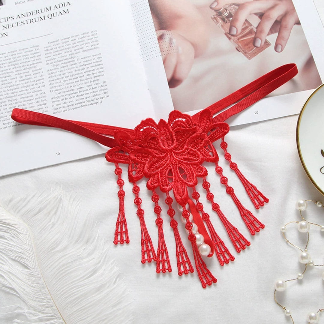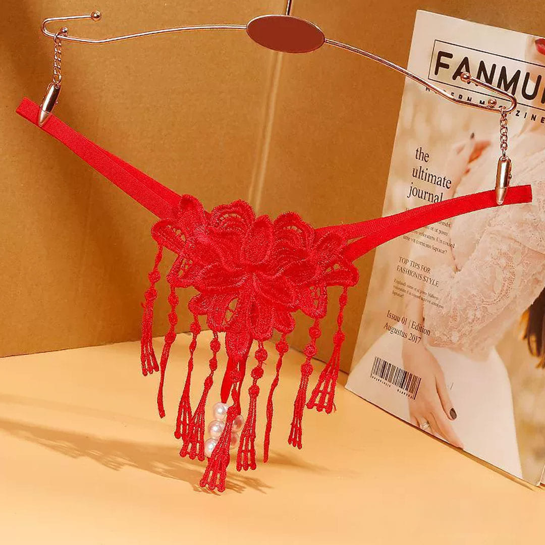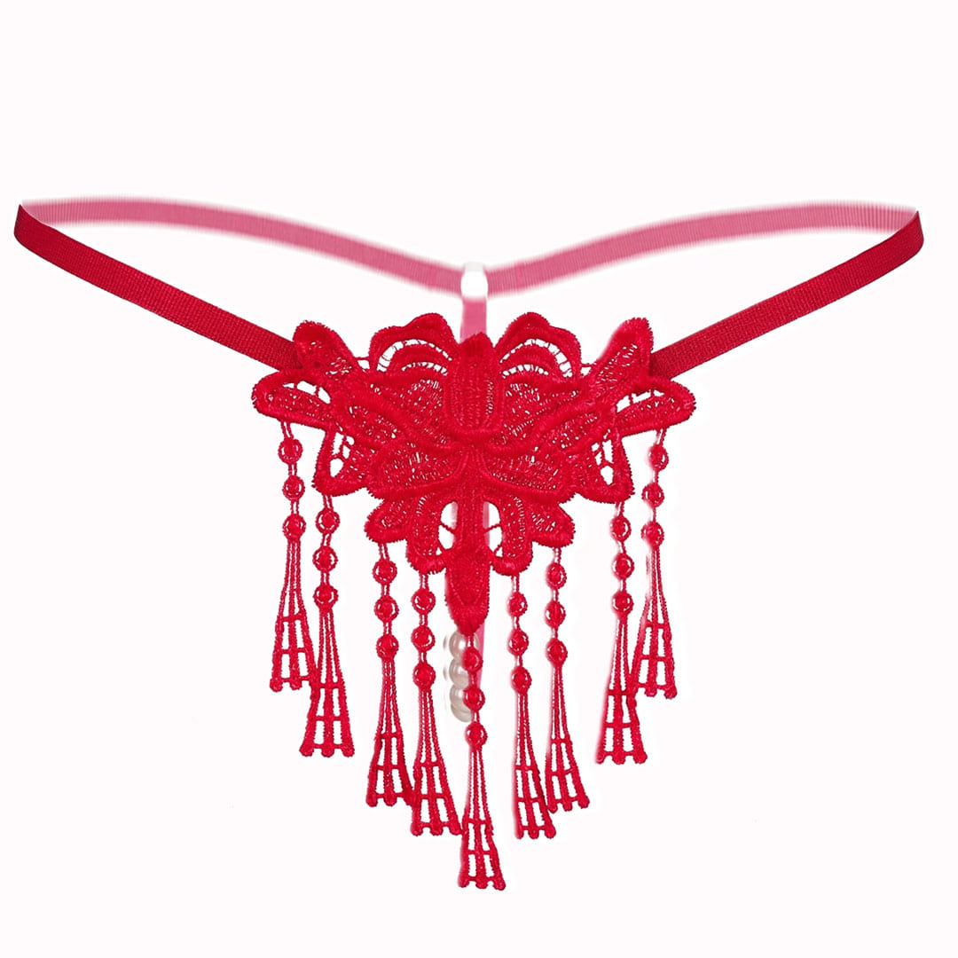 Червоні мереживні трусики з перлинною ниткою та декоративними підвісаси (бахромою).