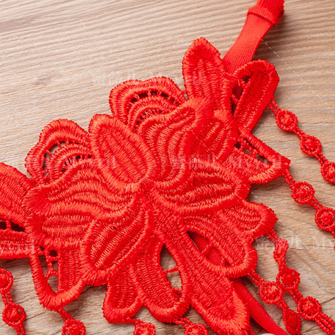 Вишукана модель з червоного мережива, виконаного у вигляді квітки, підкреслює жіночність та витонченість. Особливий акцент — перлинна нитка, що додає образу пікантності та чуттєвості.