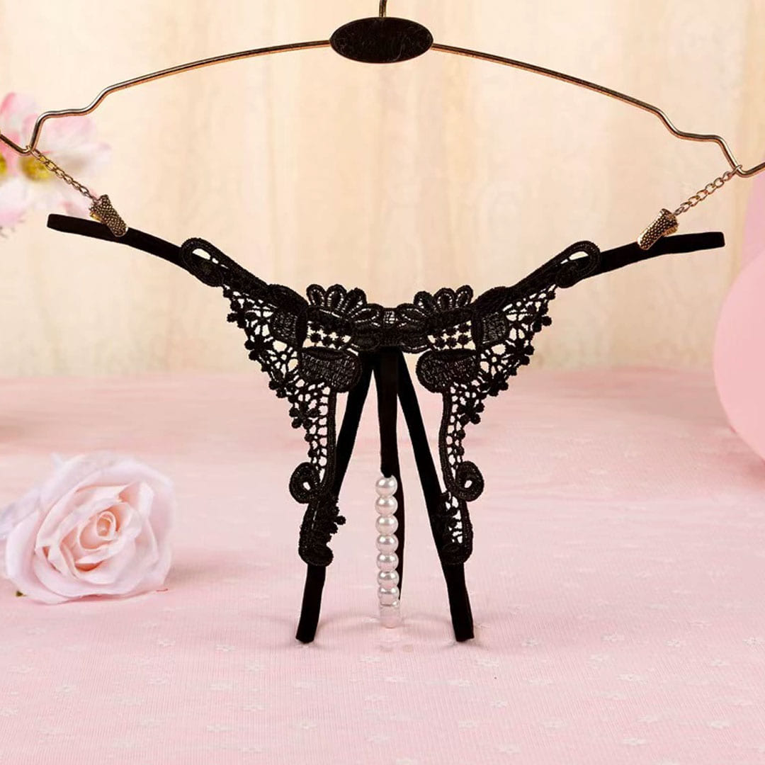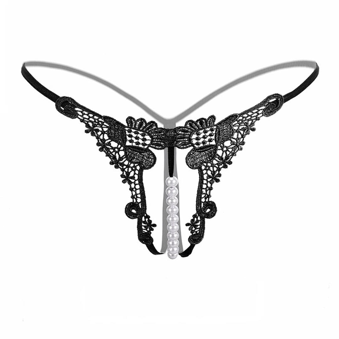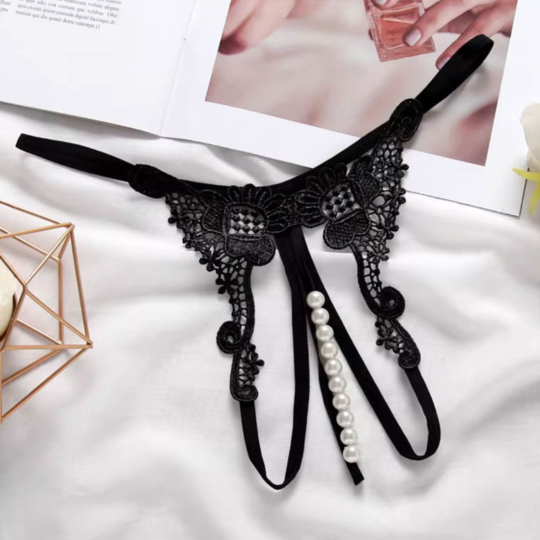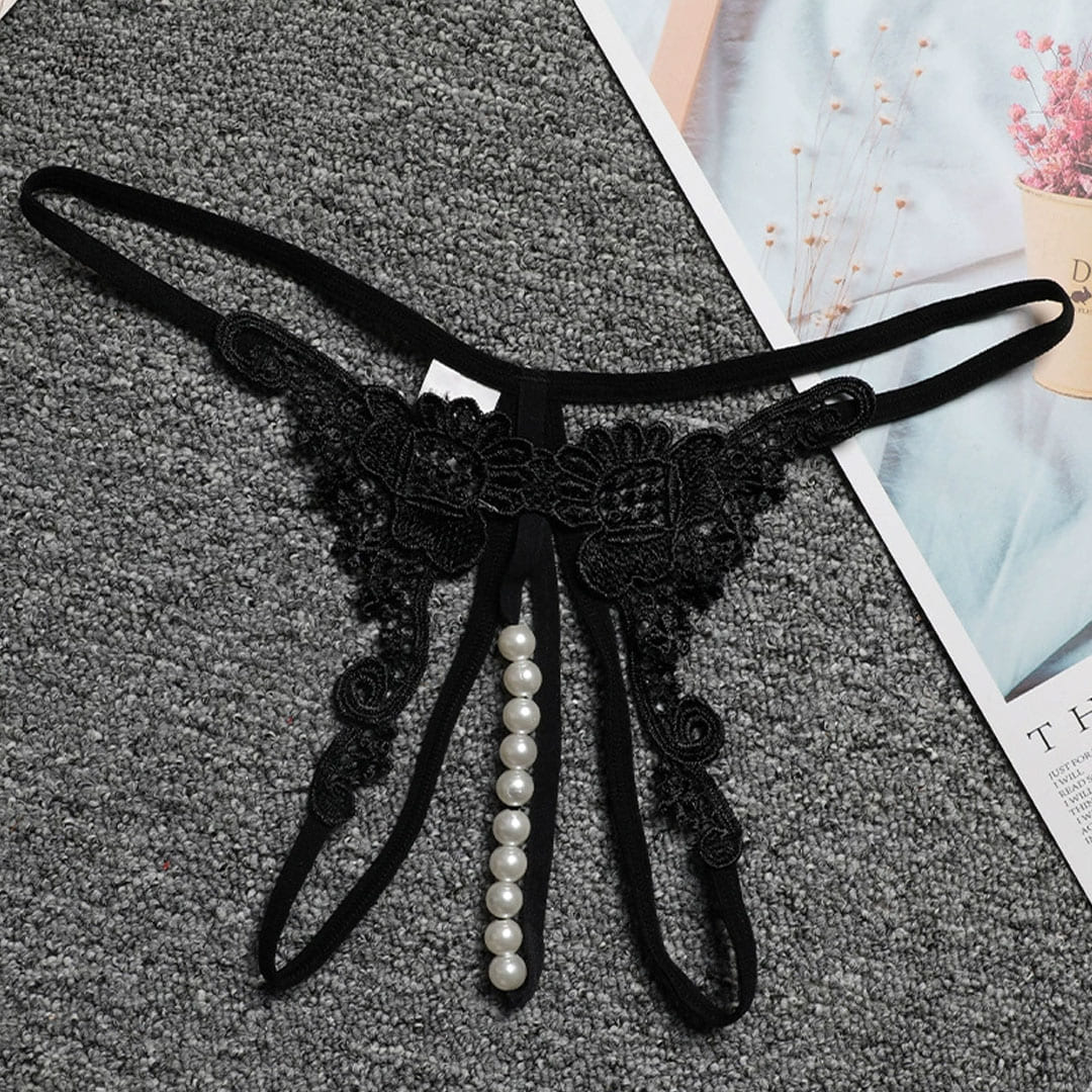 Чорні мереживні трусики з перлинною ниткою та квітковим візерунком.