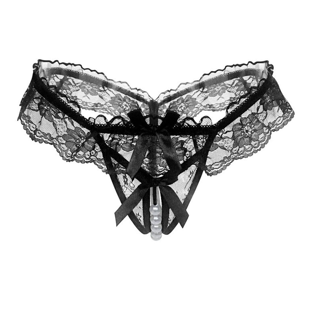 Чорні мереживні трусики з бантиком та перлинною ниткою
