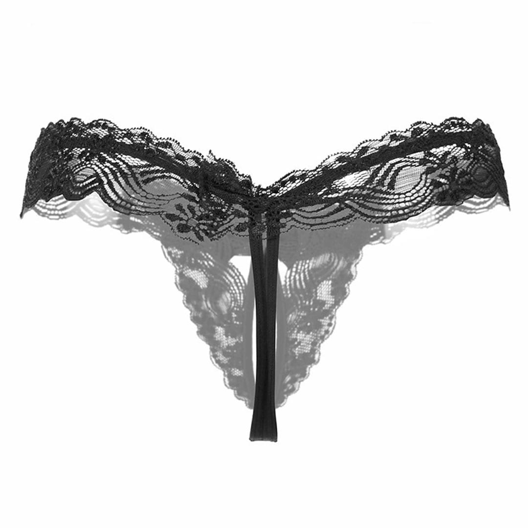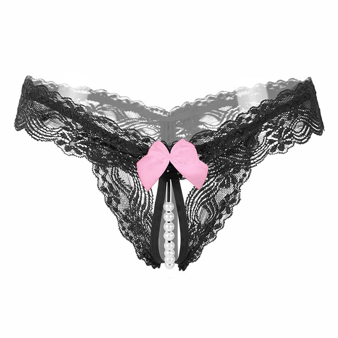 Чорні мереживні трусики з доступом, бантиком та перлинною ниткою.