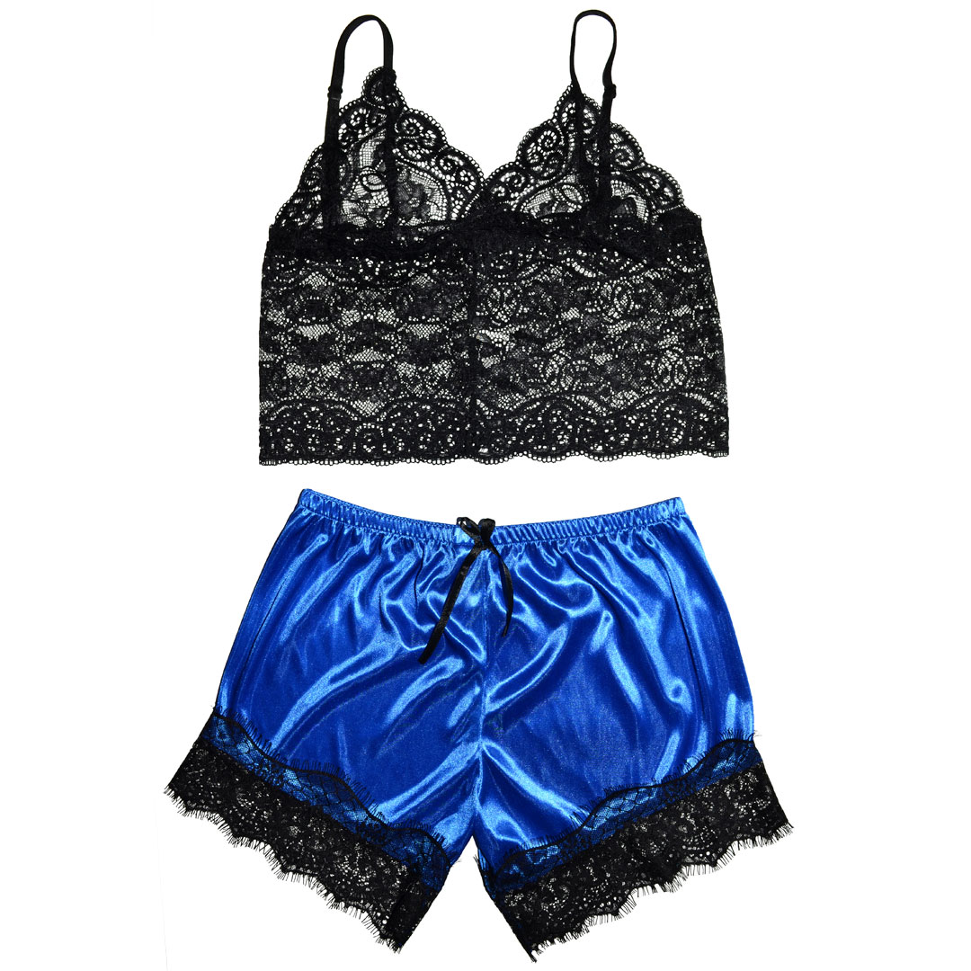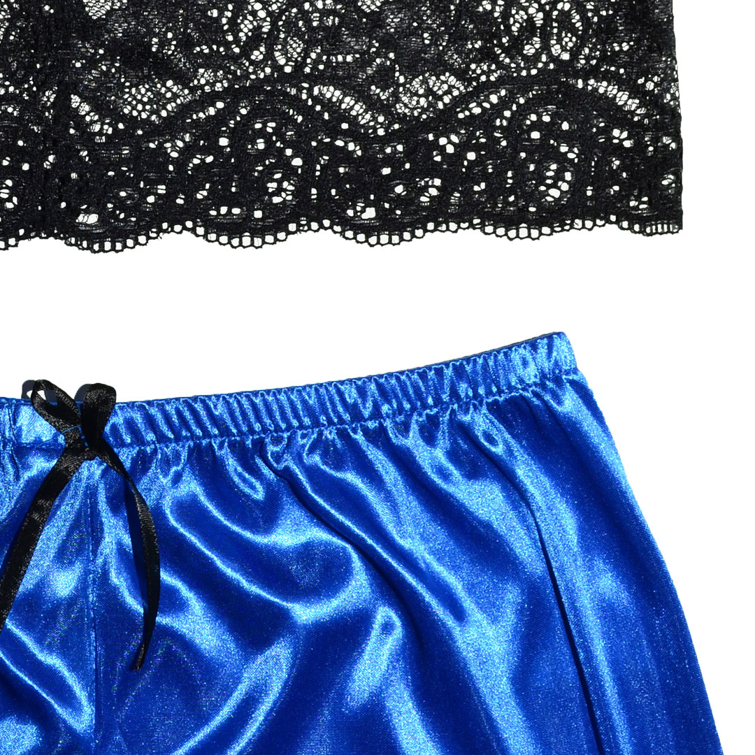 Контрастні короткі шорти з блискучої тканини на гумці в поясі, по вирізу ноги широке чорне мереживо.