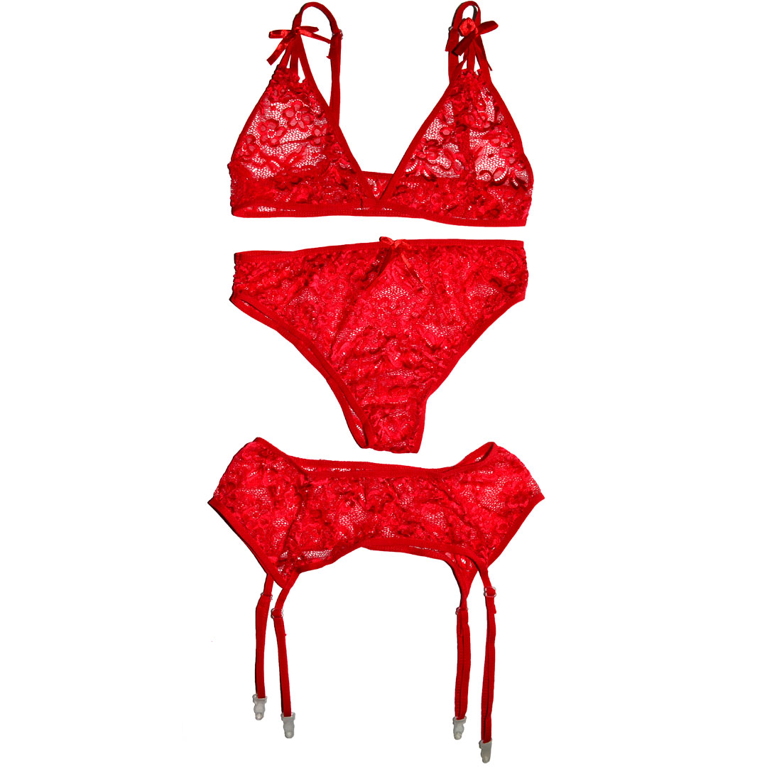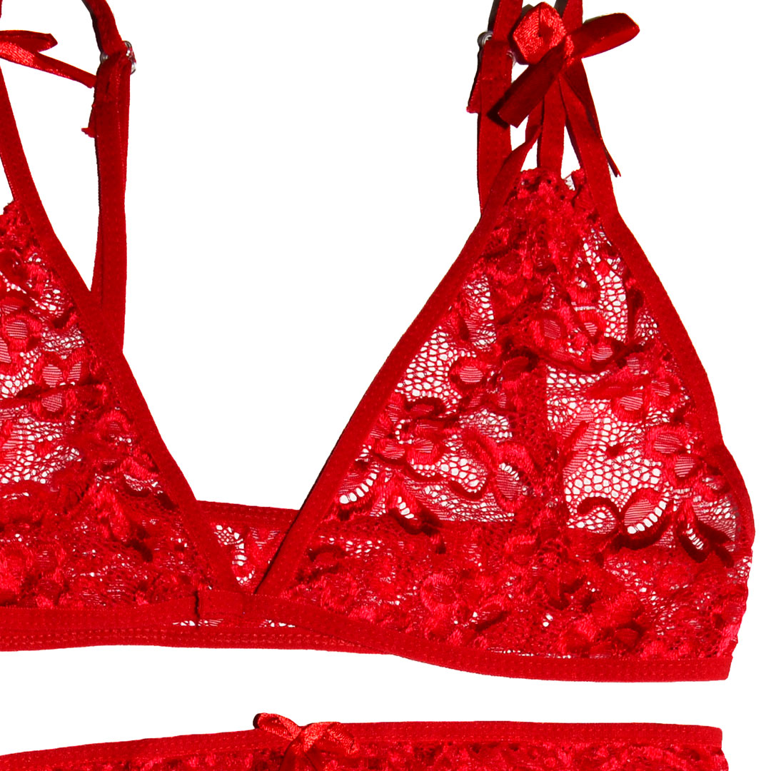 Еротичний комплект (ігровий костюм, костюм для рольових ігор) бюстгальтер, труси та пояс для панчох (без панчох) з квіткового мережива.