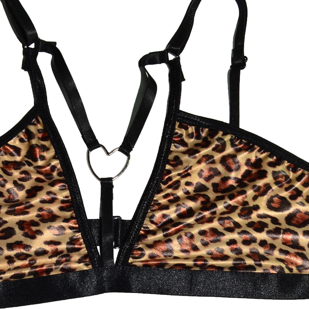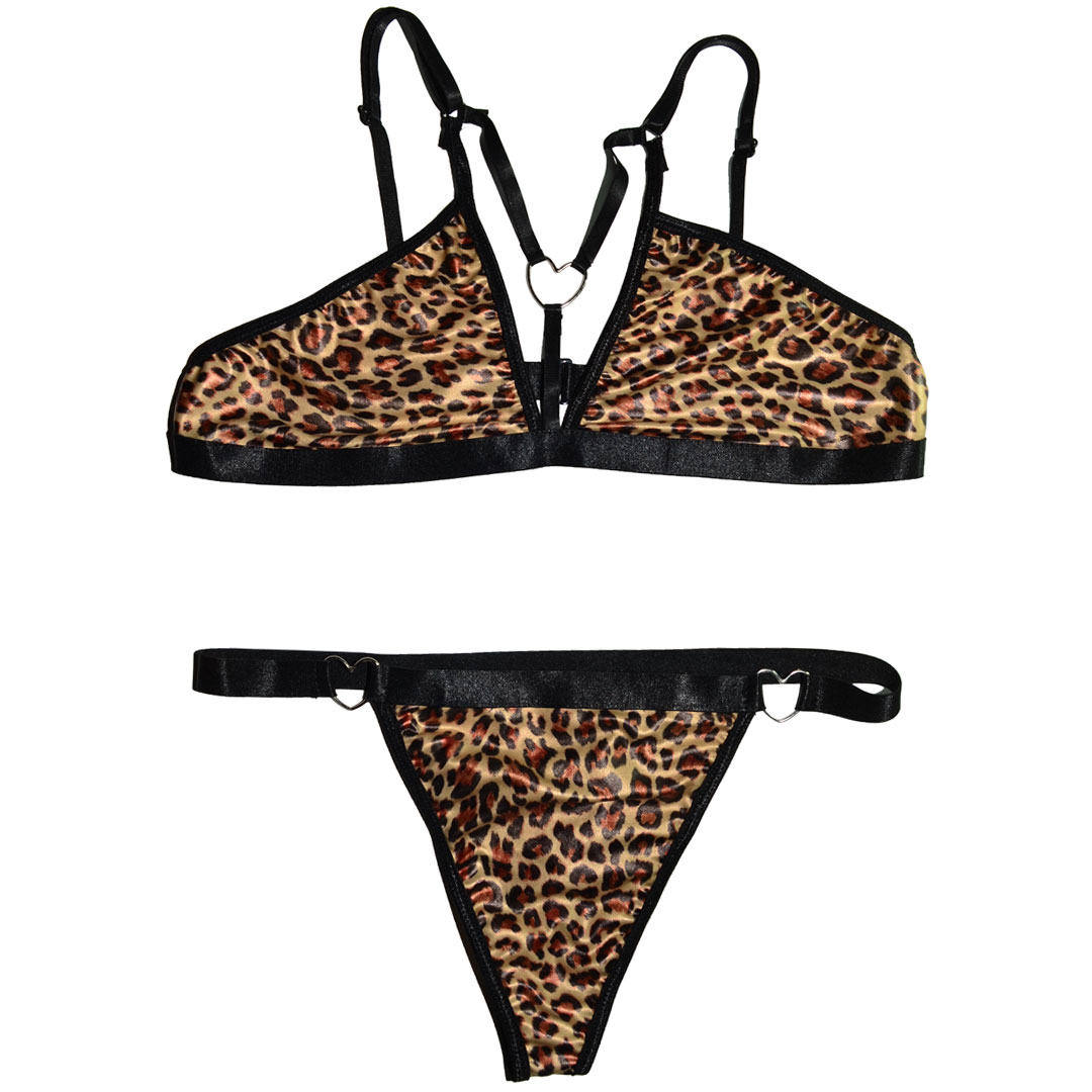 Еротичний комплект (ігровий костюм, костюм для рольових ігор) бюстгальтер та труси з блискучої еластичної тканини з леопардовим принтом.