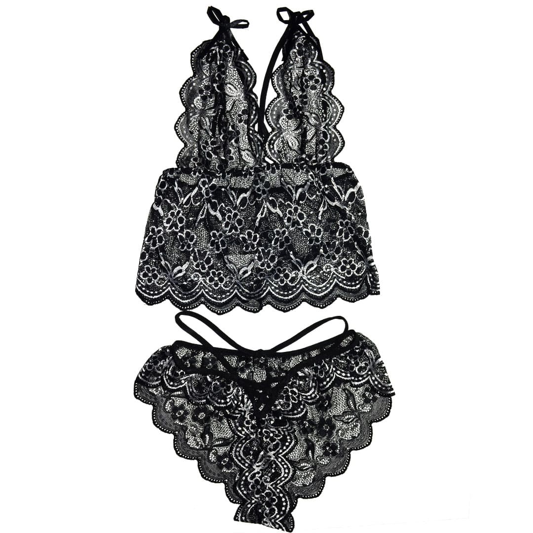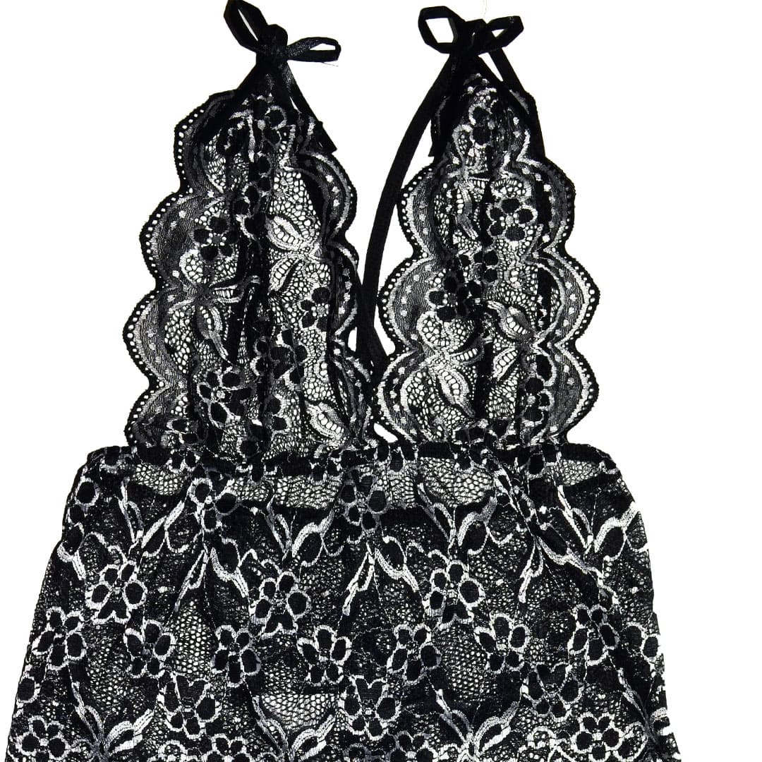 Чорний з білим еротичний комплект (ігровий костюм, костюм для рольових ігор) майка та труси з квіткового мережива з контрастною вишивкою.