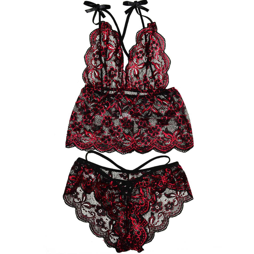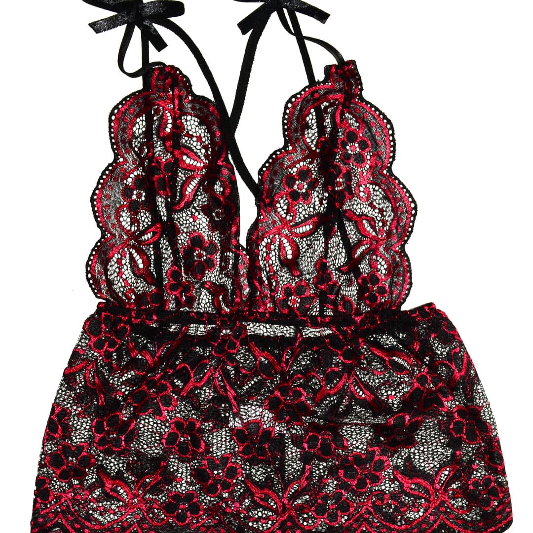 Чорний з червоним еротичний комплект (ігровий костюм, костюм для рольових ігор) майка та труси з квіткового мережива з контрастною вишивкою.