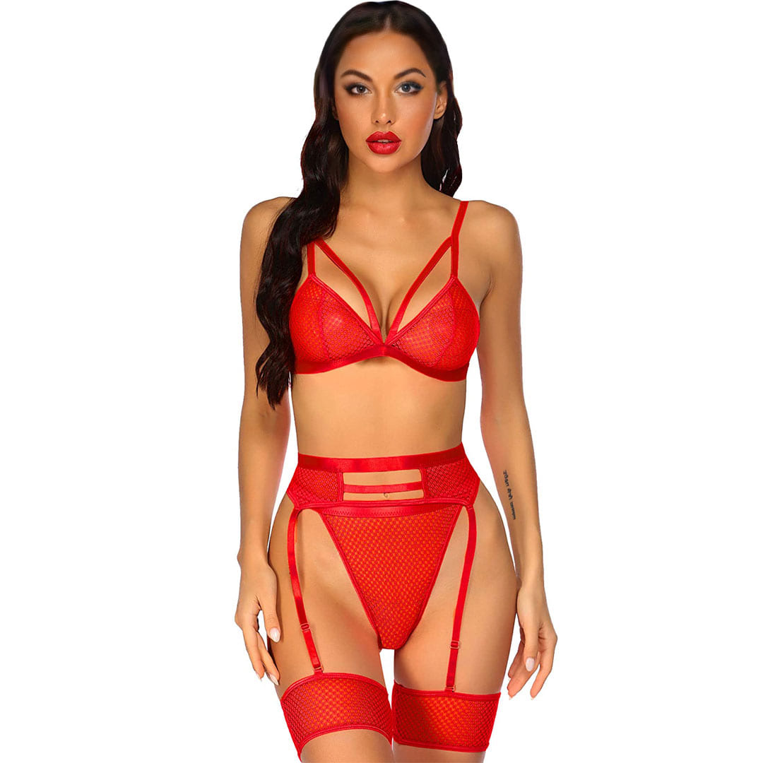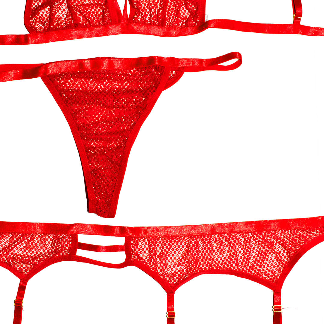 Червоний еротичний комплект (ігровий костюм, костюм для рольових ігор) бюстгальтер, труси та пояс зі знімними гратерами (портупея на ноги) з мережива з геометричним малюнком.