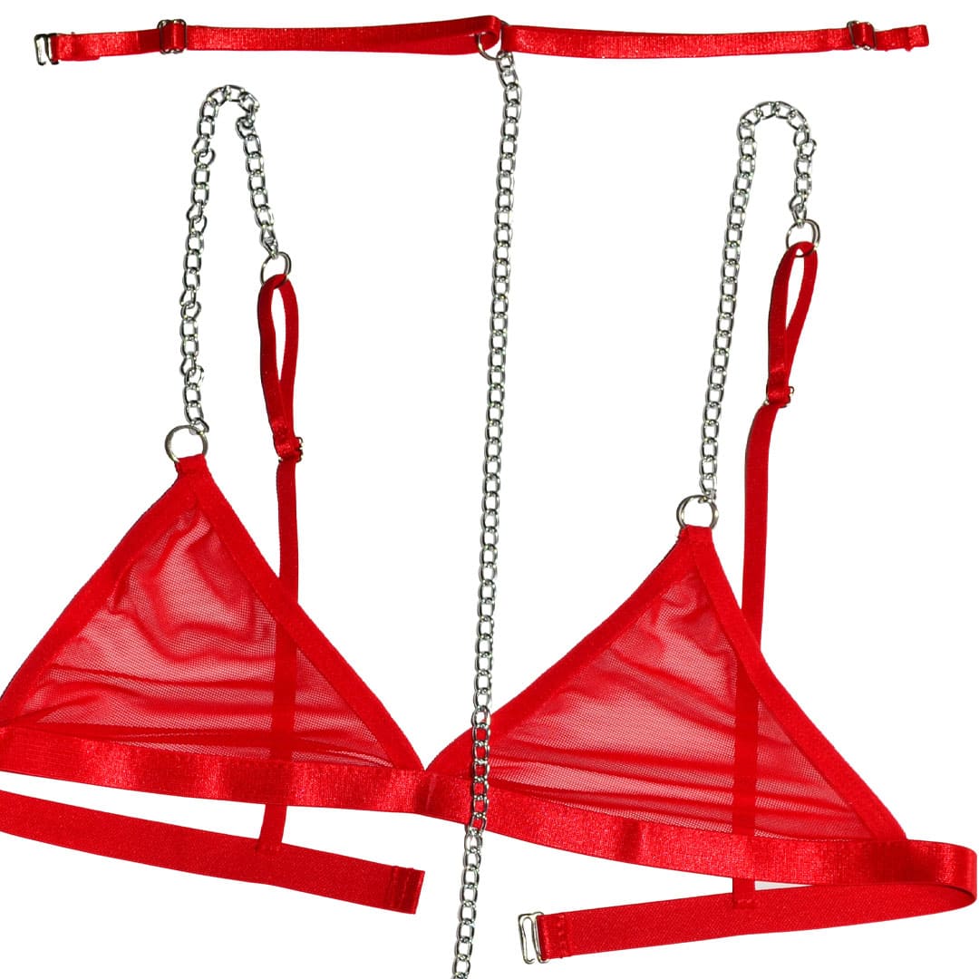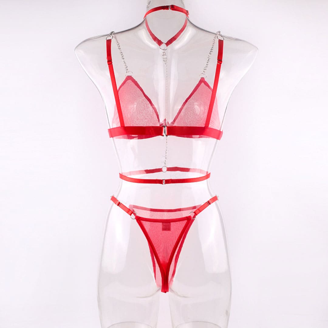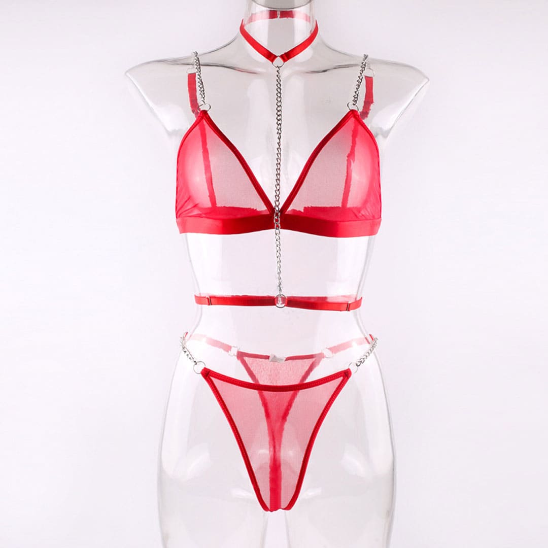 Червоний напівпрозорий еротичний комплект (ігровий костюм, костюм для рольових ігор): бюстгальтер, труси та портупея-ланцюжок.