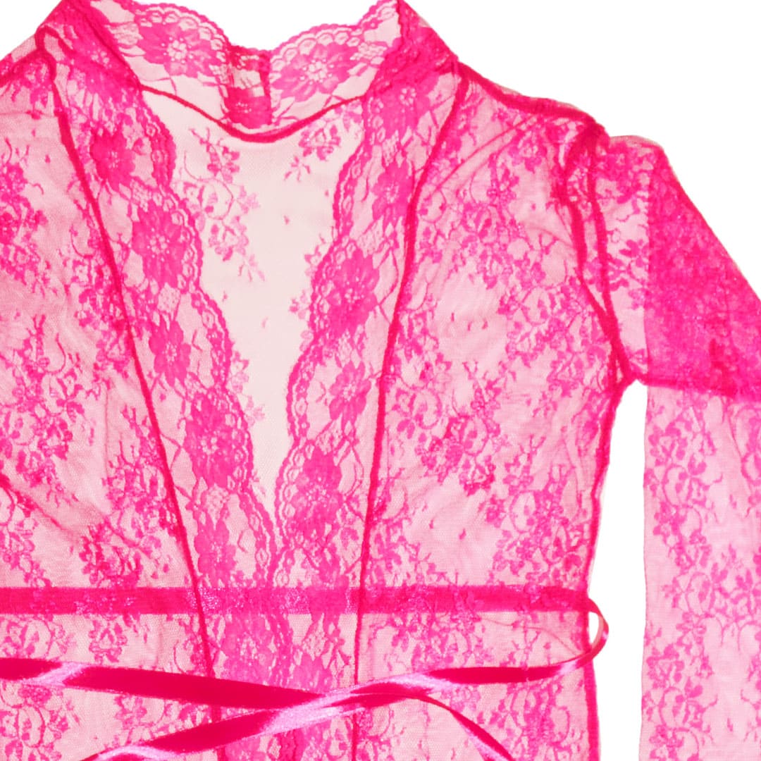 Короткий прозорий халат з довгим рукавом на запáх з поясом, по внутрішньому краю передніх пол і на рукавах широке мереживо, по низу вузьке мереживо.