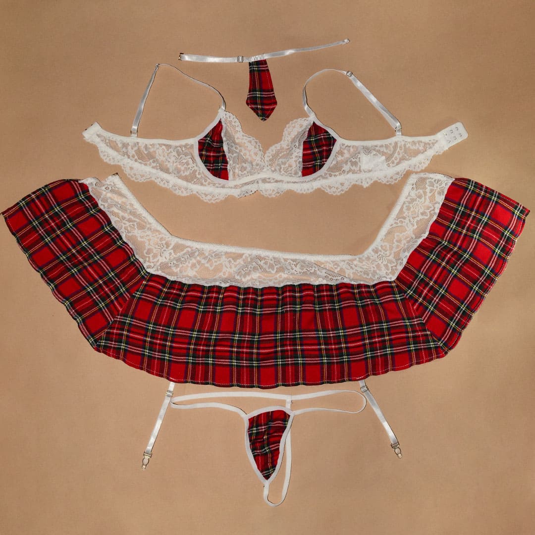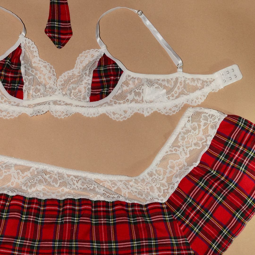 Червона в клітку міні-спідниця на резинці, зверху біла мережива вставка, ззаду розріз із застібкою на гачок, спереду дві вшиті підвязки, що регулюються, для панчіх.