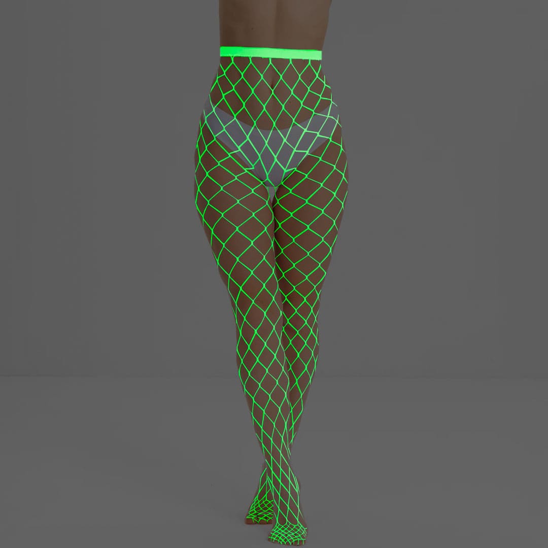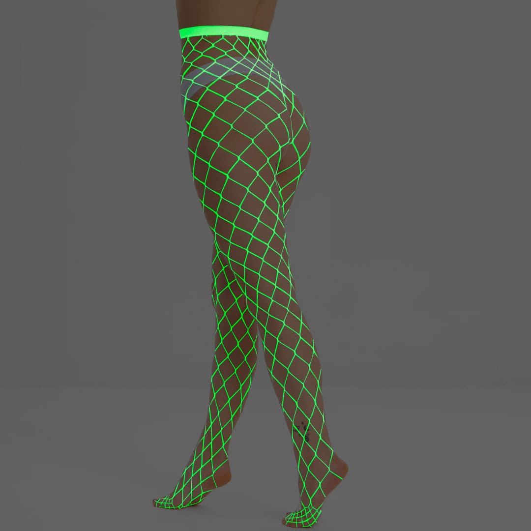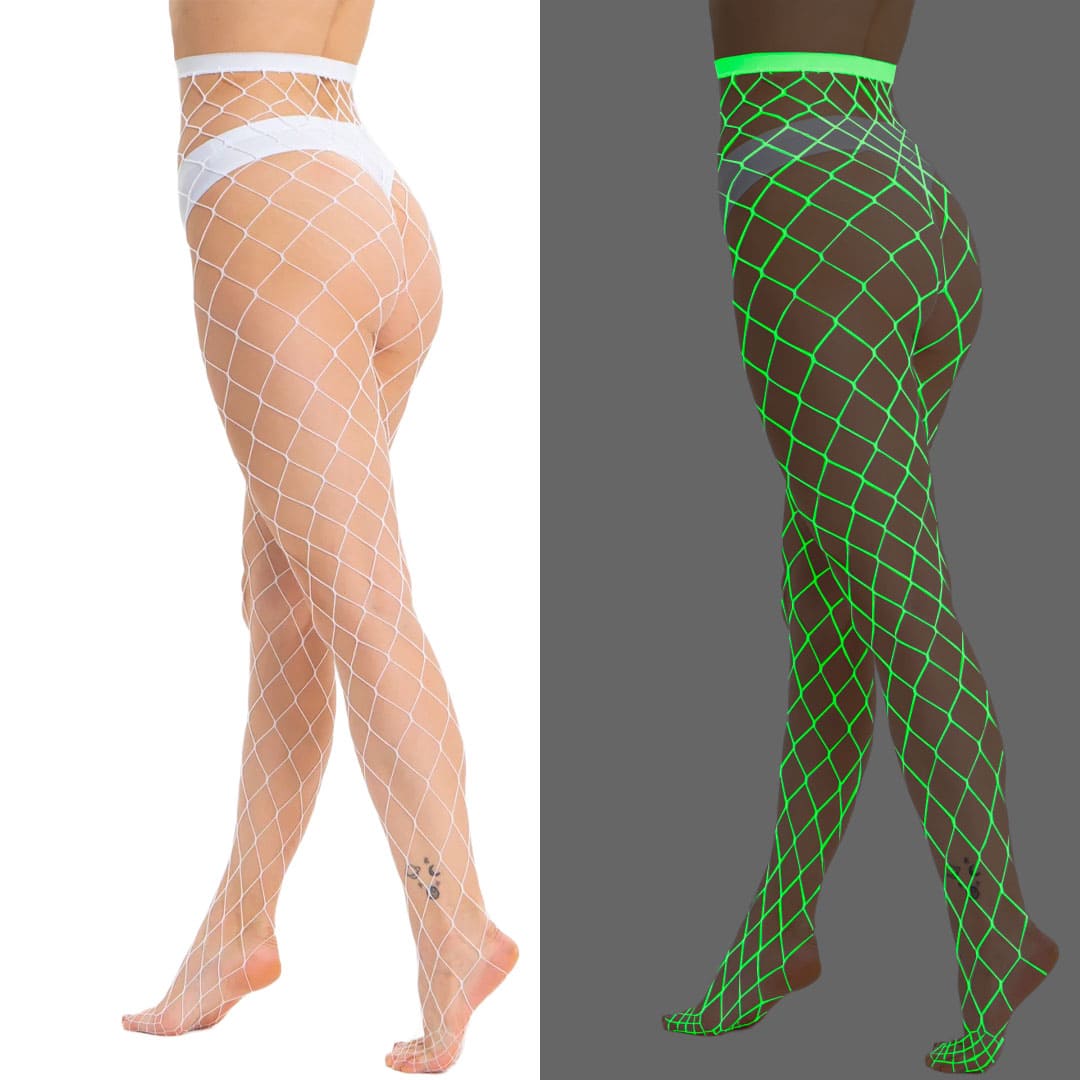 Колготки білі, що світиться в темряві салатовим у велику сітку із поясом-резинкою та з ефектом люмінесценції (накопичує світло а потім світитися в темряві).