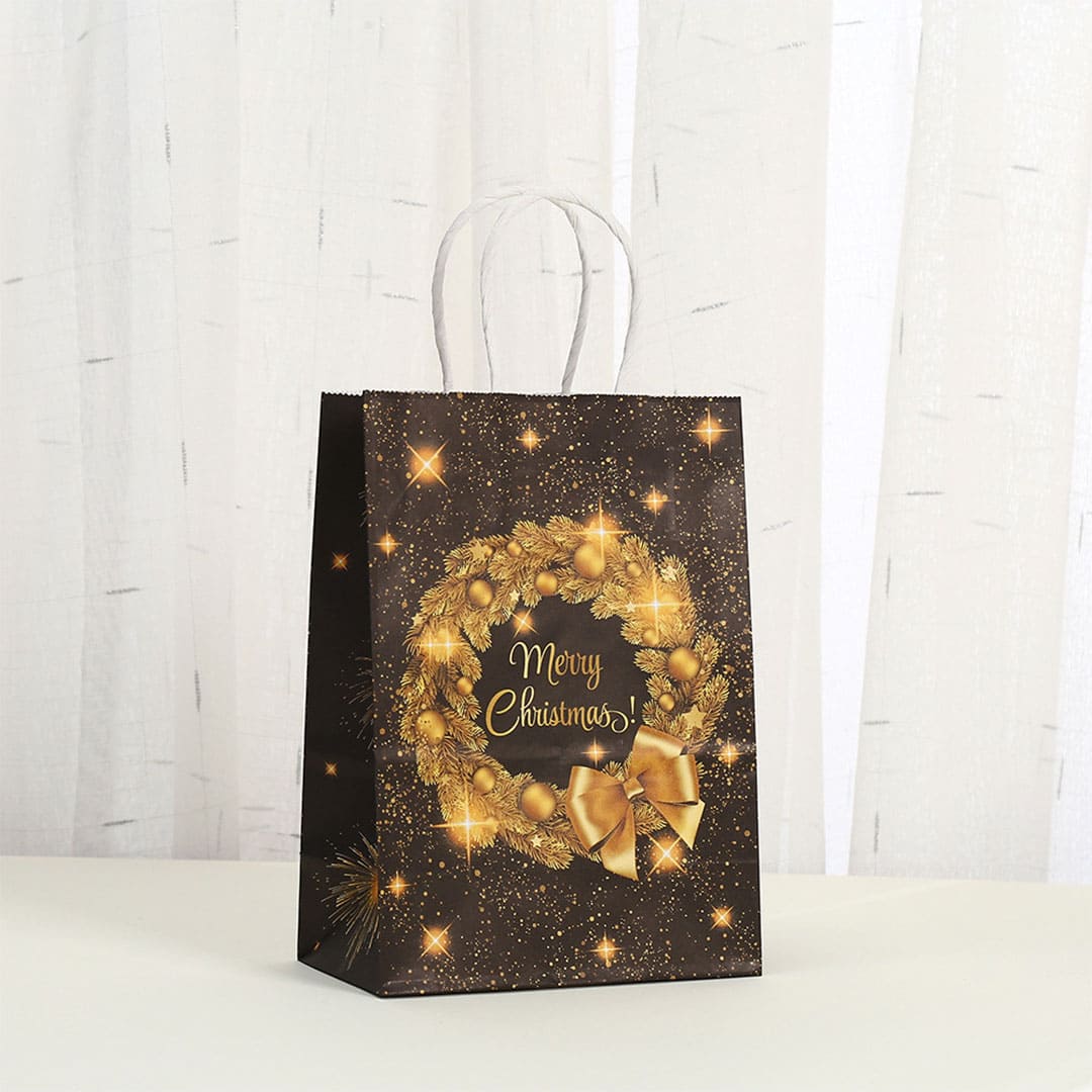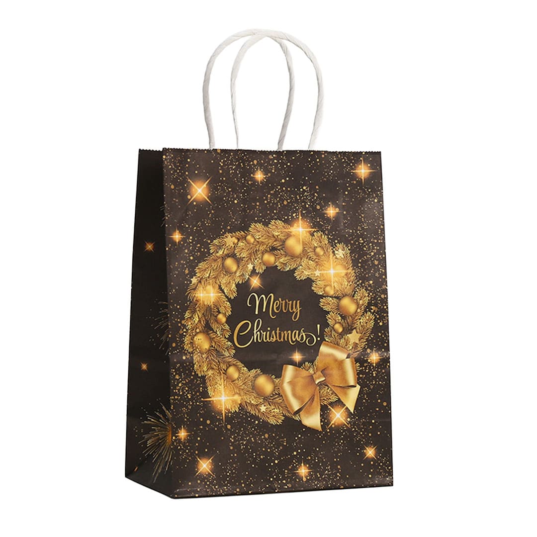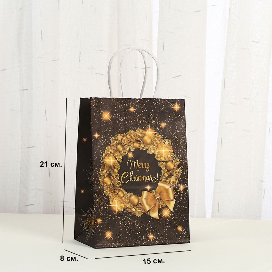 Новорічний паперовий подарунковий пакет з жовто-помаранчевим малюнком різдвяні вінки і напис "Merry Christmas", кручені білі паперові ручки і плоске дно..