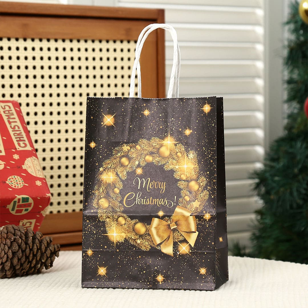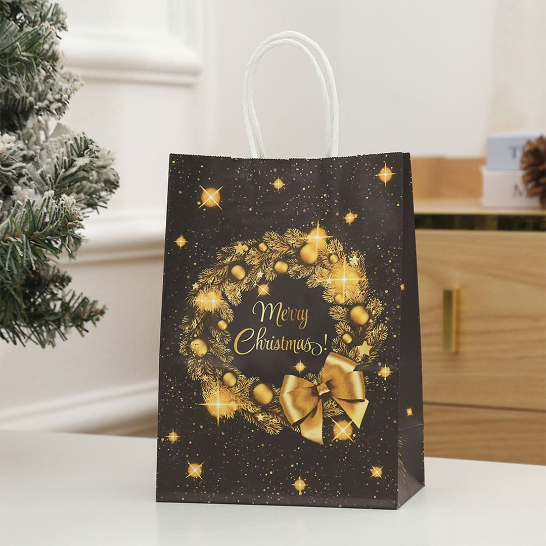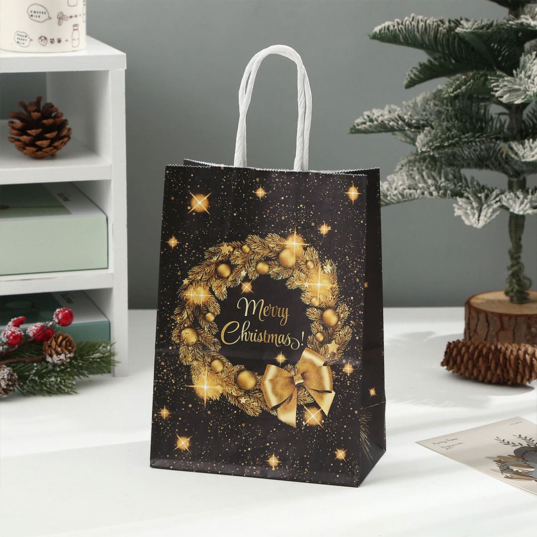 Новорічний паперовий подарунковий пакет з жовто-помаранчевим малюнком різдвяні вінки і напис "Merry Christmas", кручені білі паперові ручки і плоске дно..