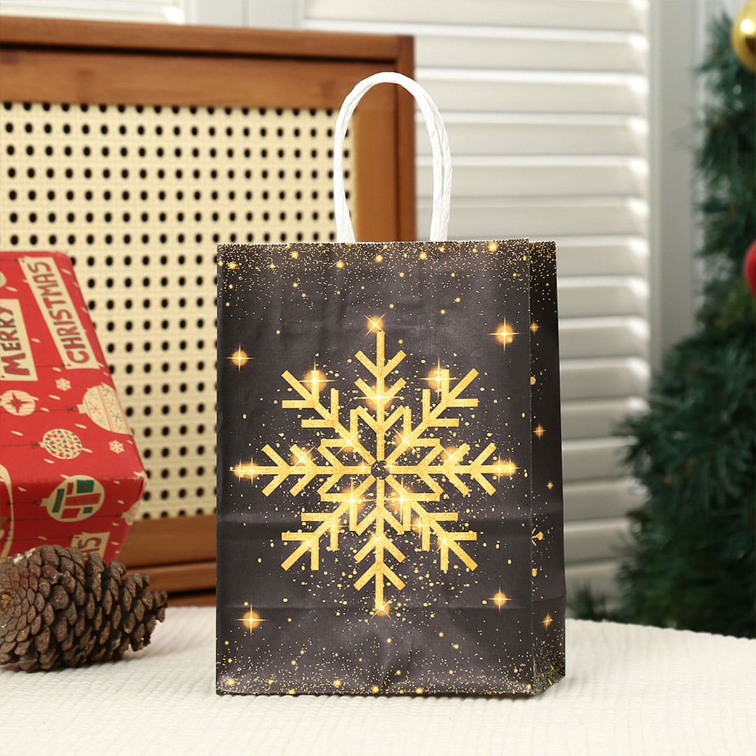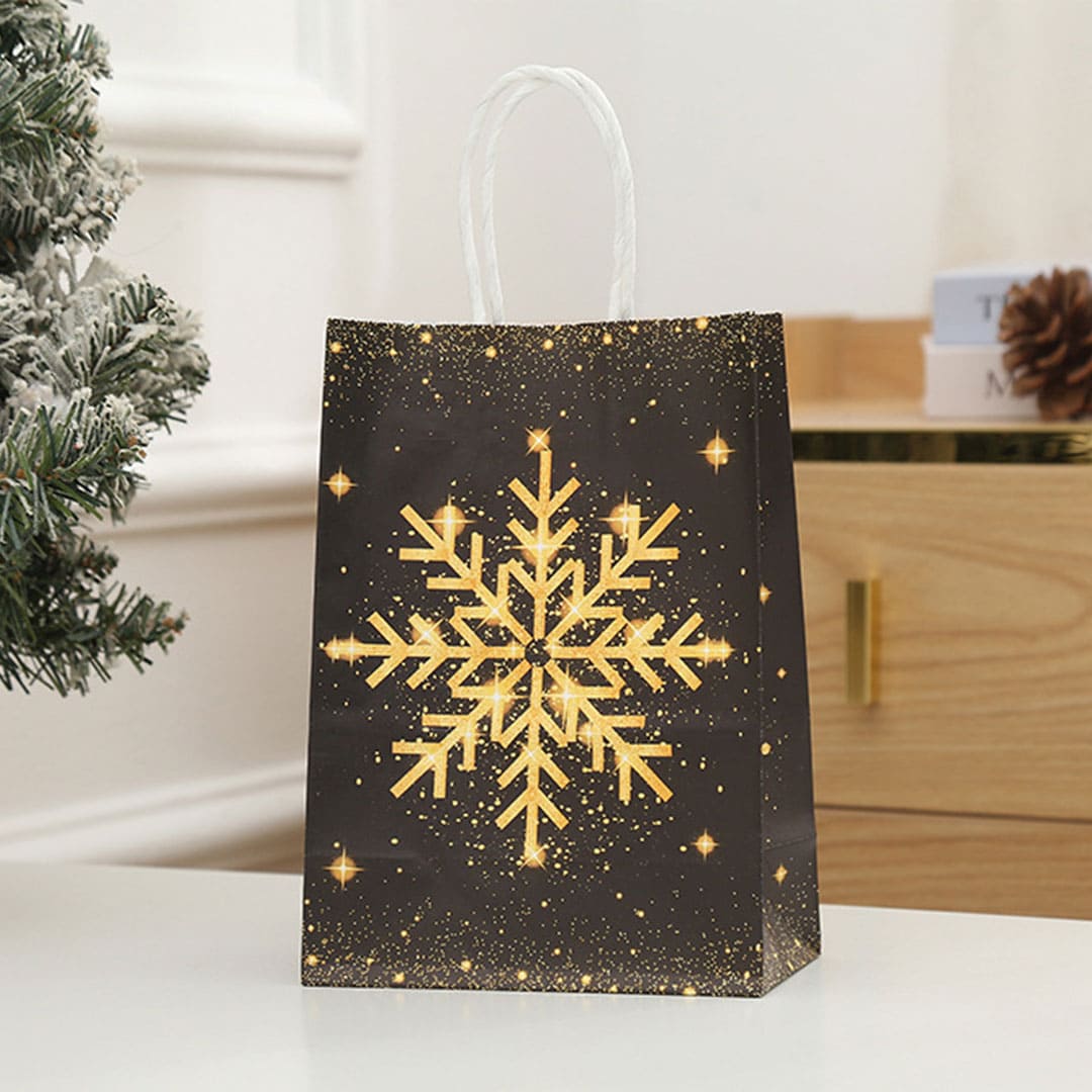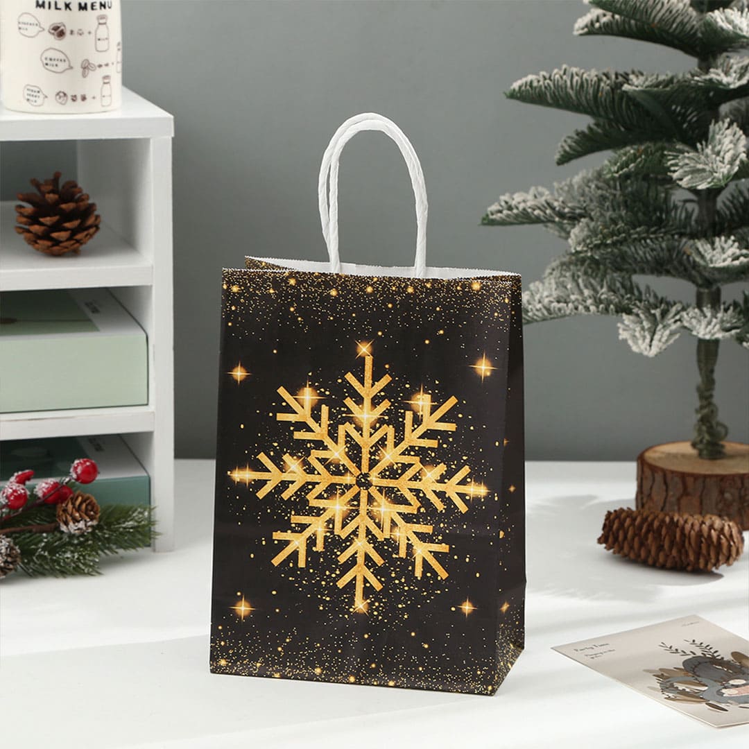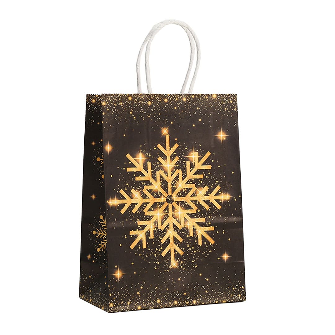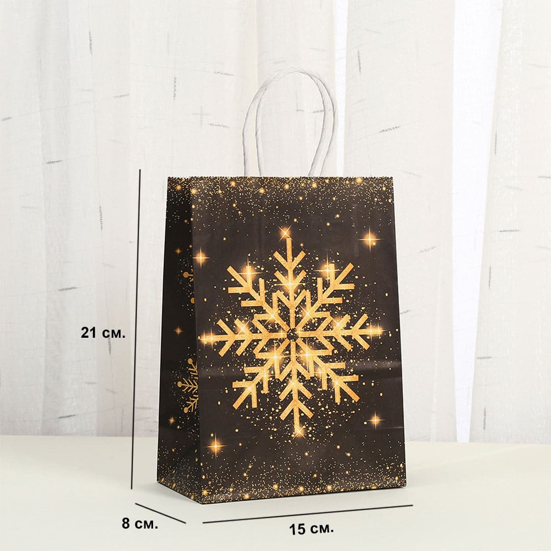 Новорічний паперовий подарунковий пакет з жовто-помаранчевим малюнком сніжинка, кручені білі паперові ручки і плоске дно..