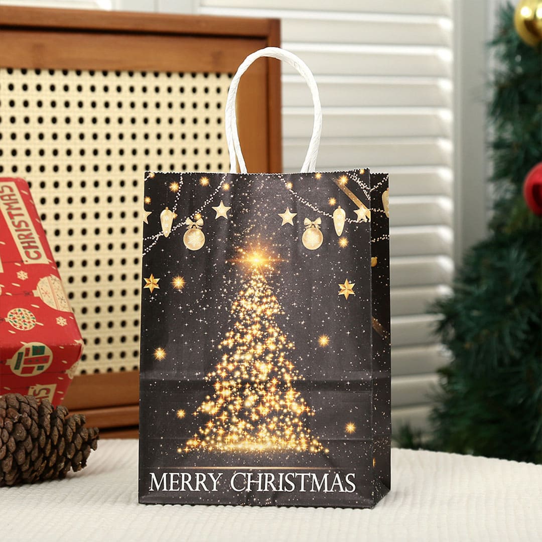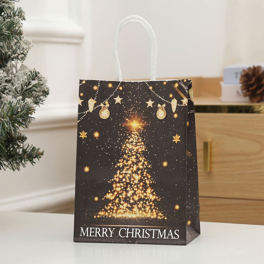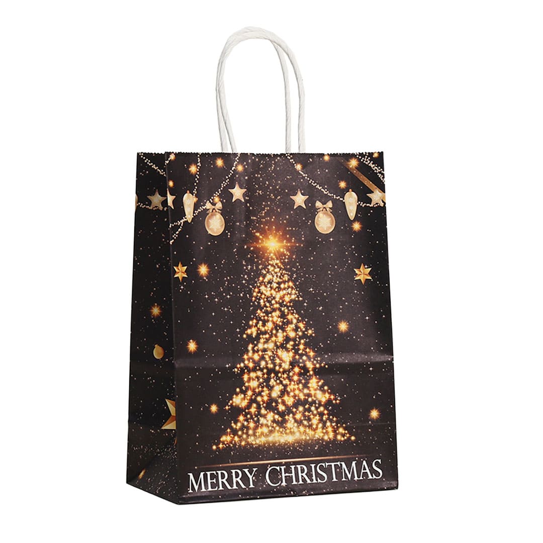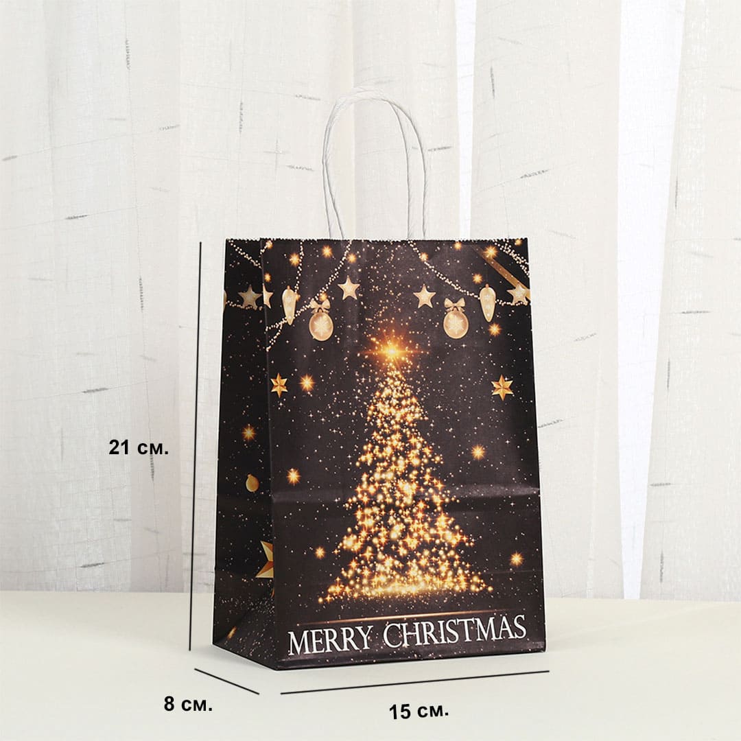 Новорічний паперовий подарунковий пакет з жовто-помаранчевим малюнком новорычна ялинка і напис "Merry Christmas", кручені білі паперові ручки і плоске дно..