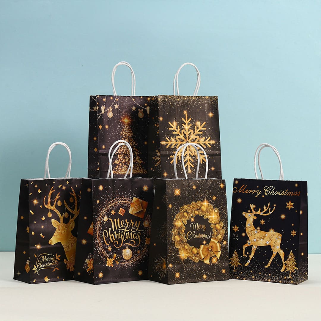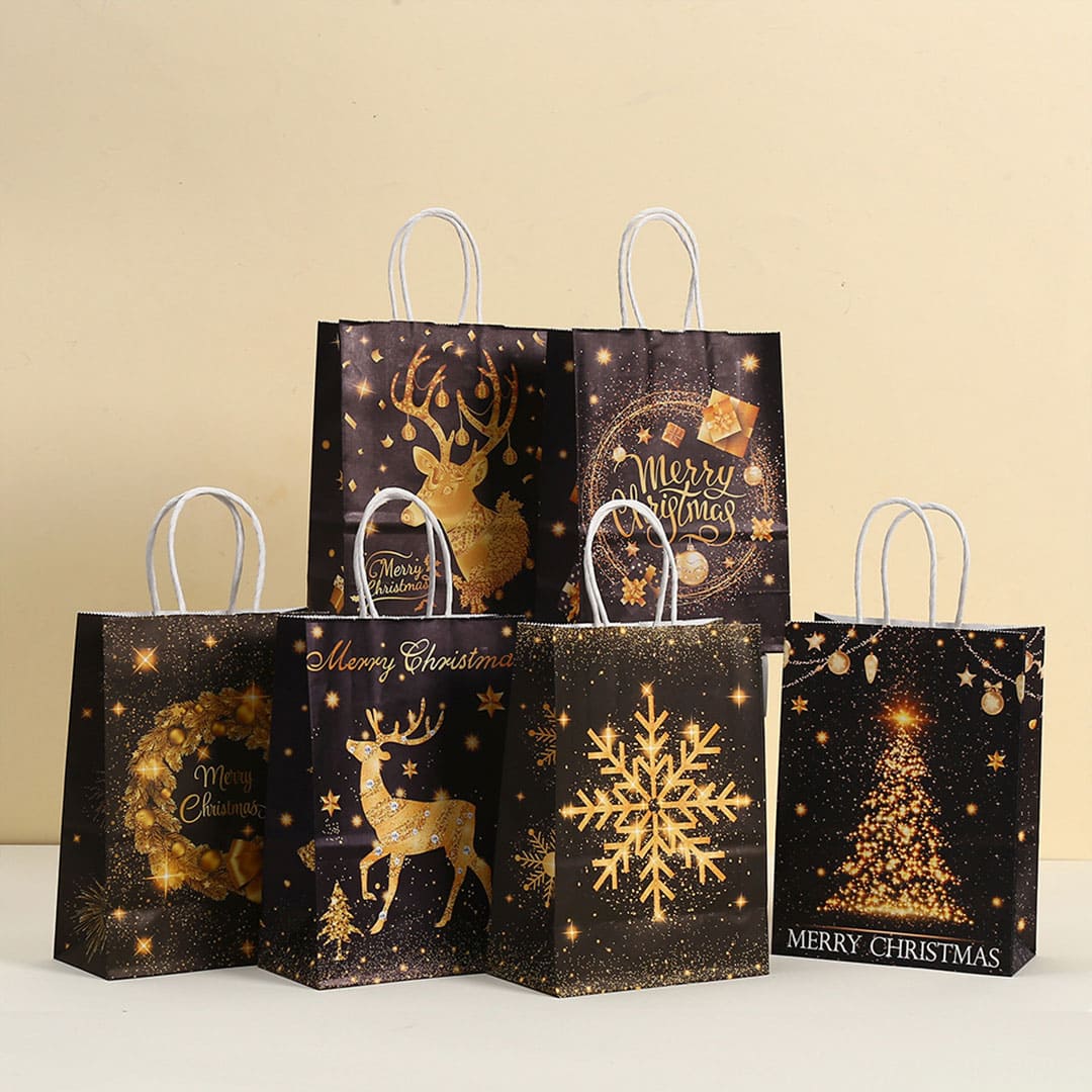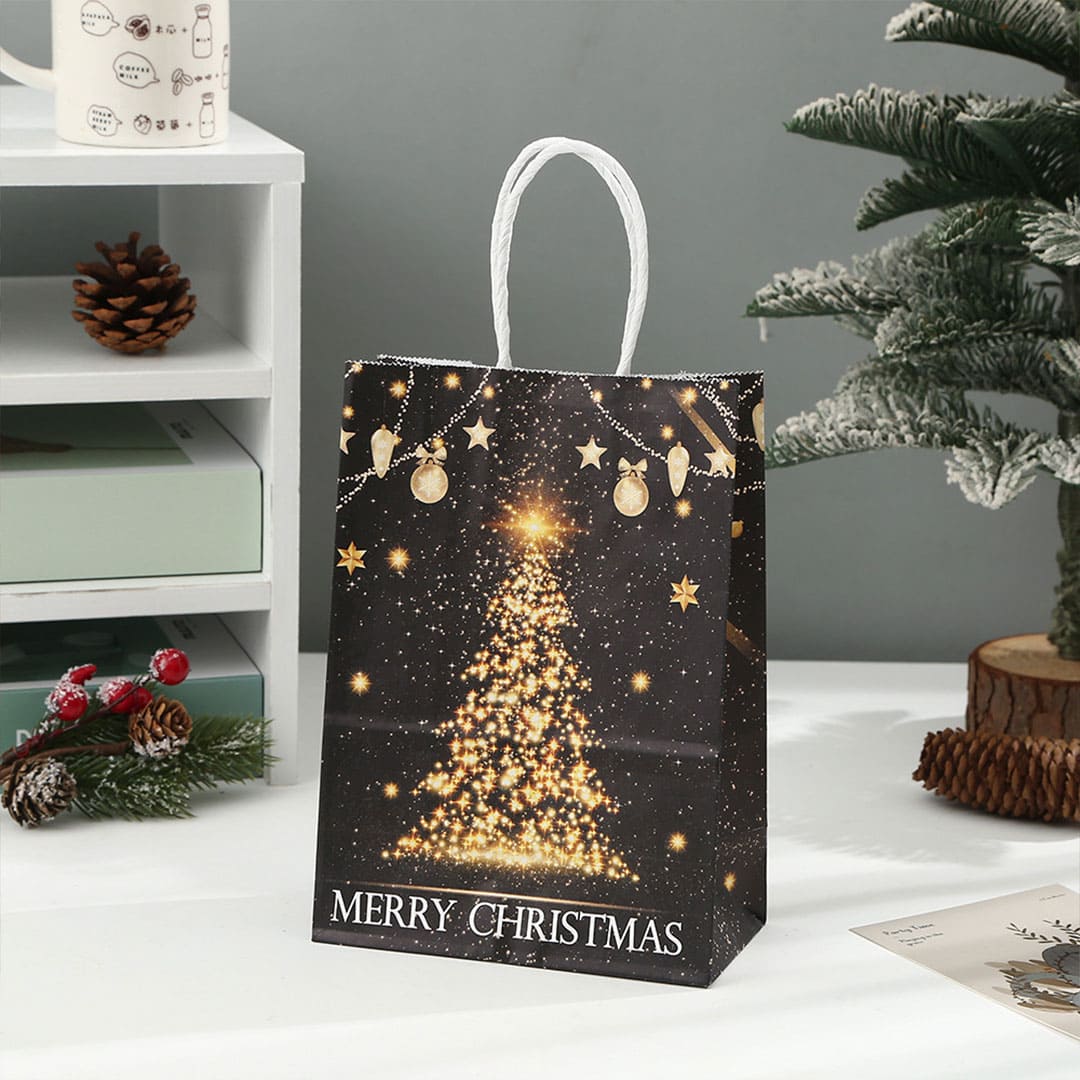 Новорічний паперовий подарунковий пакет з жовто-помаранчевим малюнком новорычна ялинка і напис "Merry Christmas", кручені білі паперові ручки і плоске дно..