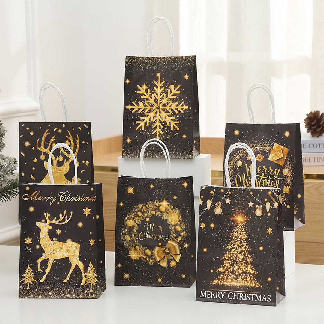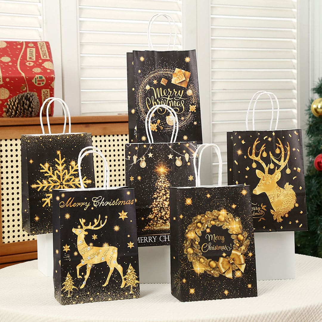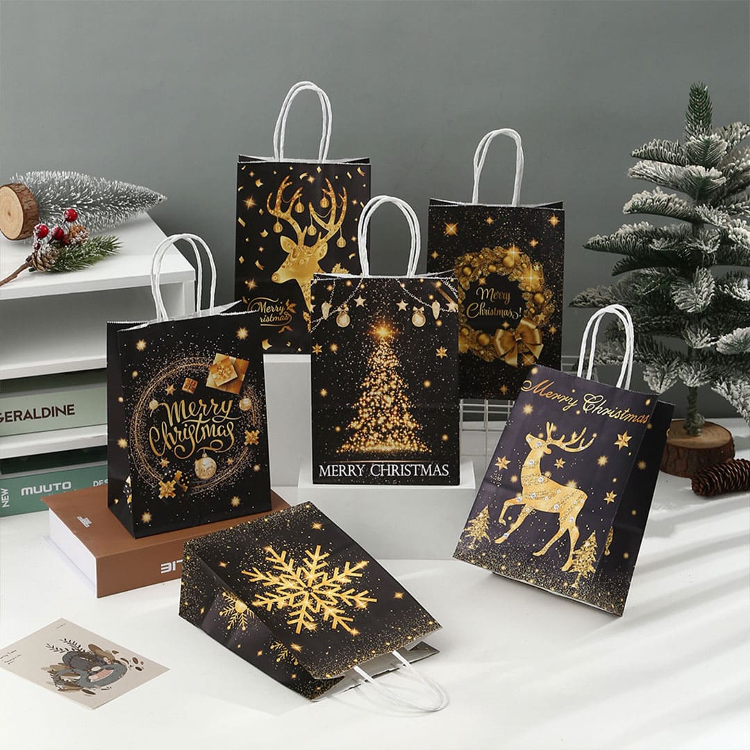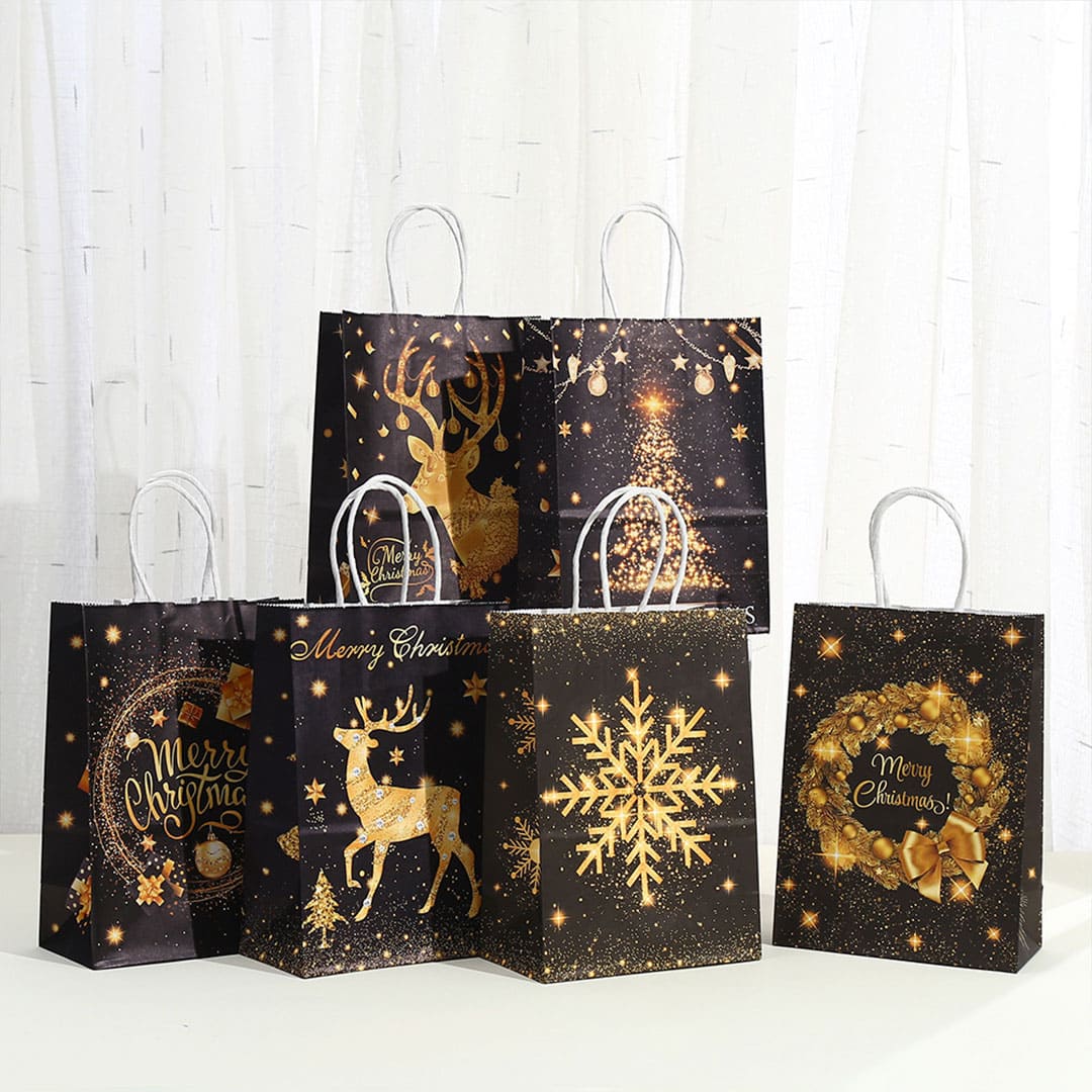 Новорічний паперовий подарунковий пакет з жовто-помаранчевим малюнком новорычна ялинка і напис "Merry Christmas", кручені білі паперові ручки і плоске дно..