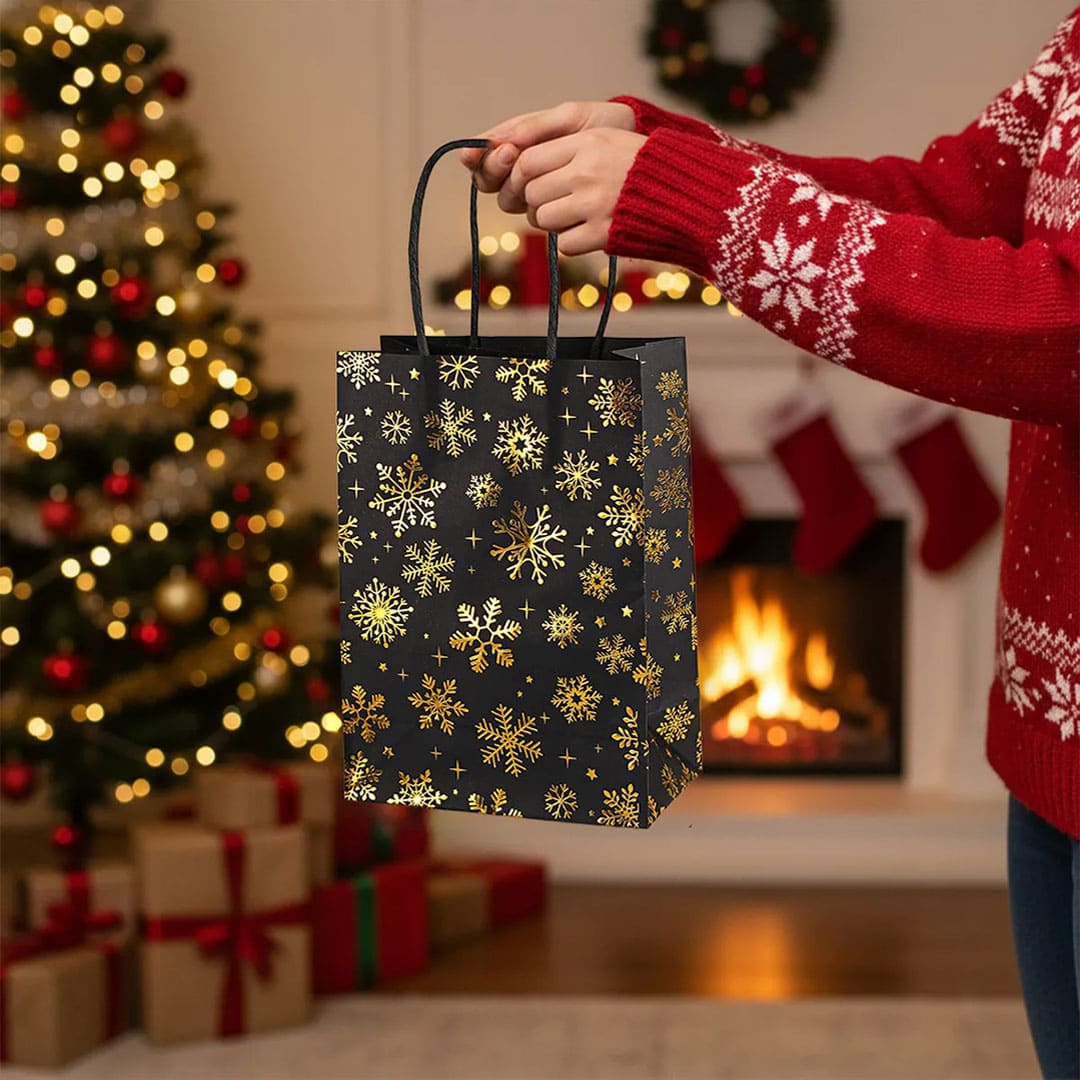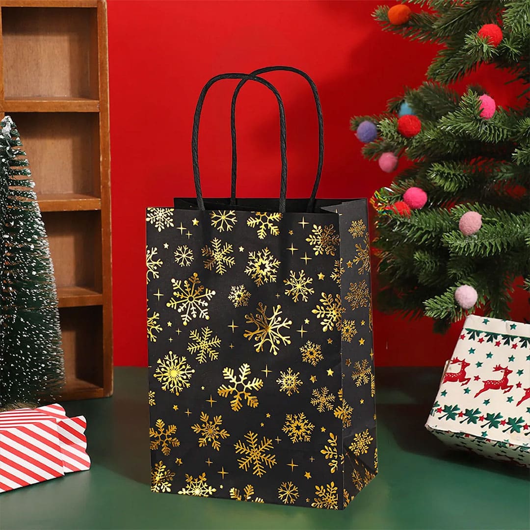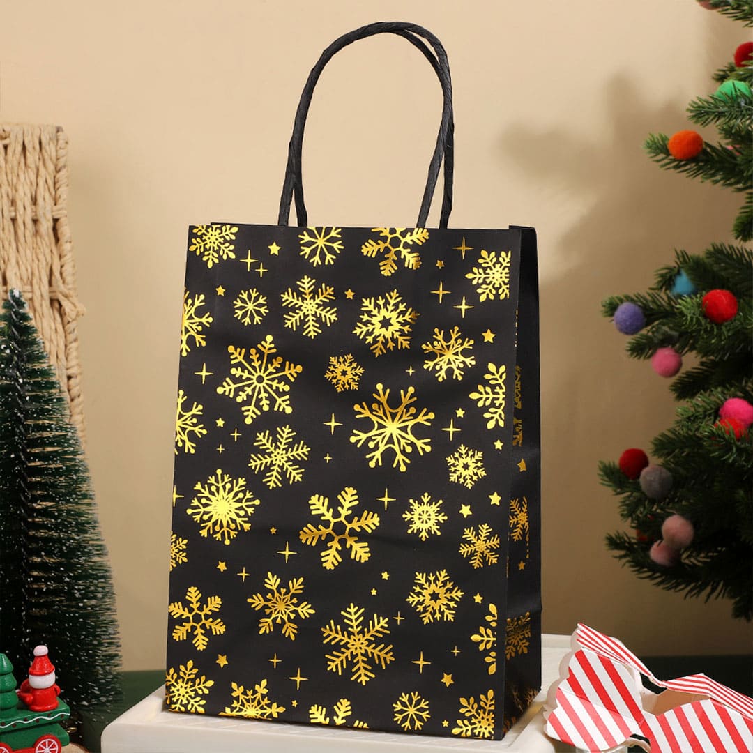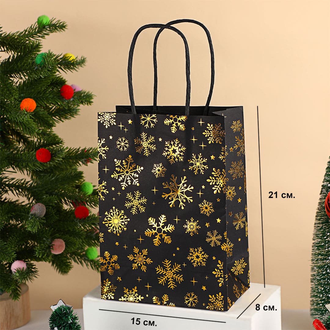 Новорічний паперовий подарунковий пакет із золотистим малюнком сніжинки, кручені паперові ручки та плоске дно.