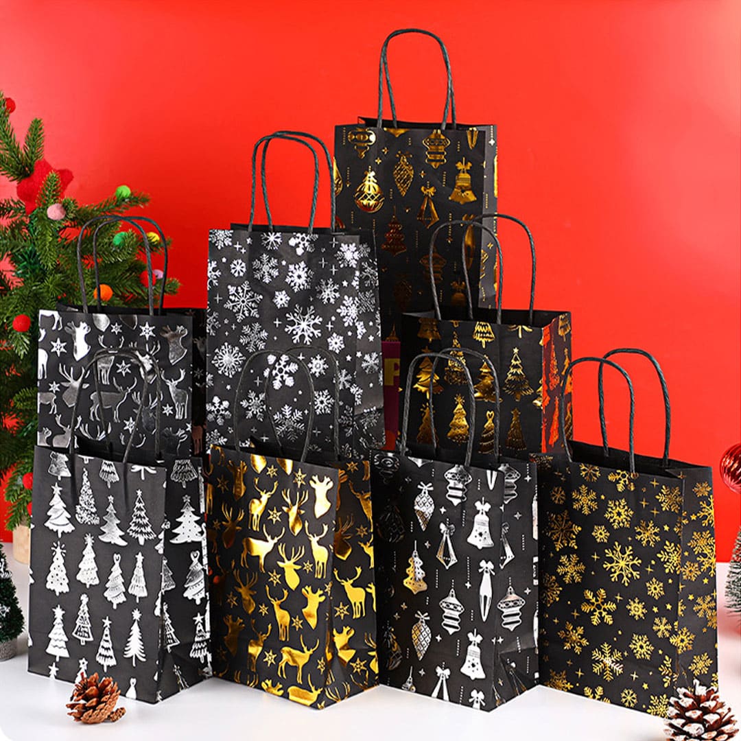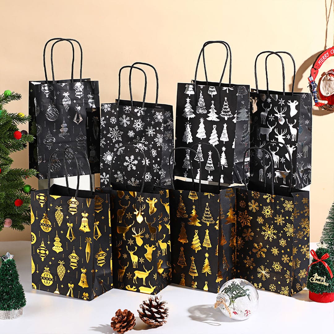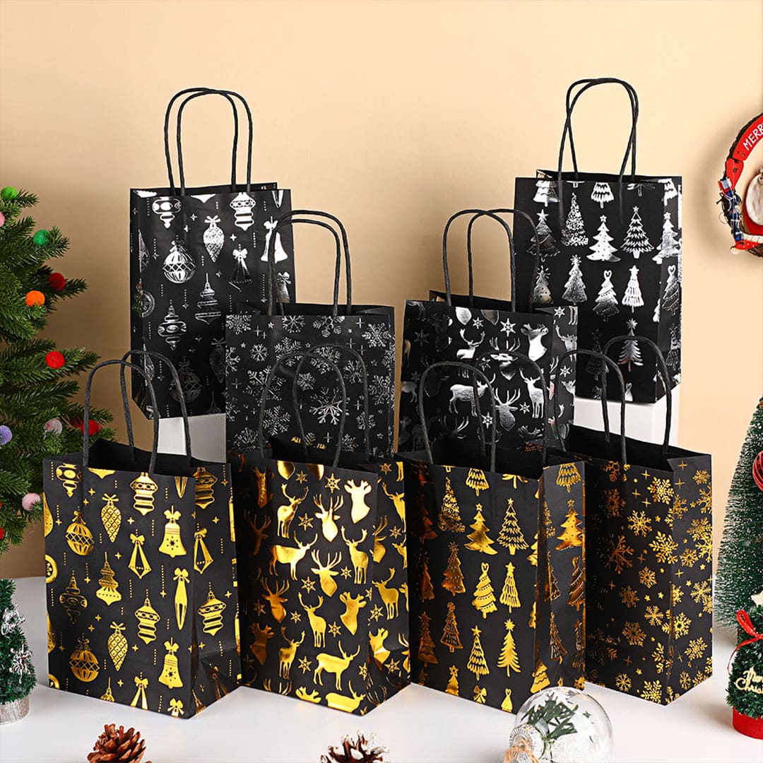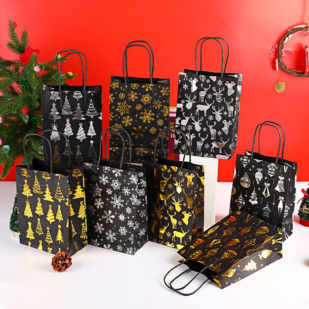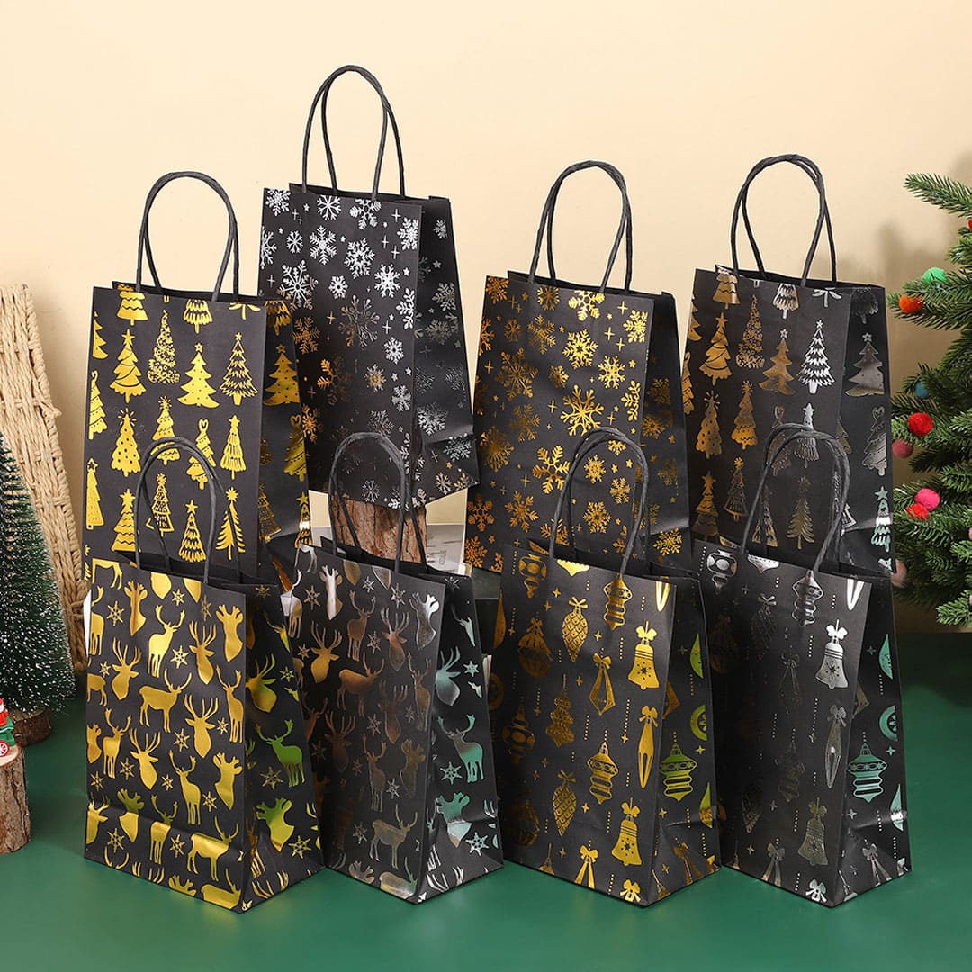 Новорічний паперовий подарунковий пакет із золотистим малюнком сніжинки, кручені паперові ручки та плоске дно.