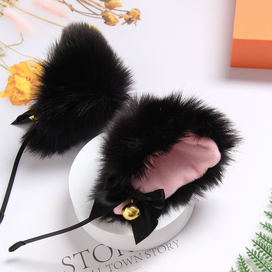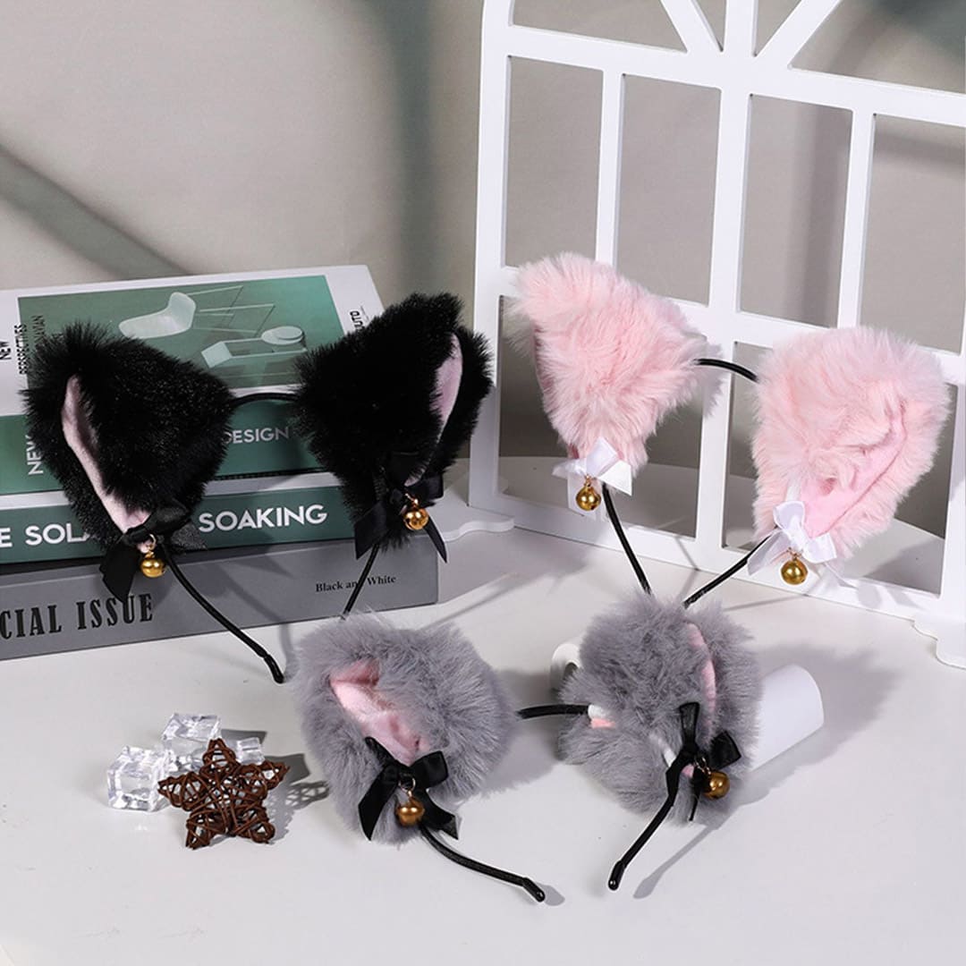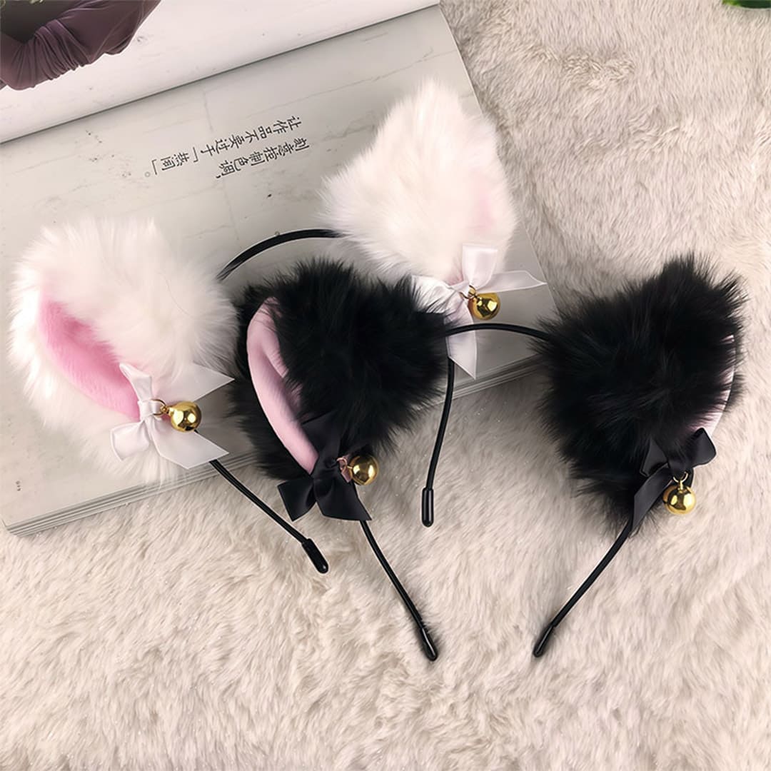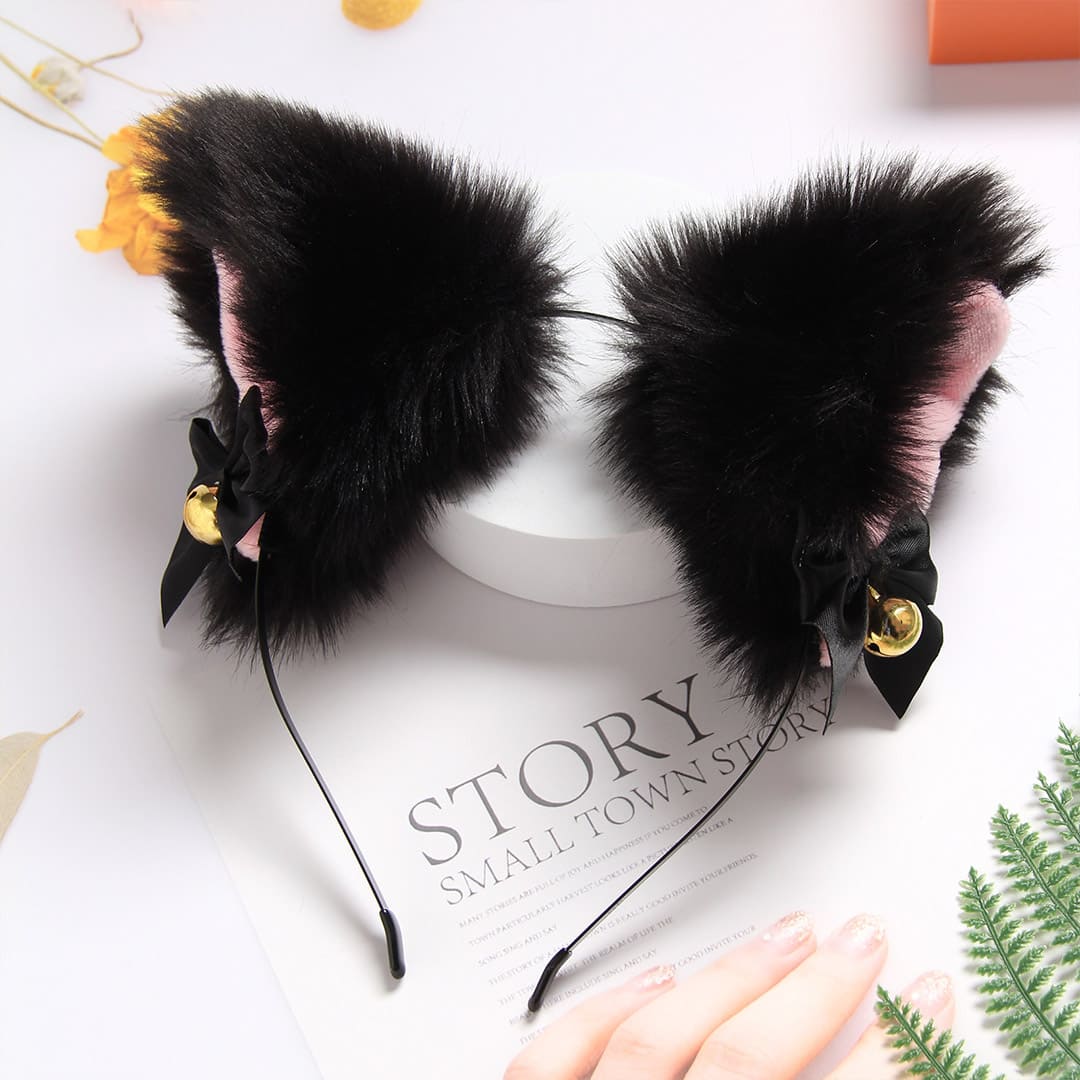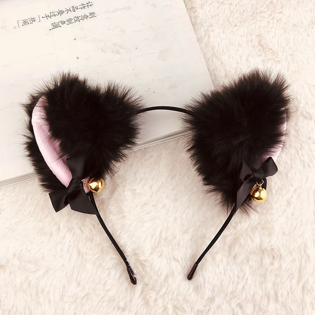 Обруч на голову обтягнутий тканиною з хутряними котячими вушками з атласними бантиками та дзвіночками, всередині вуха рожевий велюр.
