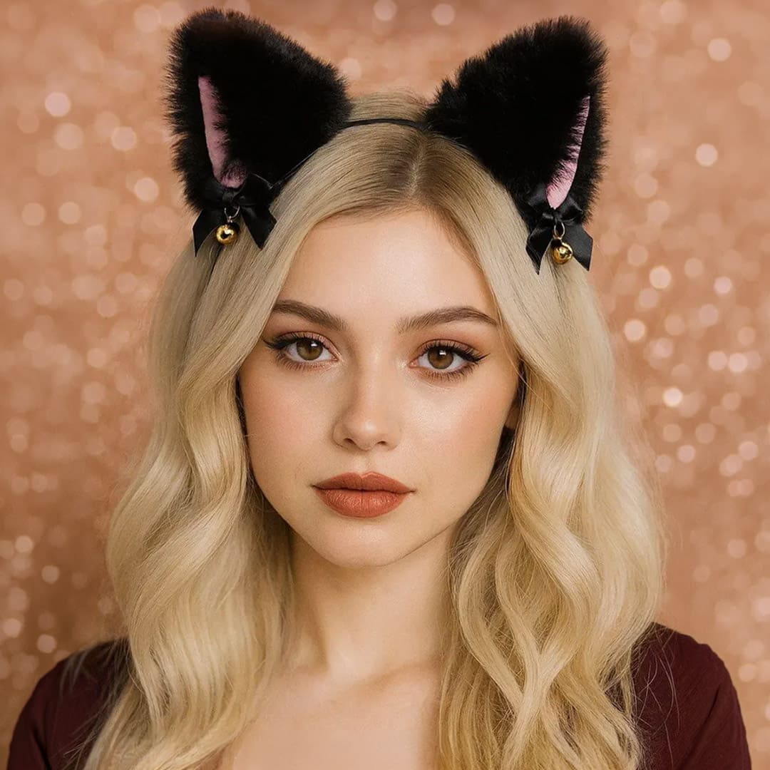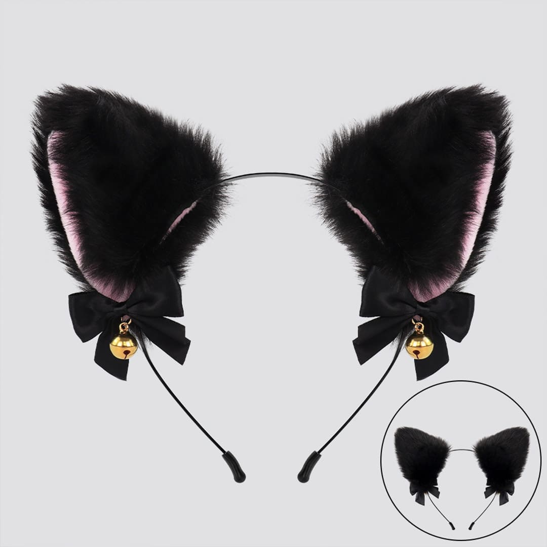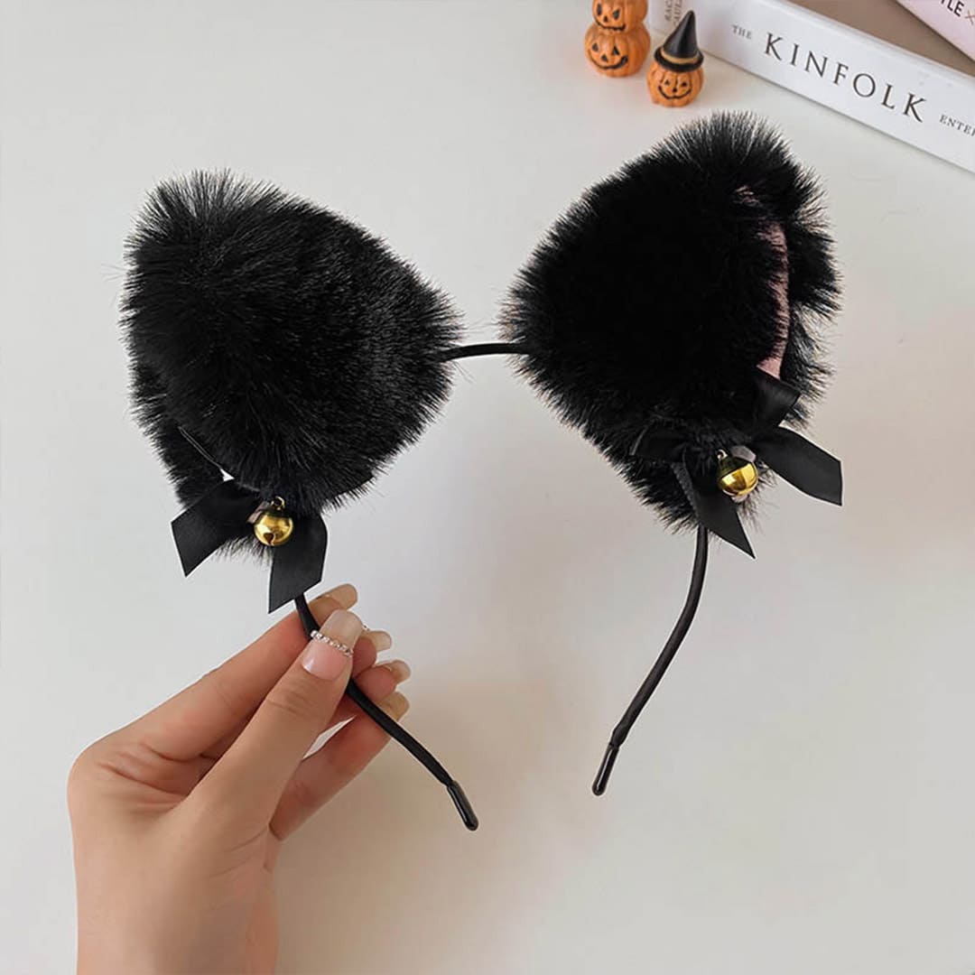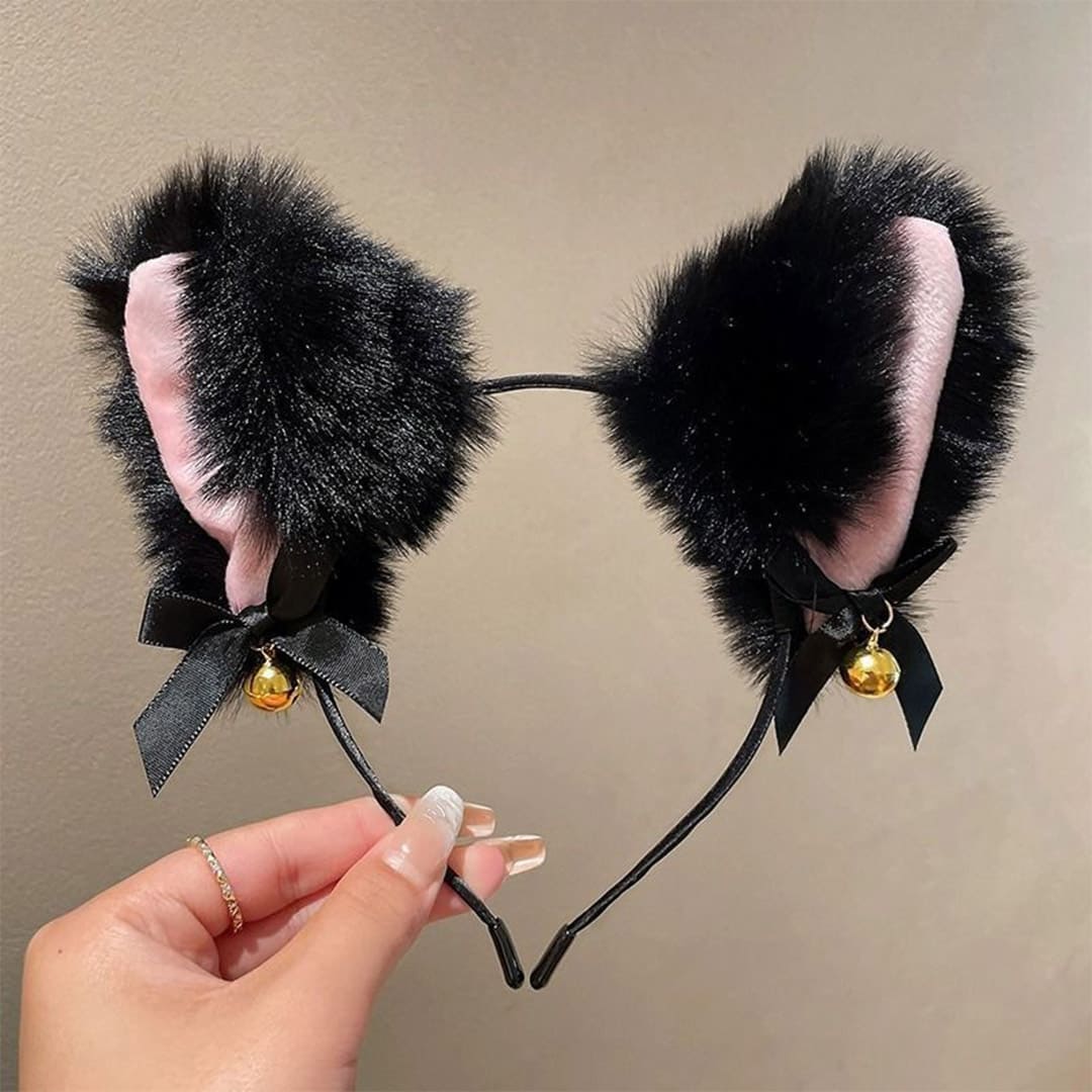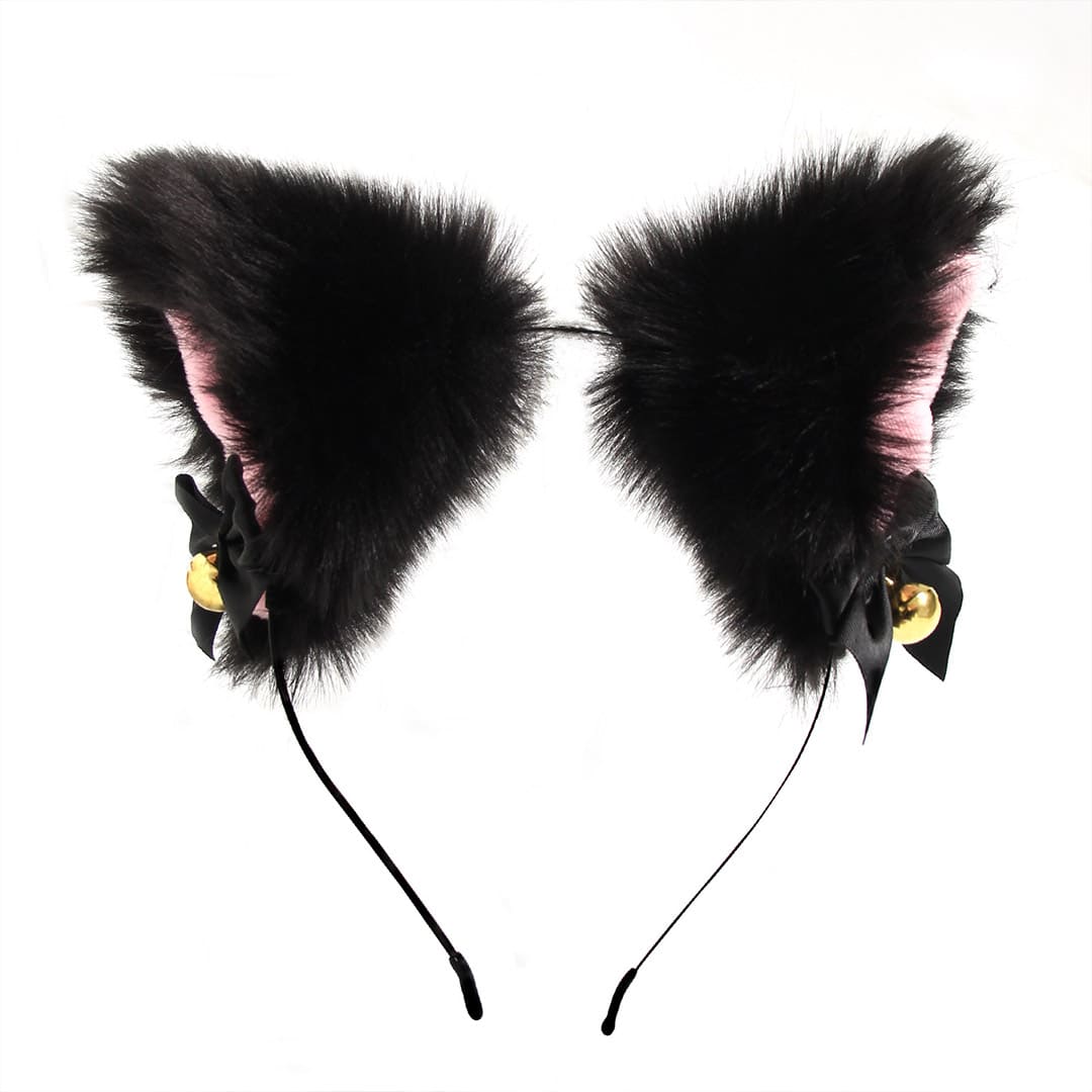 Обруч на голову обтягнутий тканиною з хутряними котячими вушками з атласними бантиками та дзвіночками, всередині вуха рожевий велюр.