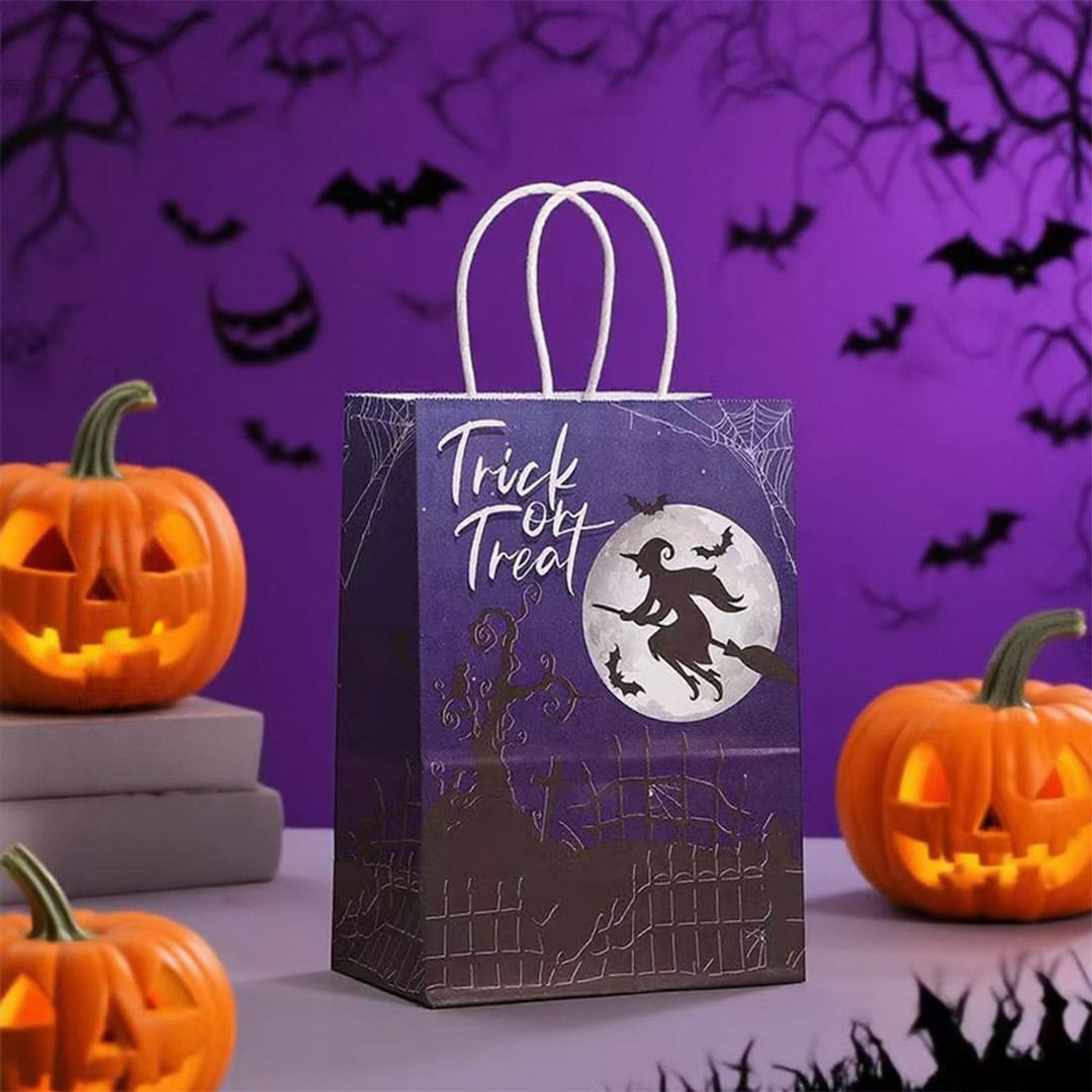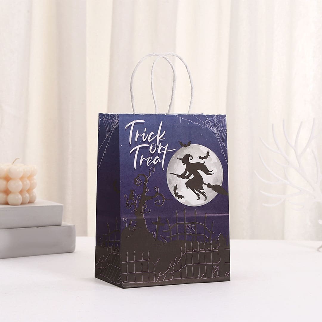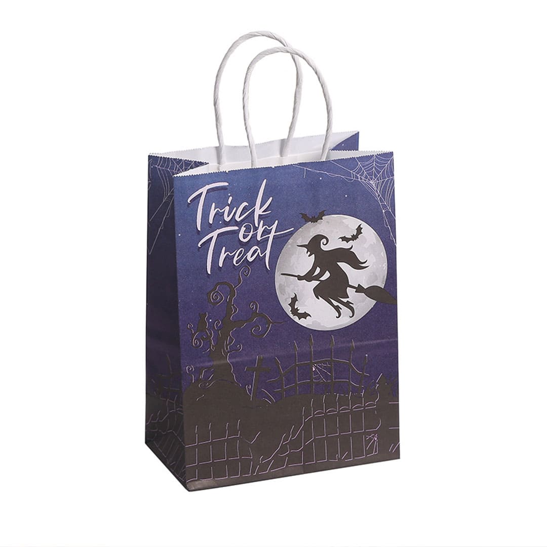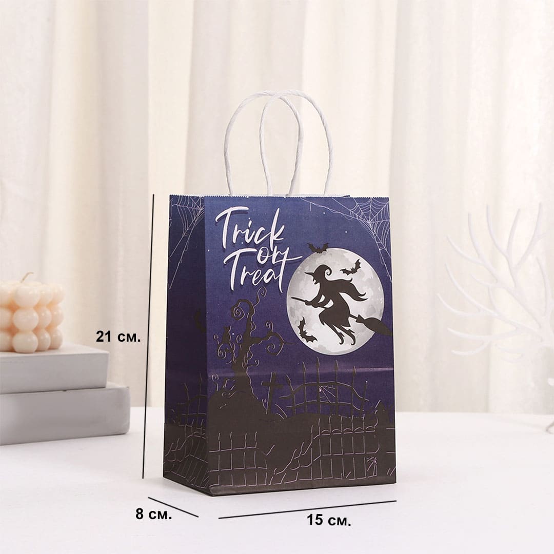 Тематичний паперовий пакет на Halloween (Хелловін) з малюнком і надписом "Trick or treat" (Солодощі або капость), виті білі паперові ручки і плоске дно.