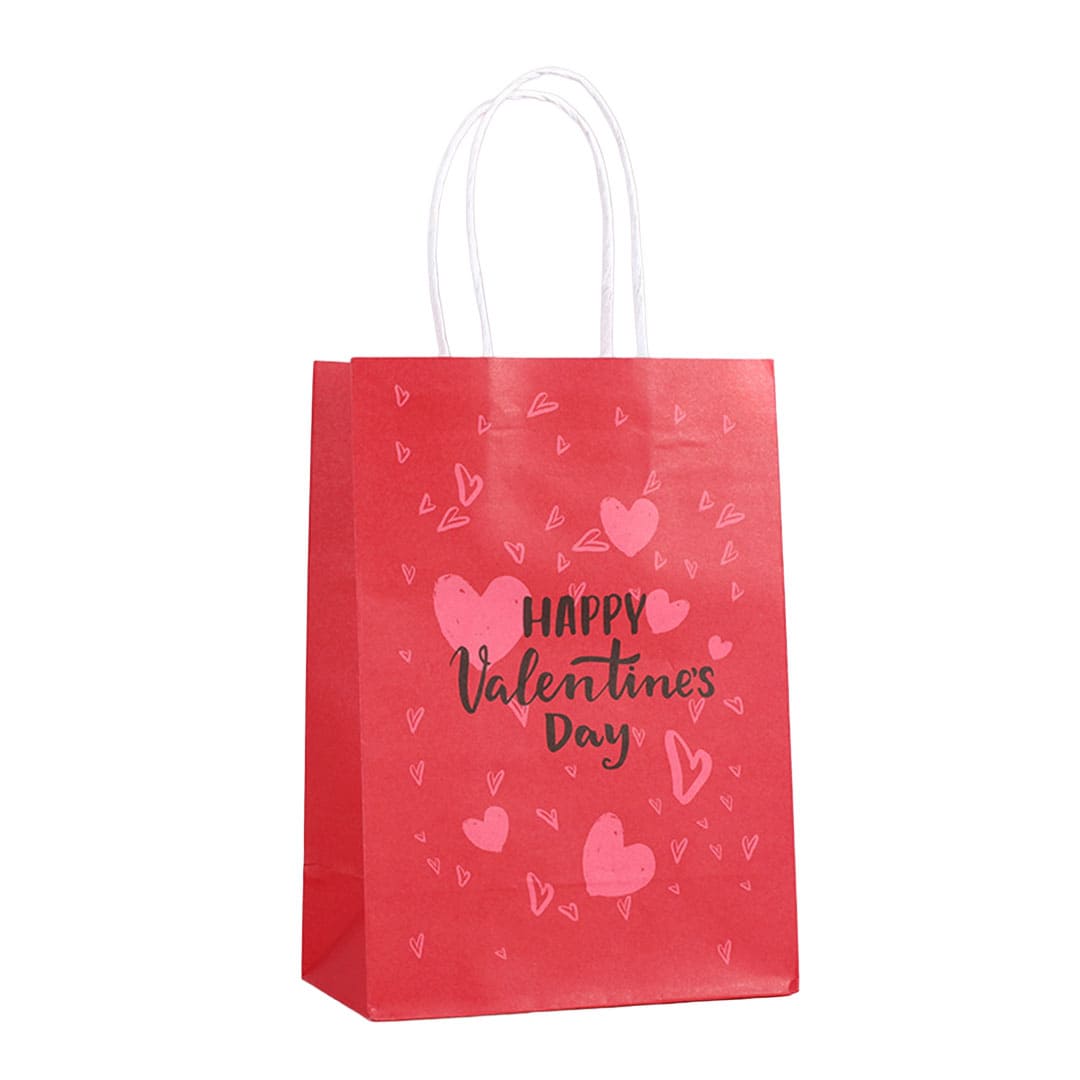Червоний паперовий подарунковий пакет з написом "Happy Valentine's Day" та малюнком серця, білі виті паперові ручки та плоске дно.