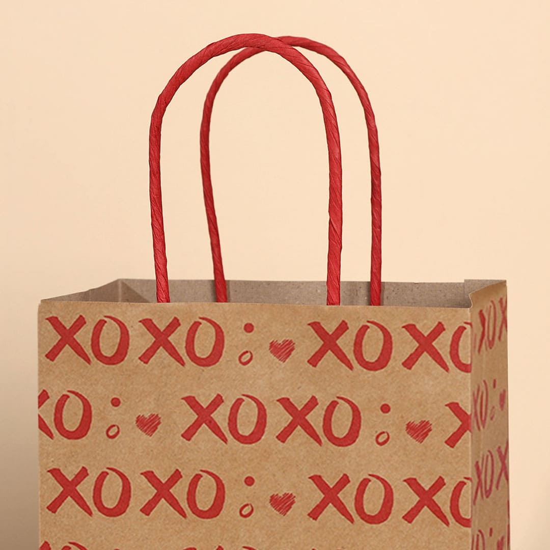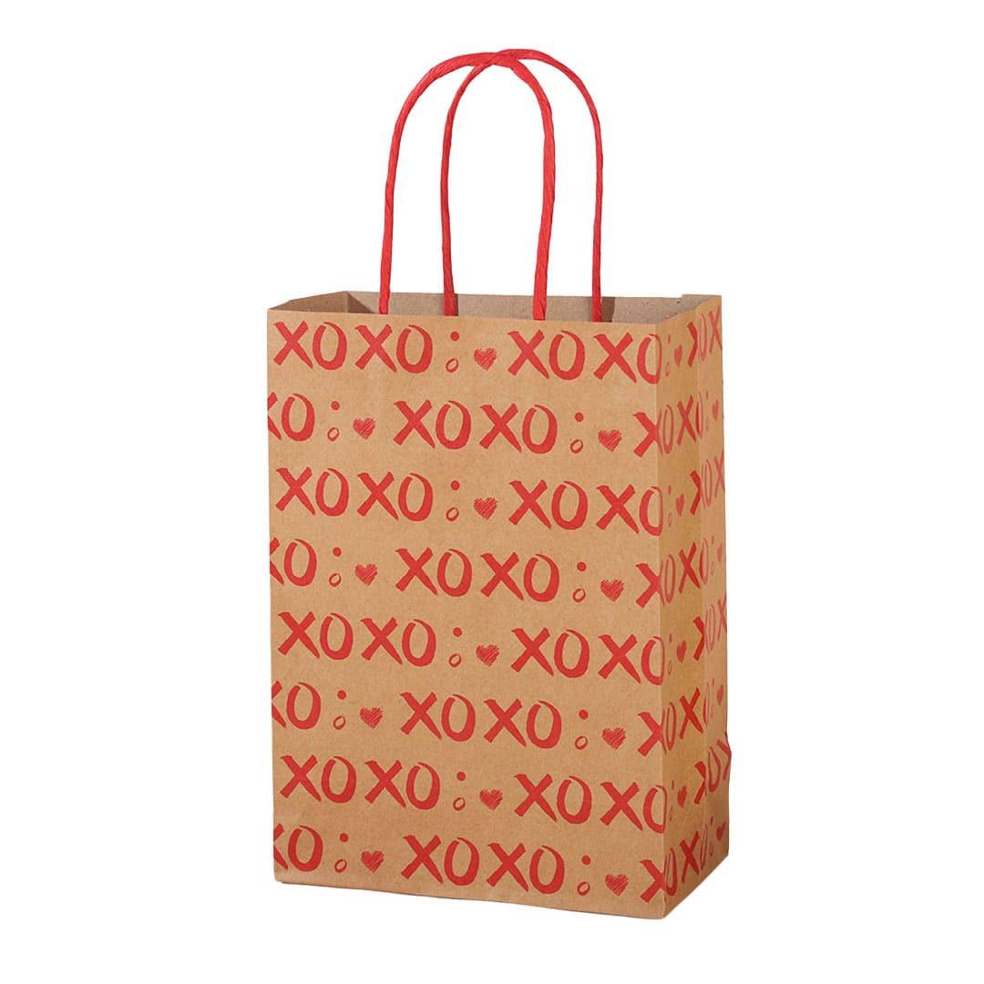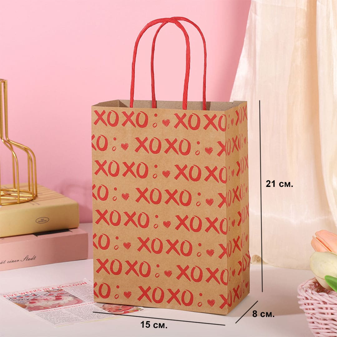 Паперовий подарунковий крафт-пакет з червоними написами "XoXo" (означає "цілу і обіймаю") та малюнком серця, червоні кручені паперові ручки та плоске дно.