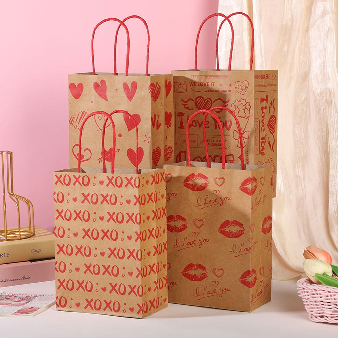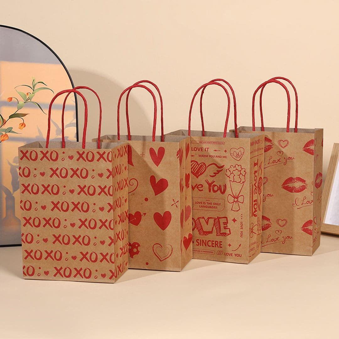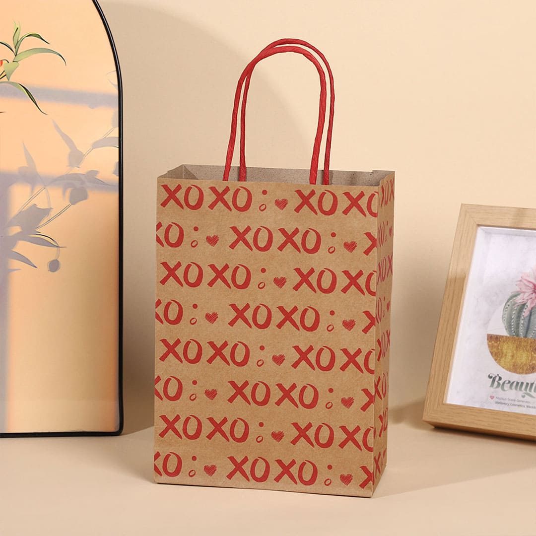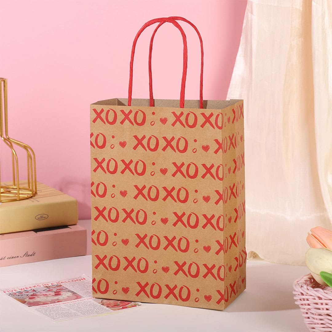 Паперовий подарунковий крафт-пакет з червоними написами "XoXo" (означає "цілу і обіймаю") та малюнком серця, червоні кручені паперові ручки та плоске дно.