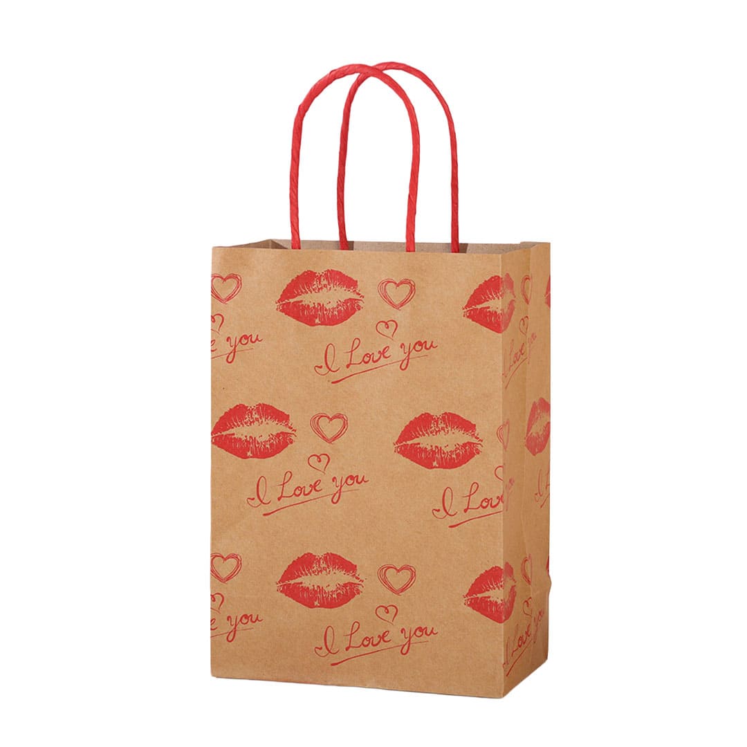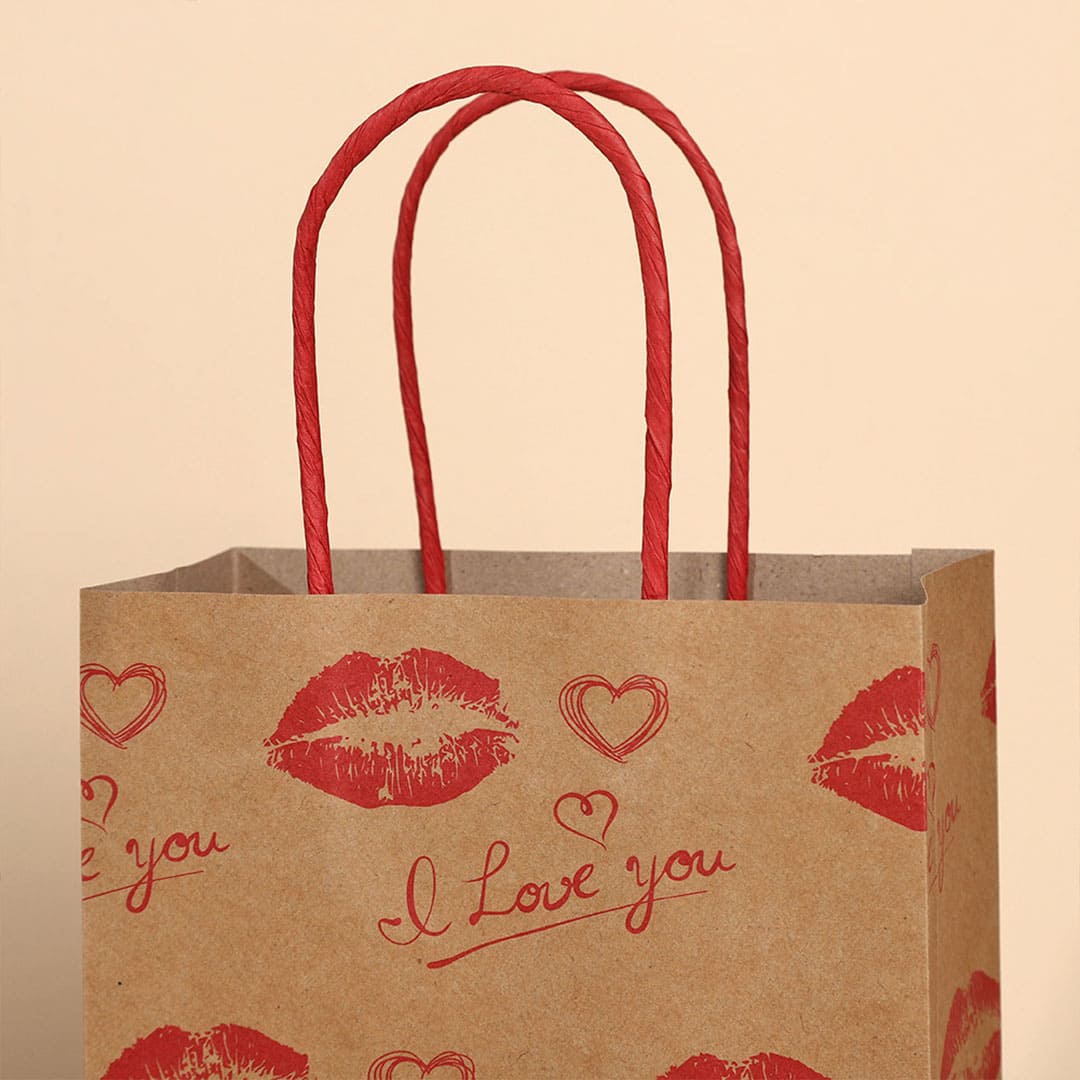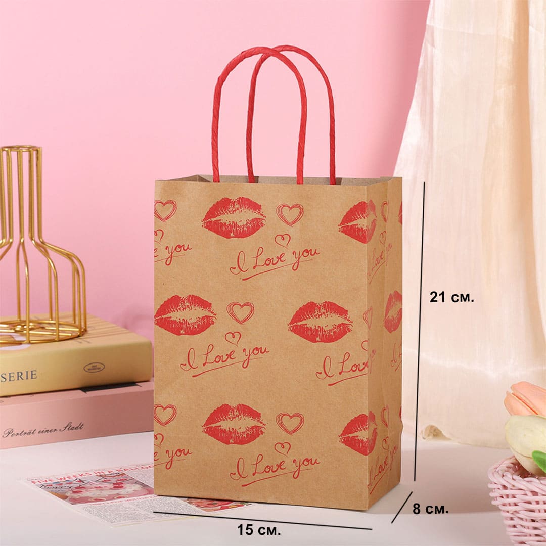 Паперовий подарунковий крафт-пакет з червоними написами "I love You" і малюнок сліду від поцілунку, червоні кручені паперові ручки і плоске дно.