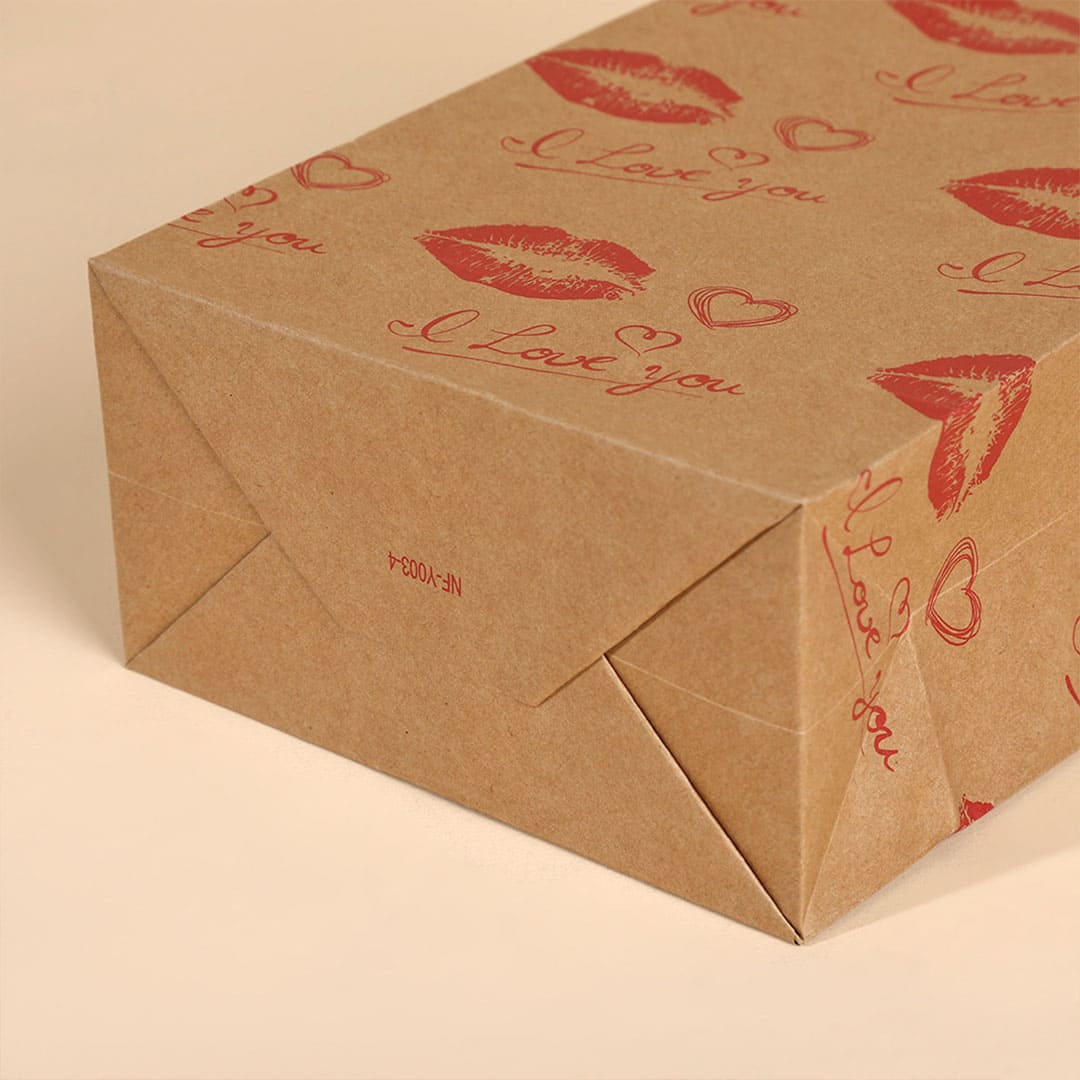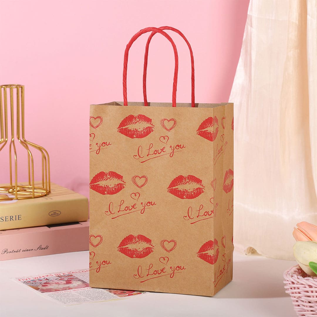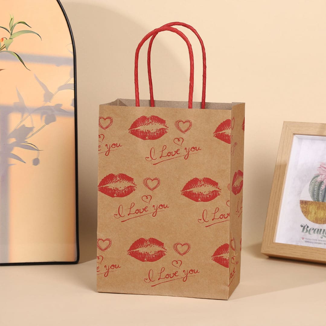 Паперовий подарунковий крафт-пакет з червоними написами "I love You" і малюнок сліду від поцілунку, червоні кручені паперові ручки і плоске дно.