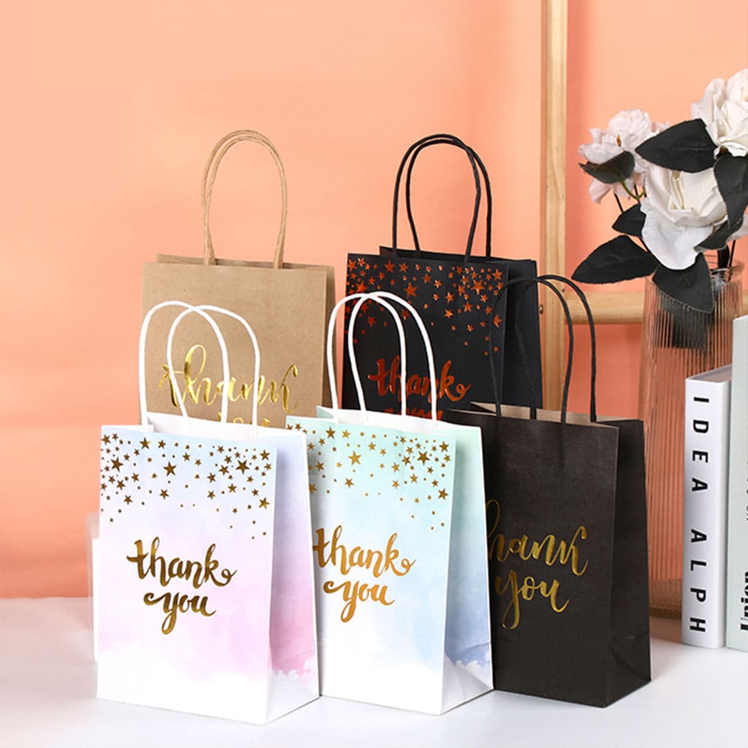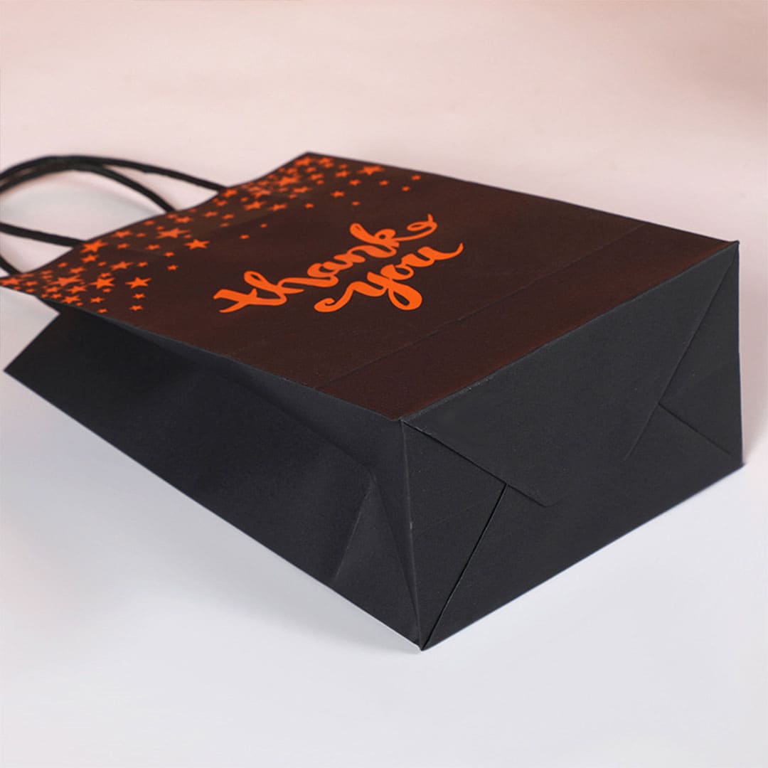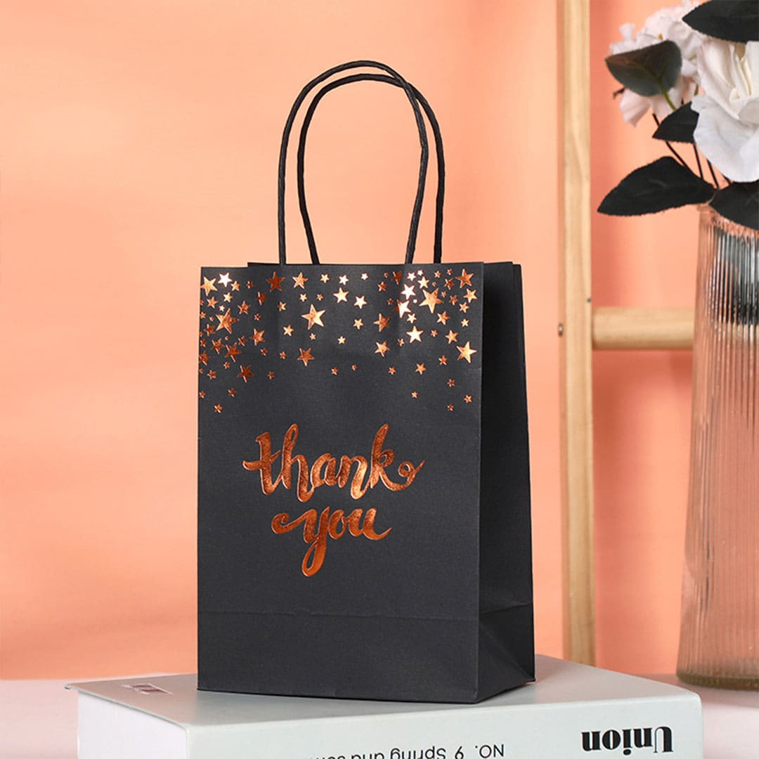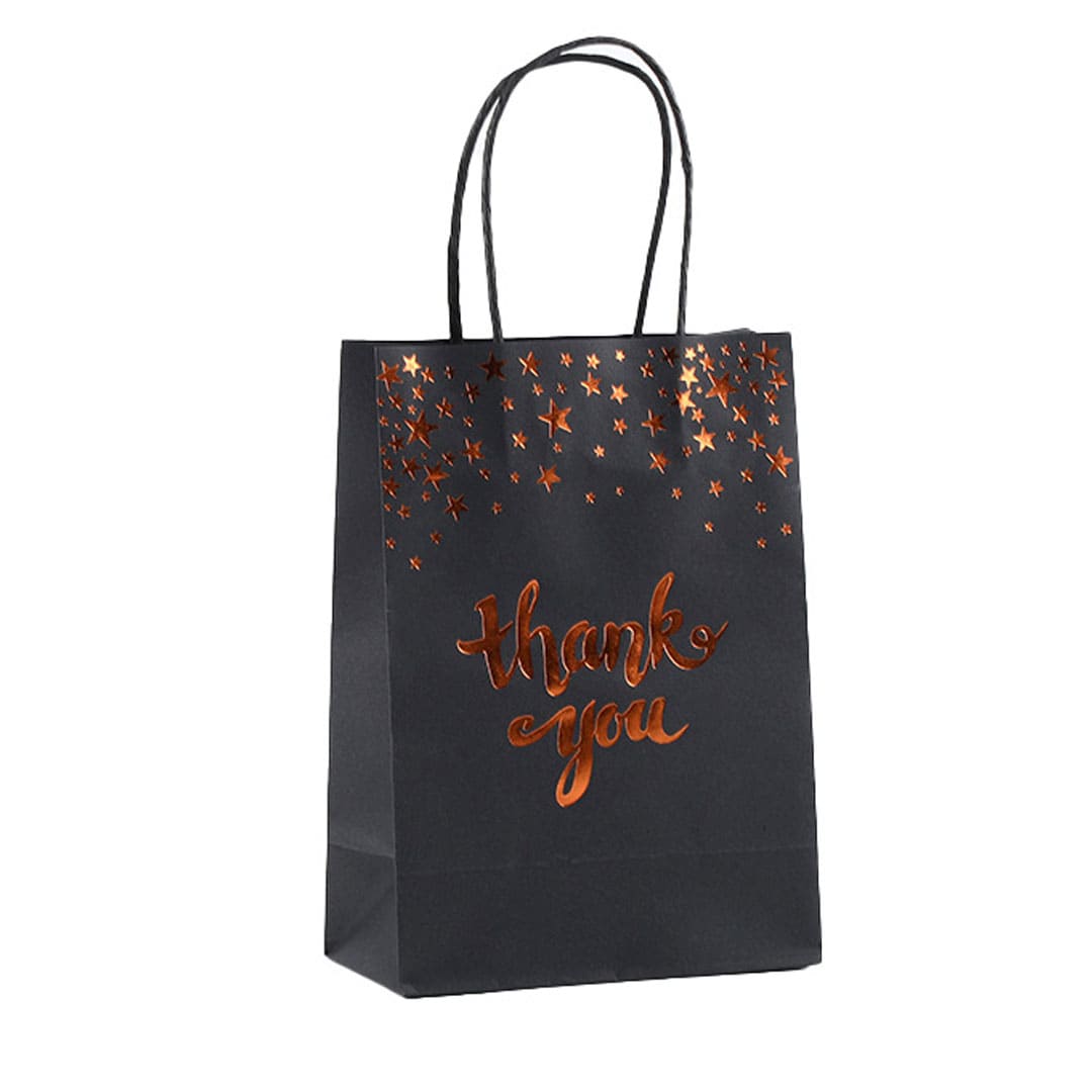 Паперовий подарунковий пакет із золотистим написом "Thank you" (дякую тобі) та малюнком зірки, кручені паперові ручки та плоске дно.