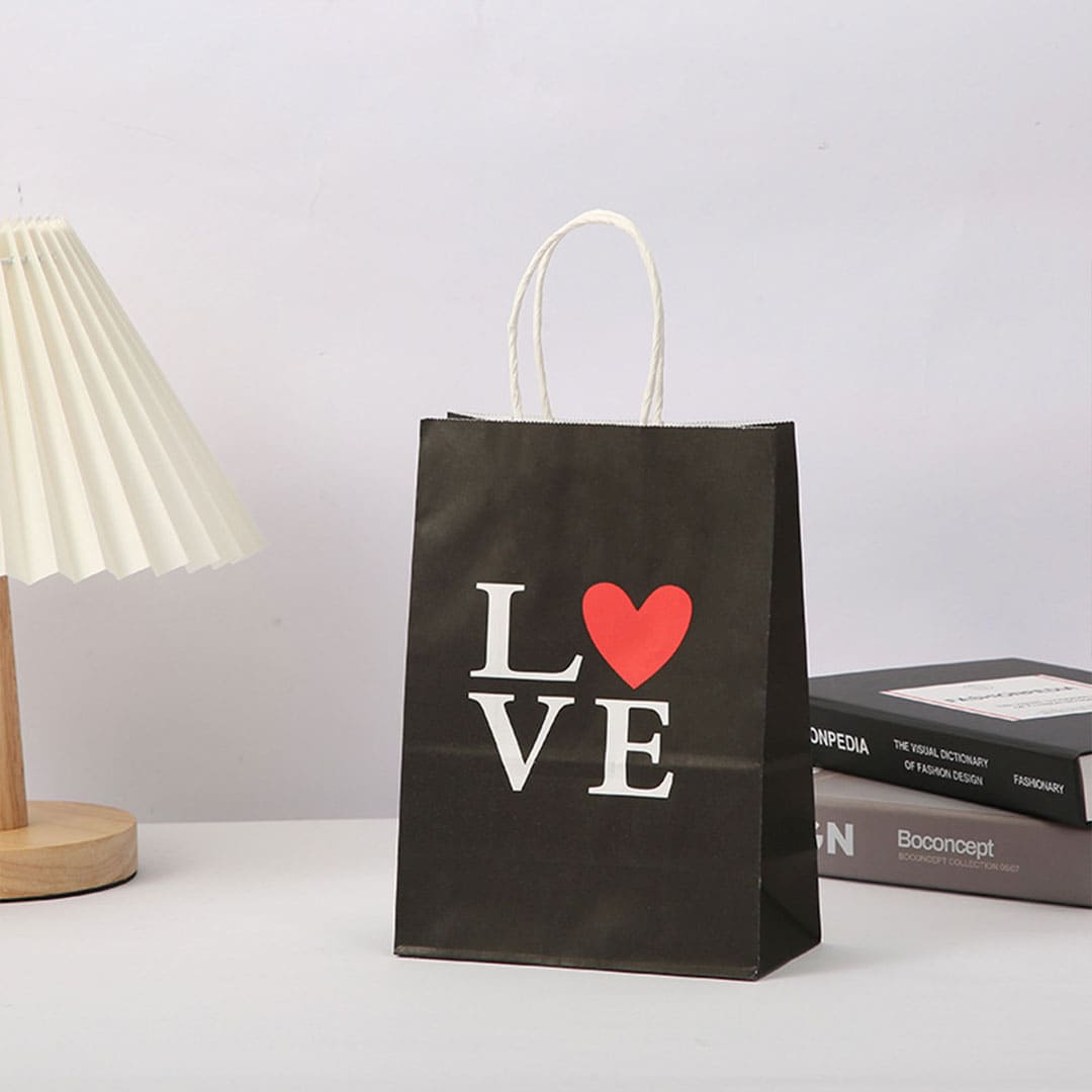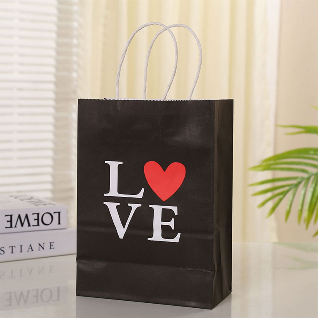 Чорний паперовий подарунковий пакет з написом "Love", білі виті паперові ручки та плоске дно.