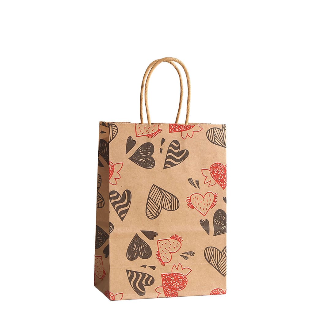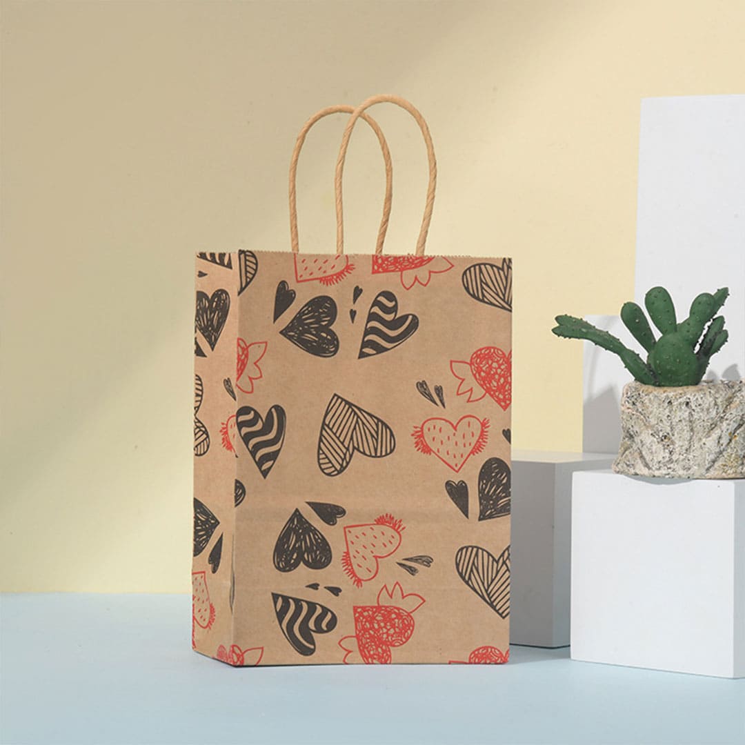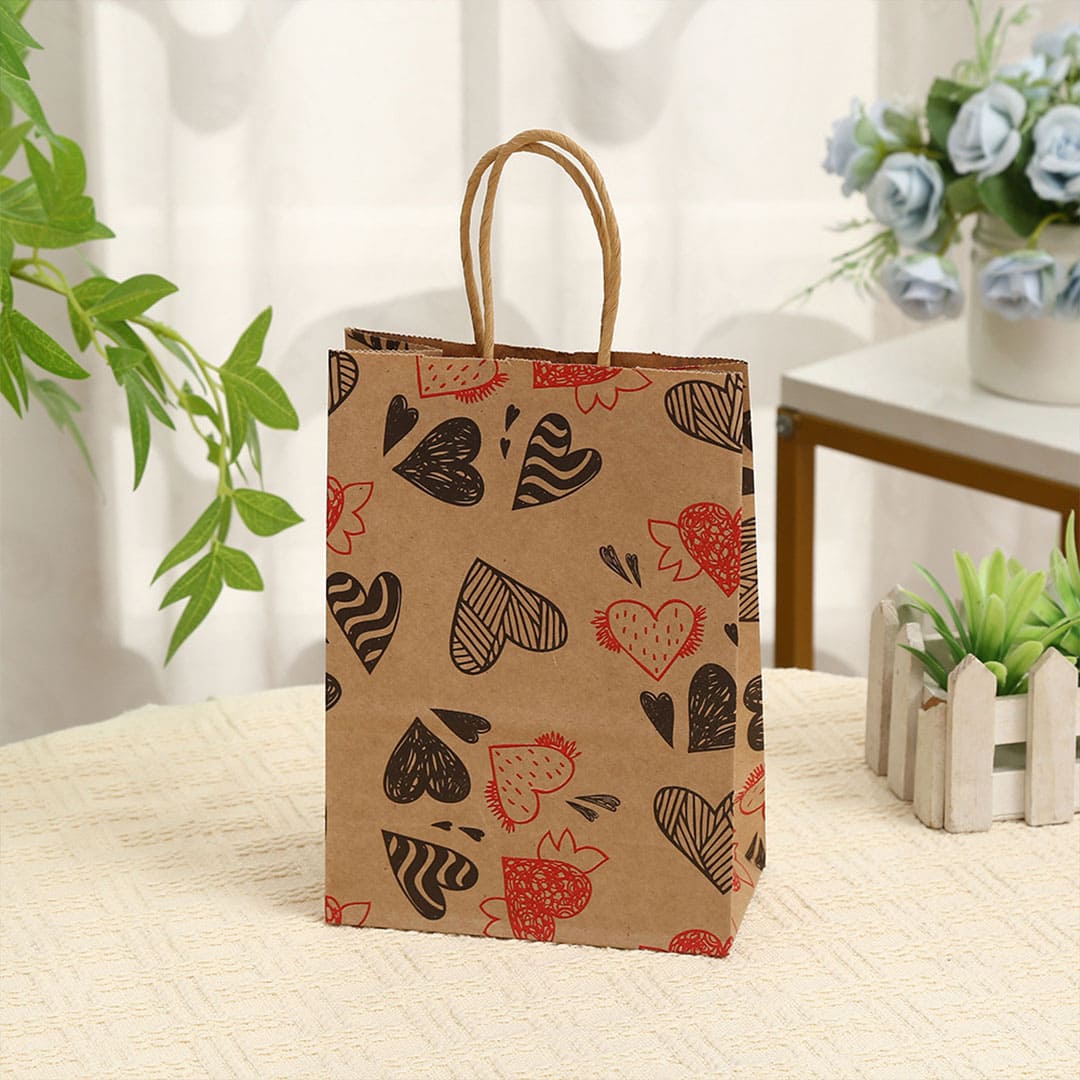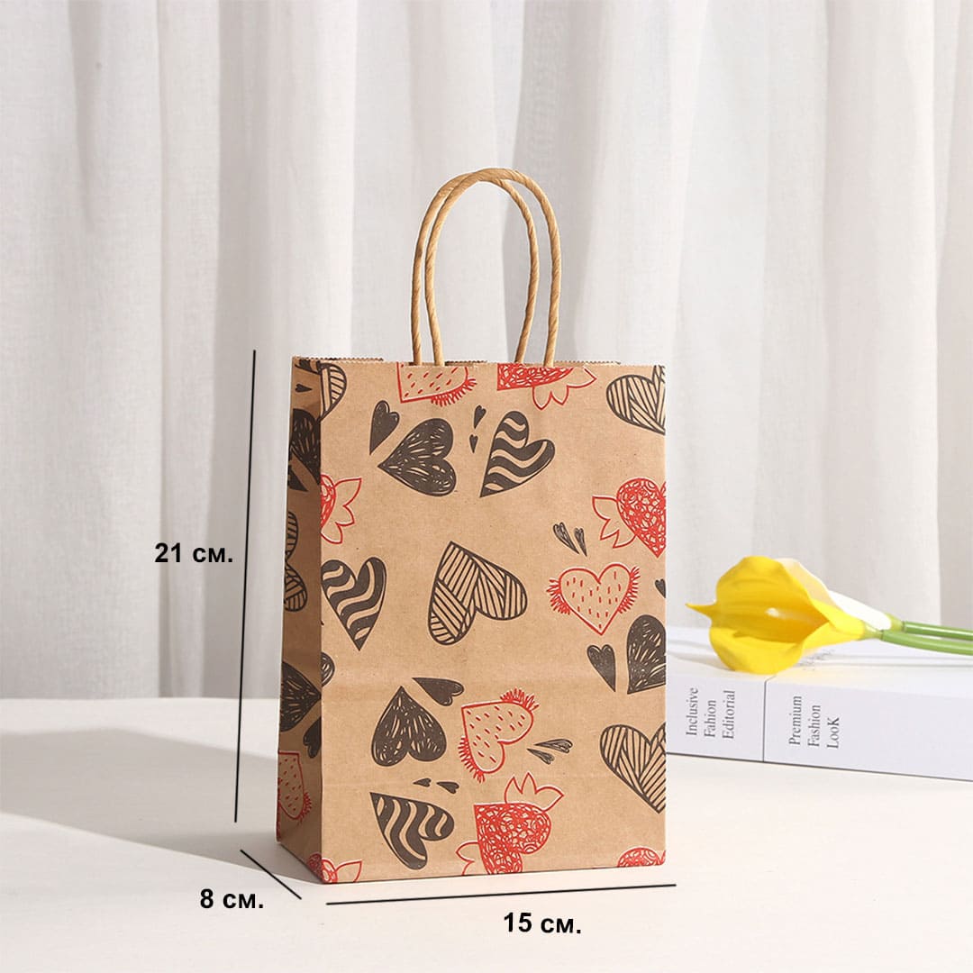 Паперовий подарунковий крафт-пакет із чорно-червоними малюнком серця, виті паперові ручки та плоске дно.