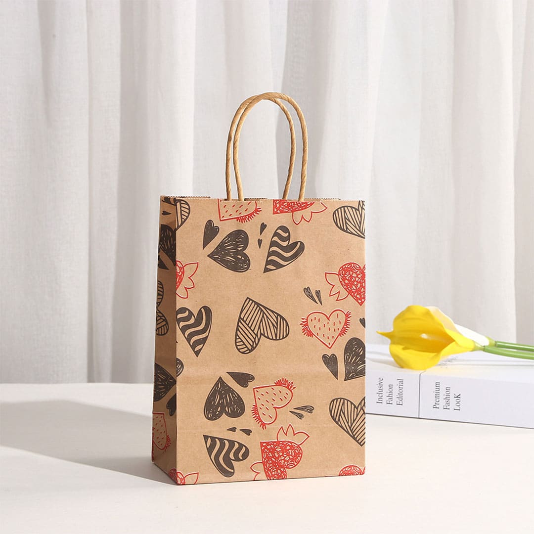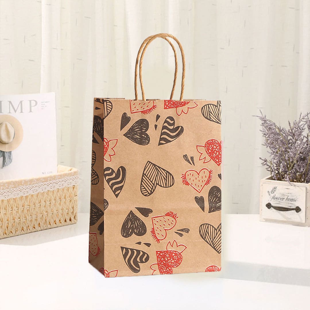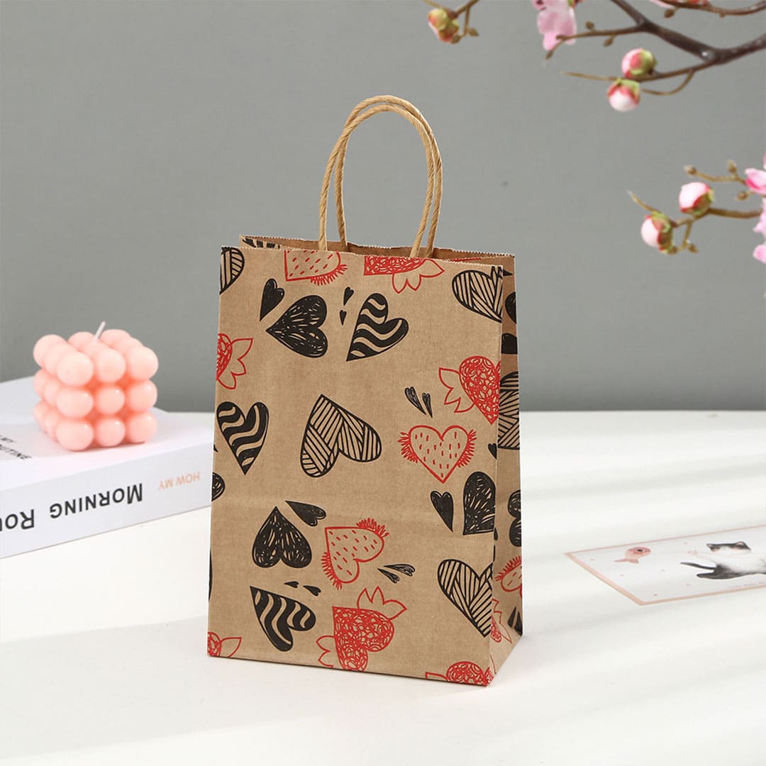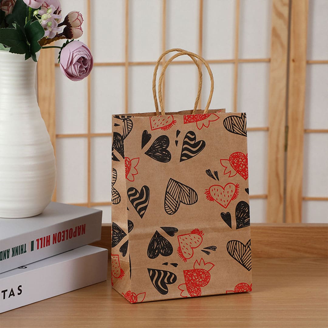 Паперовий подарунковий крафт-пакет із чорно-червоними малюнком серця, виті паперові ручки та плоске дно.