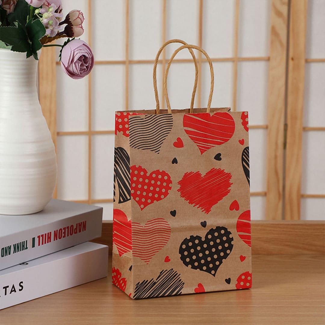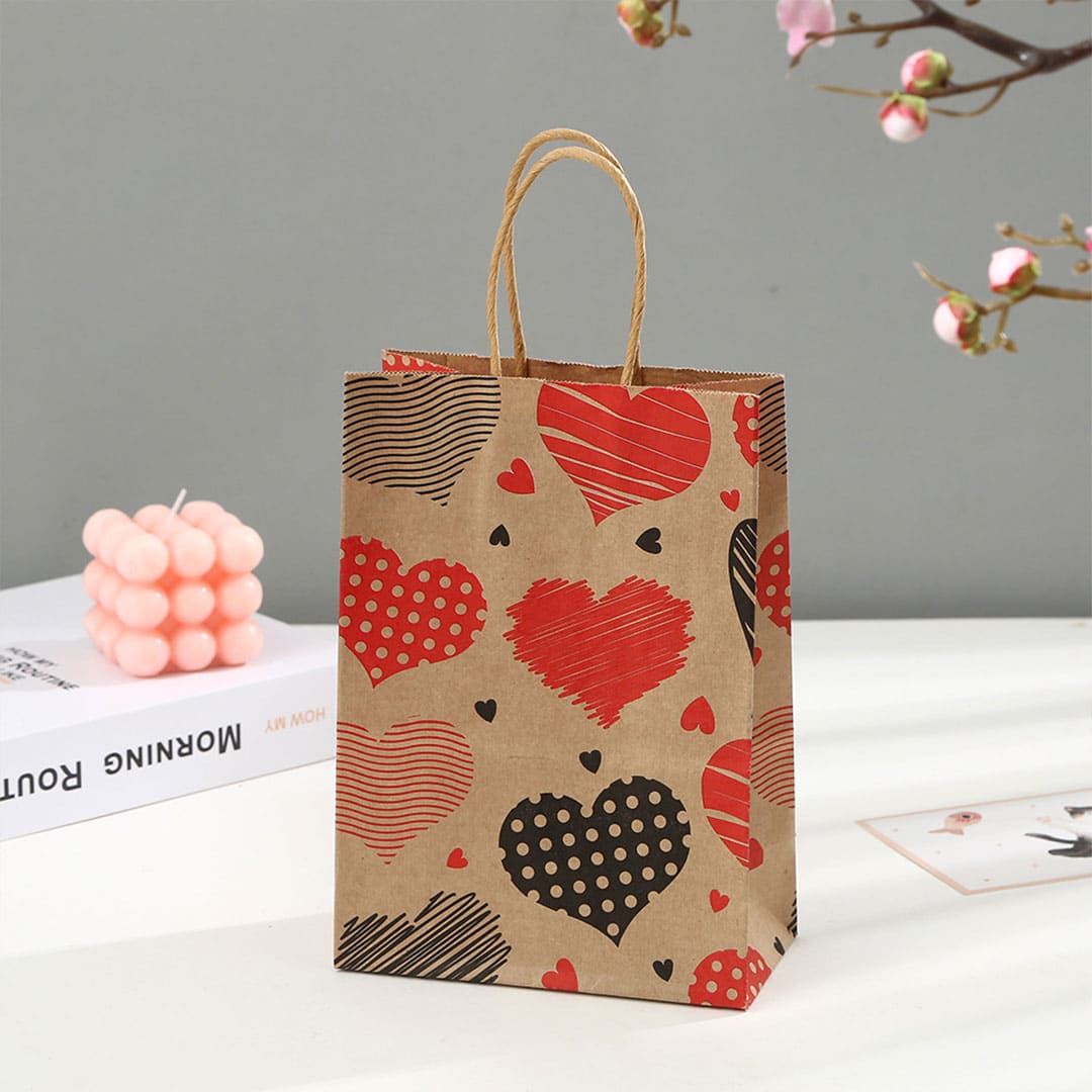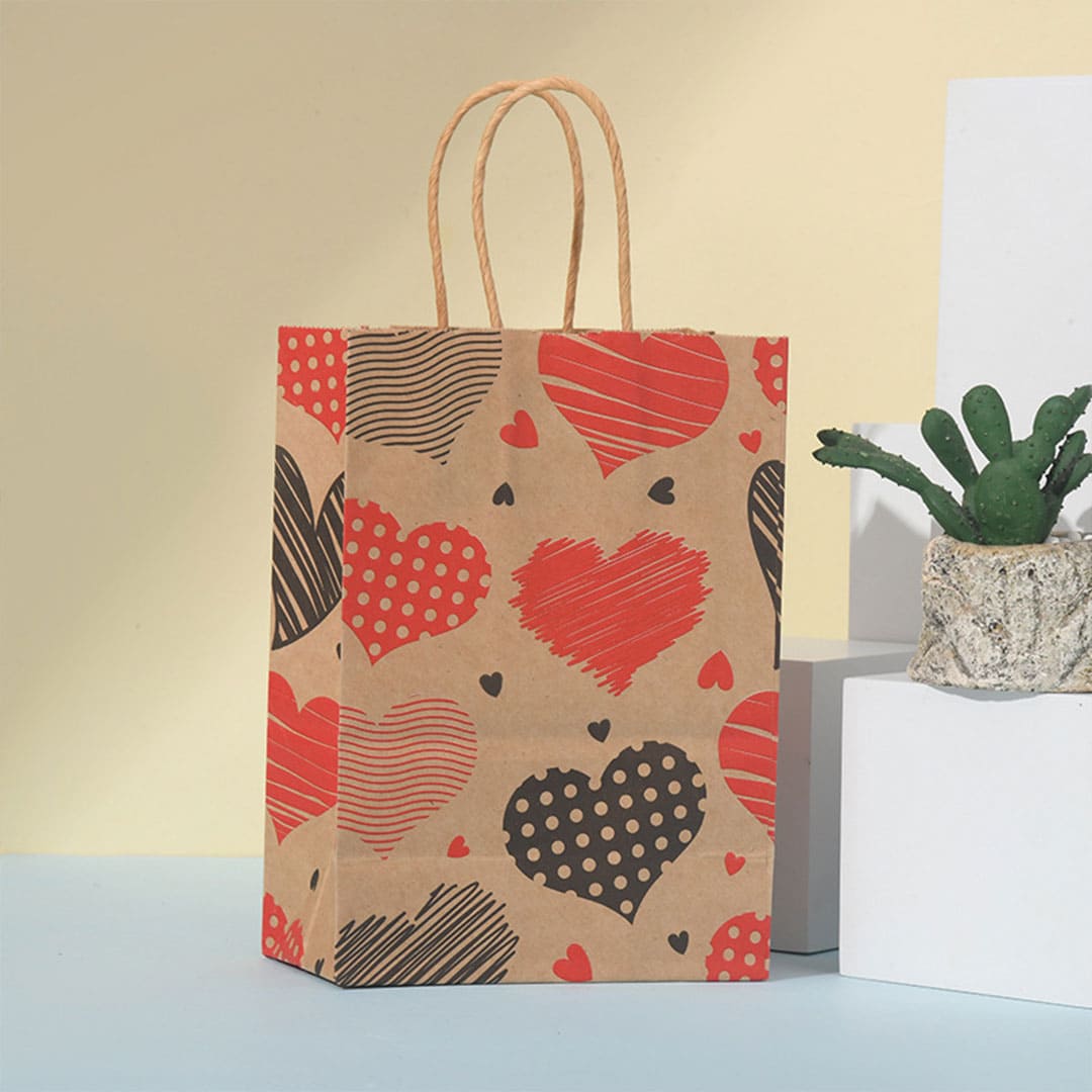 Паперовий подарунковий крафт-пакет із чорно-червоними малюнком серця, виті паперові ручки та плоске дно.