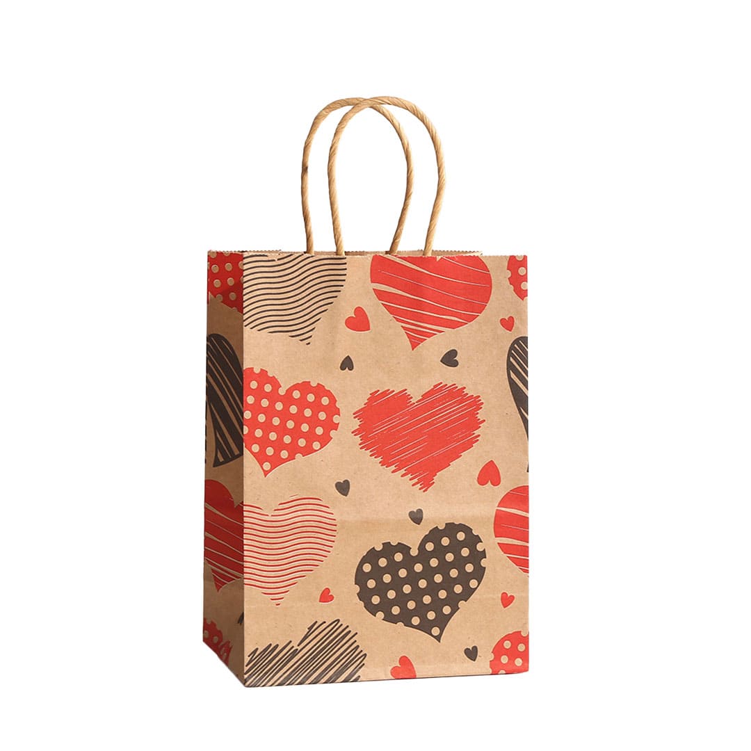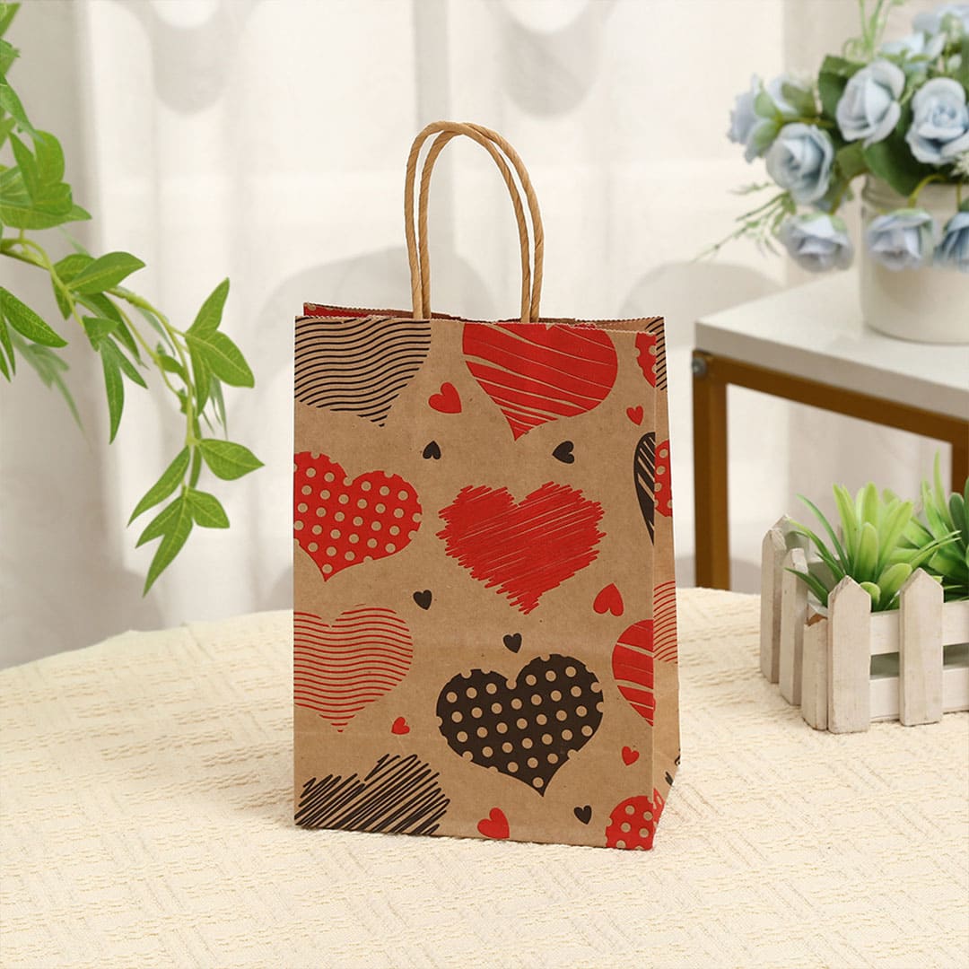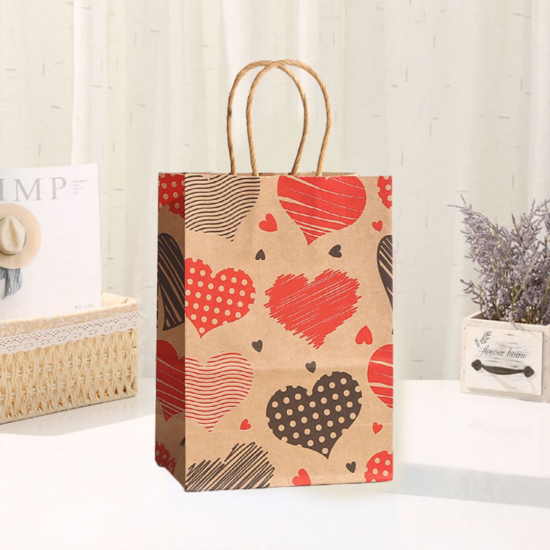 Паперовий подарунковий крафт-пакет із чорно-червоними малюнком серця, виті паперові ручки та плоске дно.