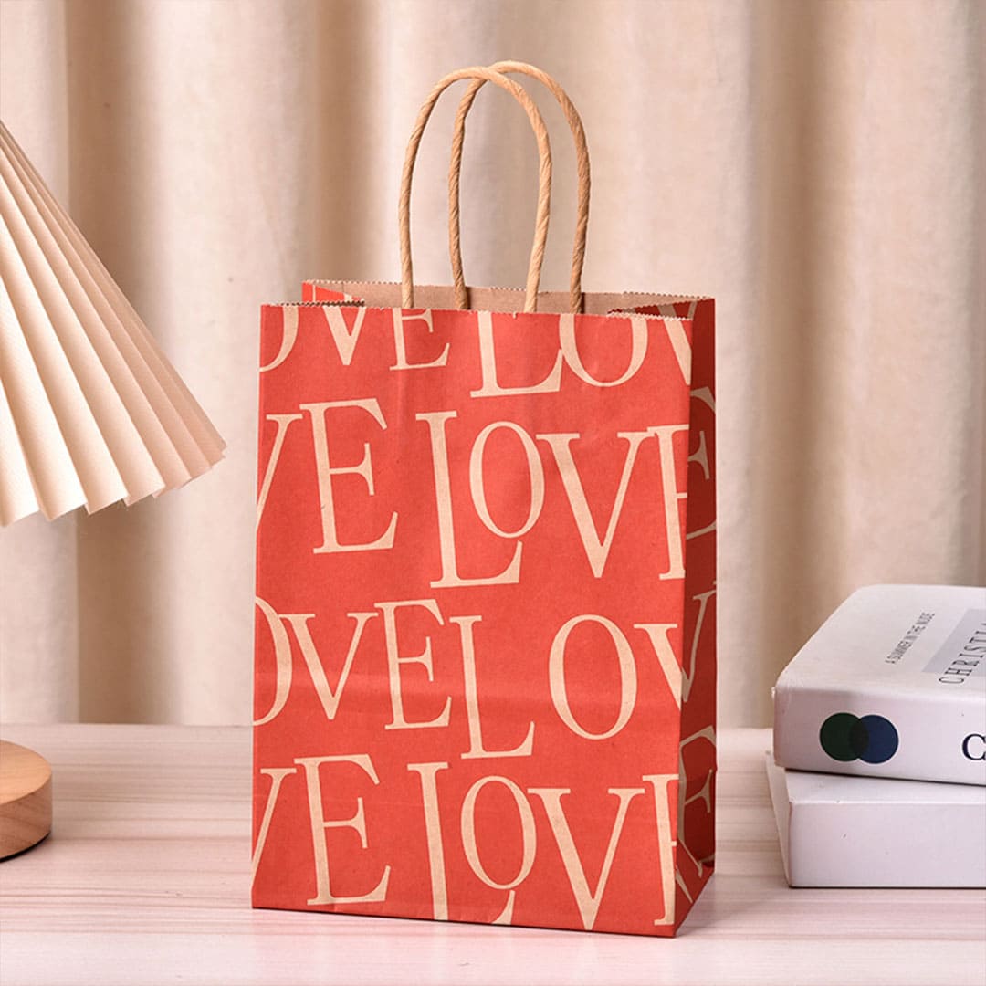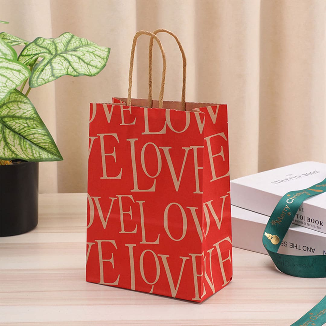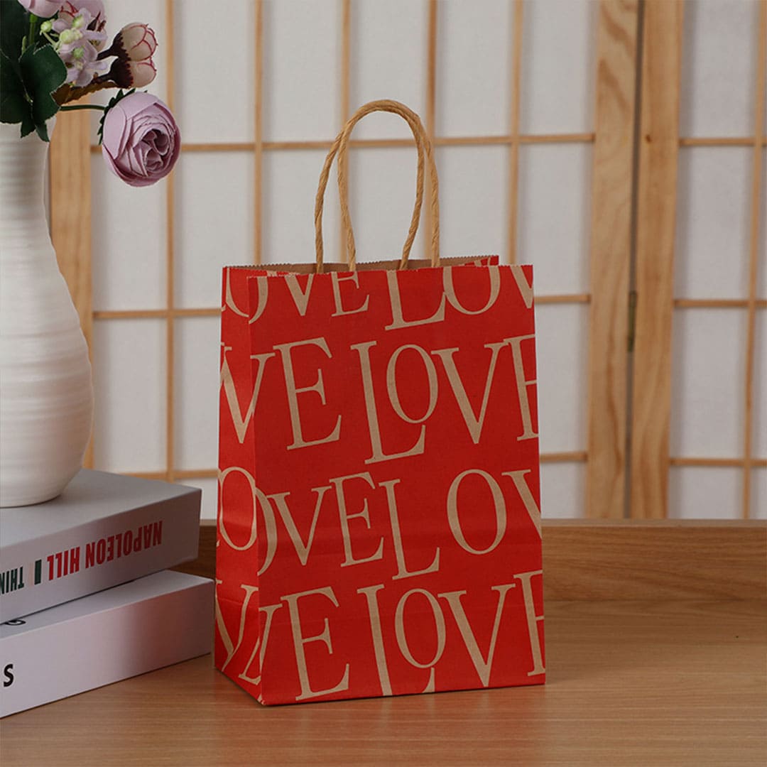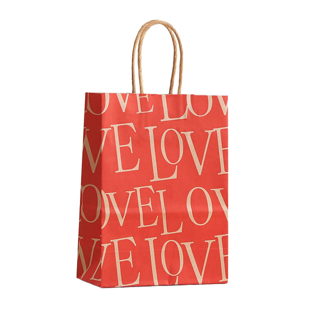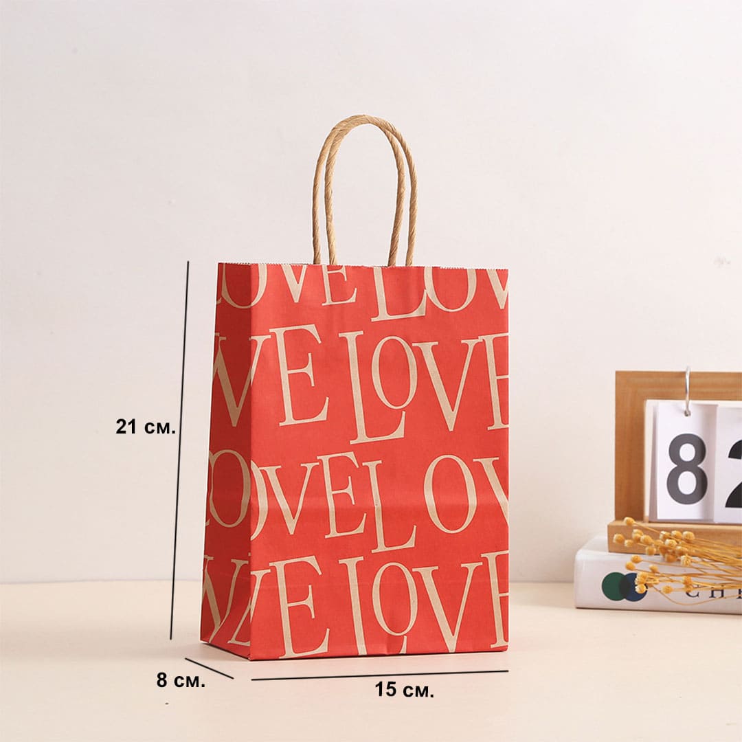 Червоний паперовий крафт-пакет з написами "Love", кручені паперові ручки та плоске дно.