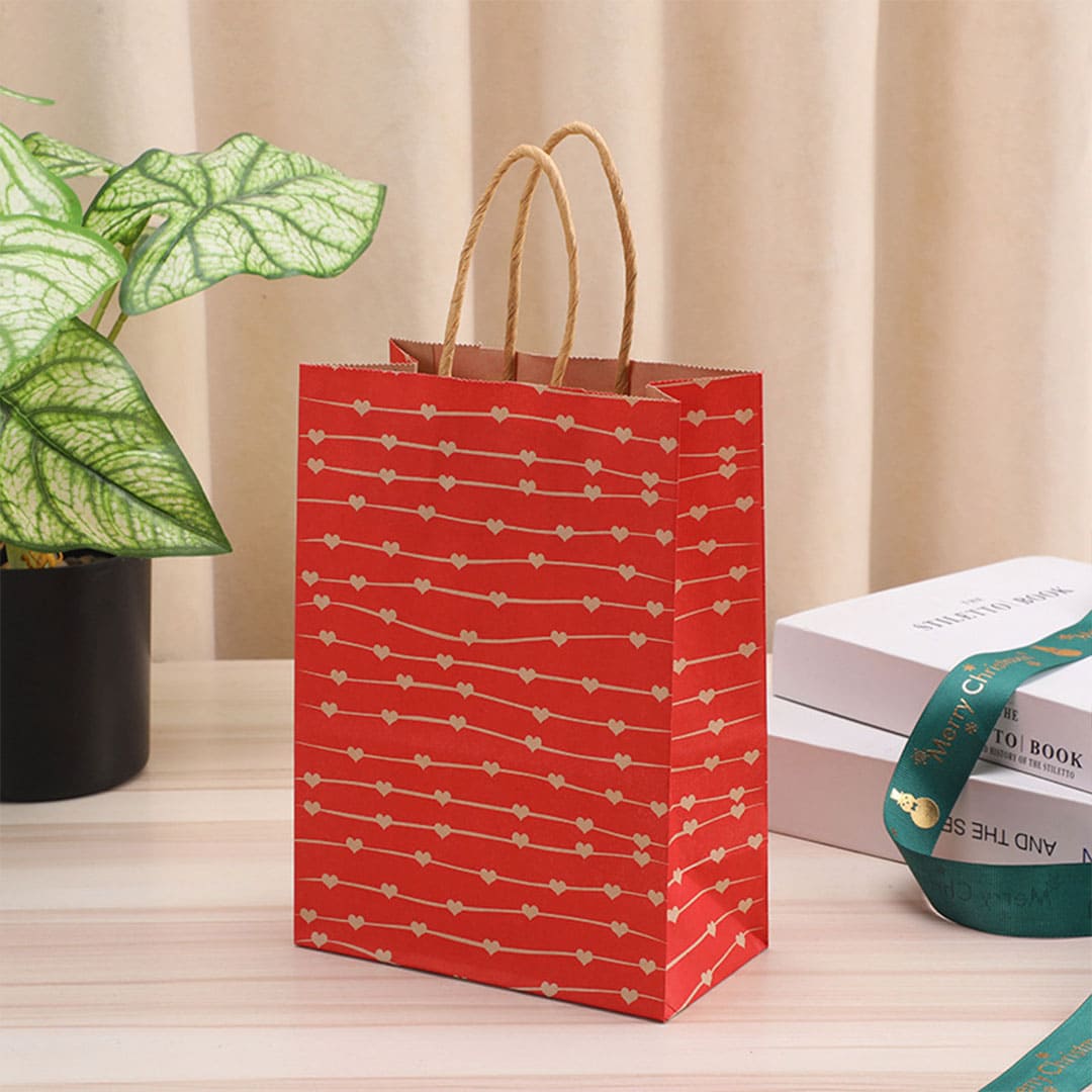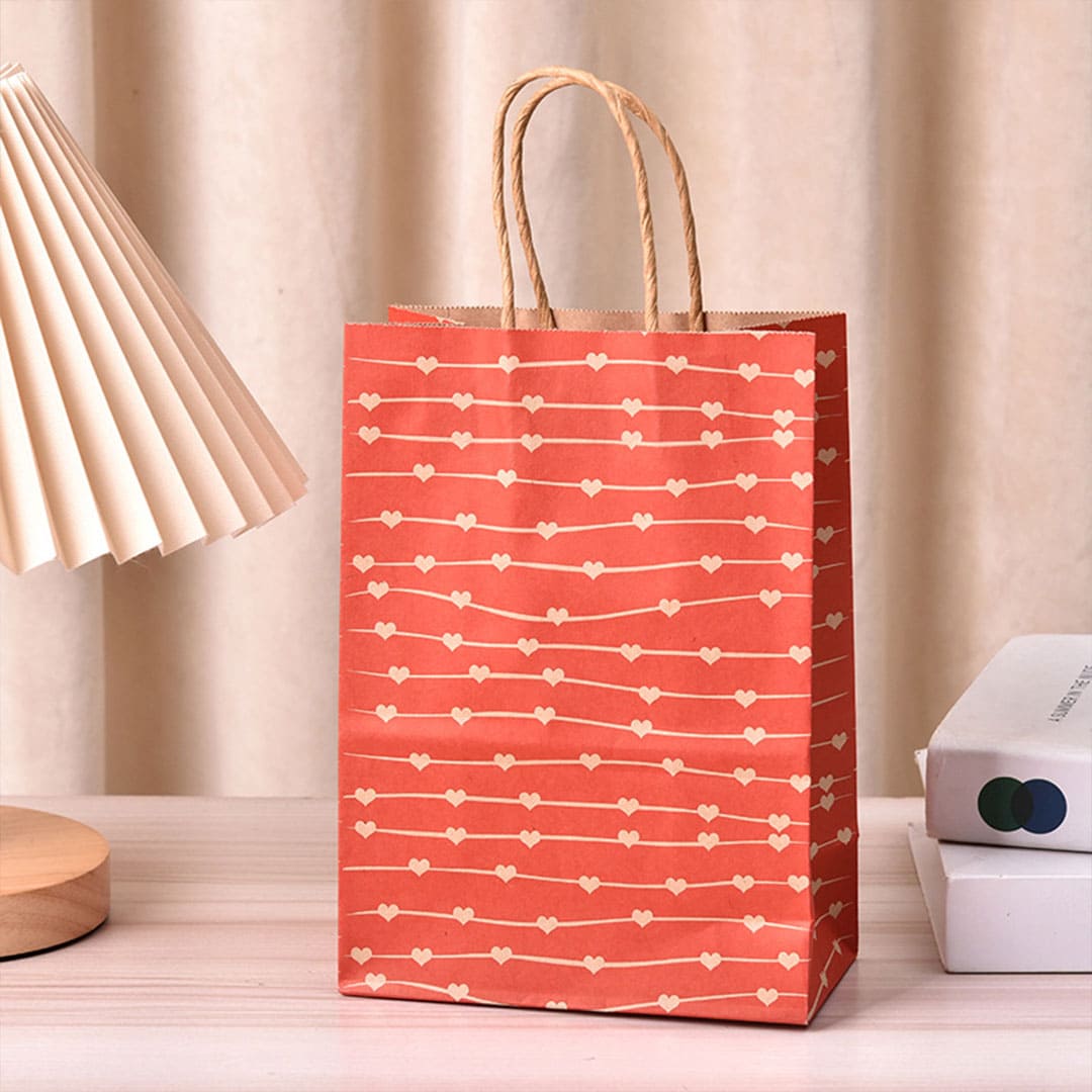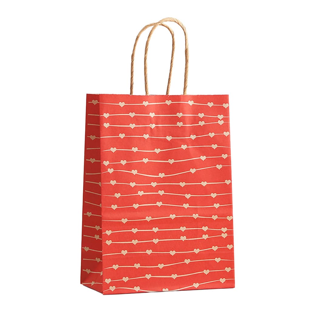 Червоний паперовий крафт-пакет з малюнком горизонтальні лінії і серця, виті паперові ручки і плоске дно.