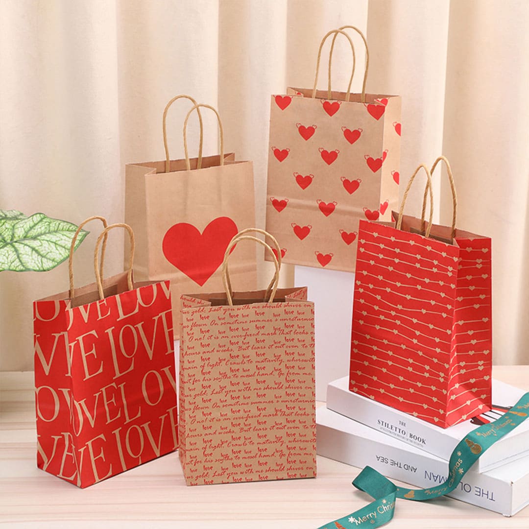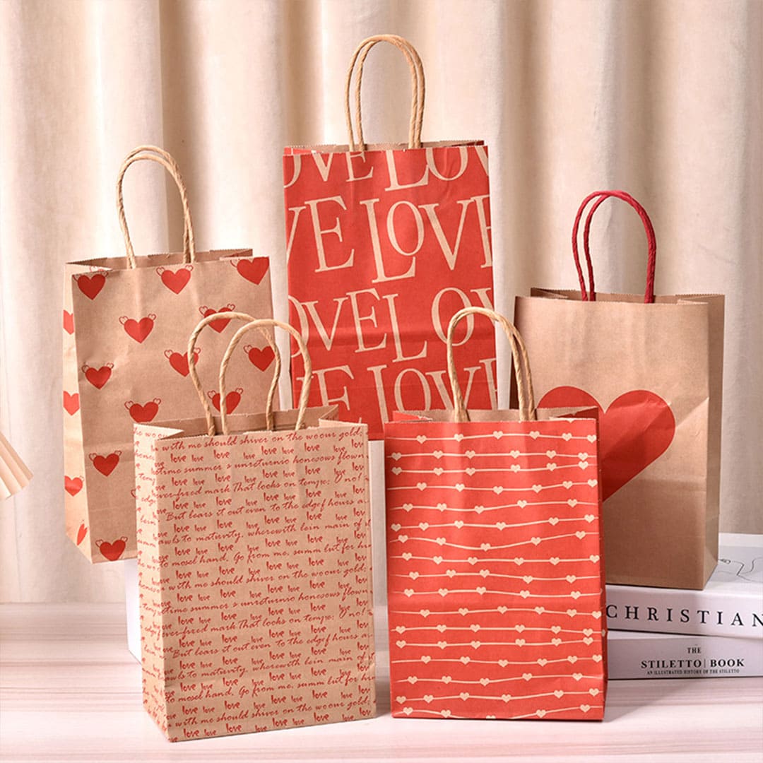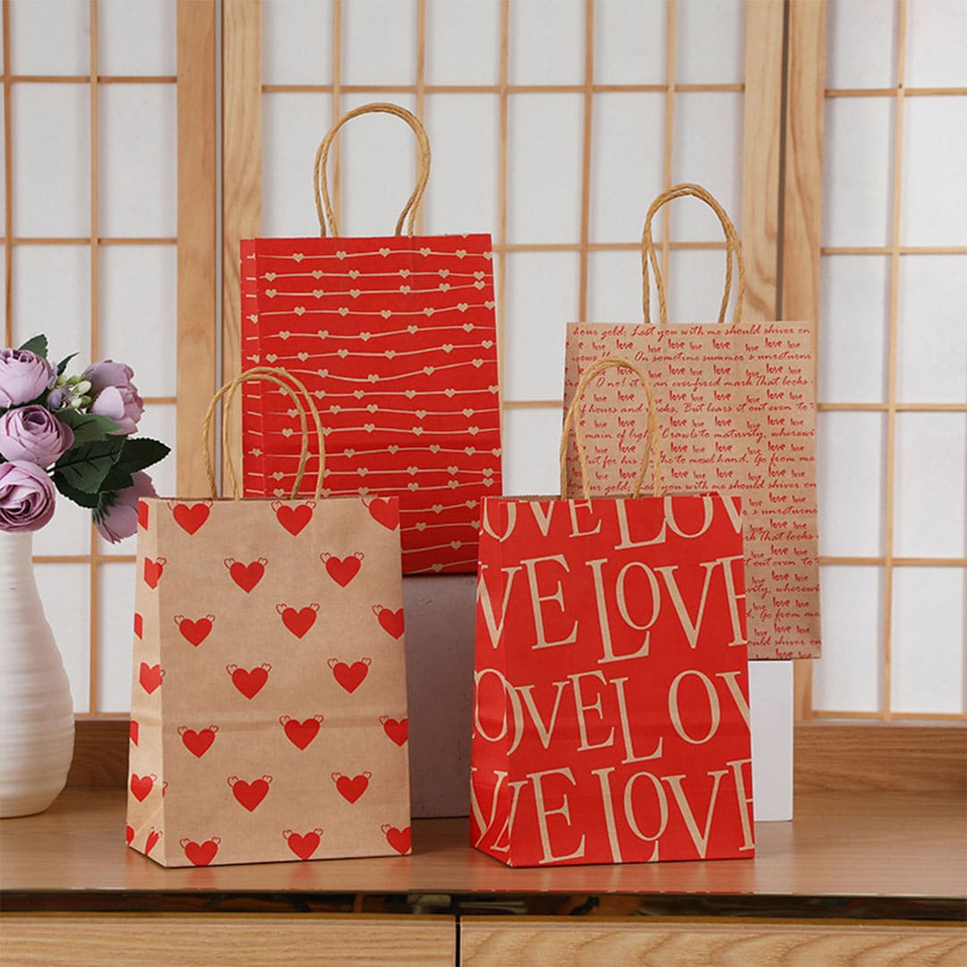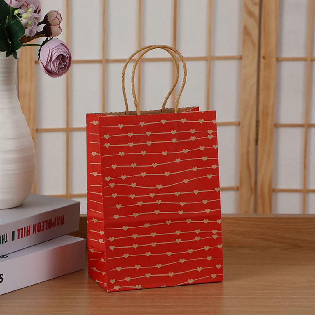 Червоний паперовий крафт-пакет з малюнком горизонтальні лінії і серця, виті паперові ручки і плоске дно.