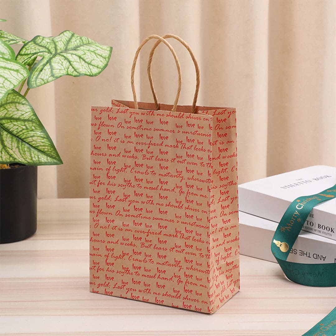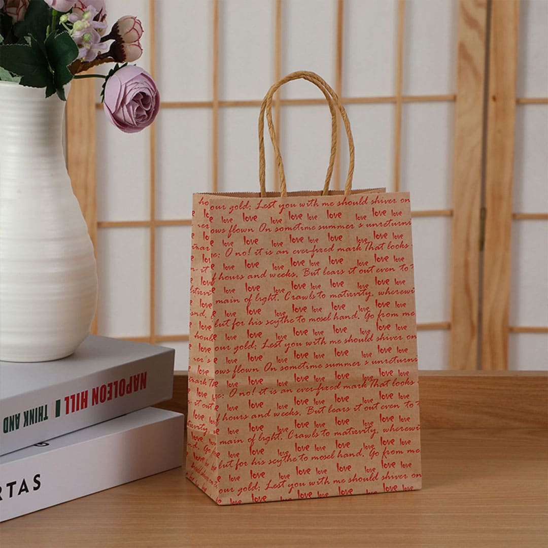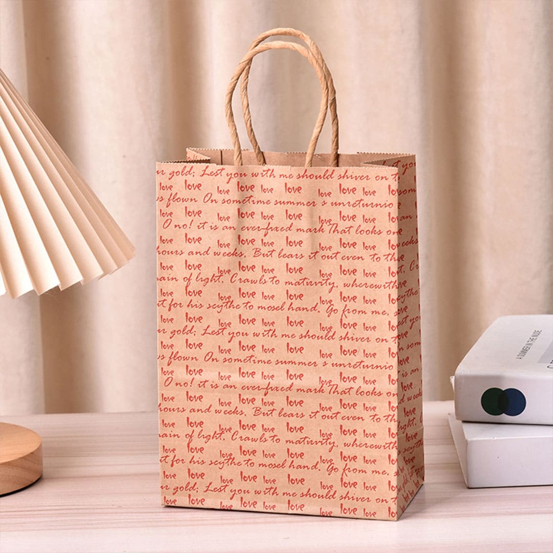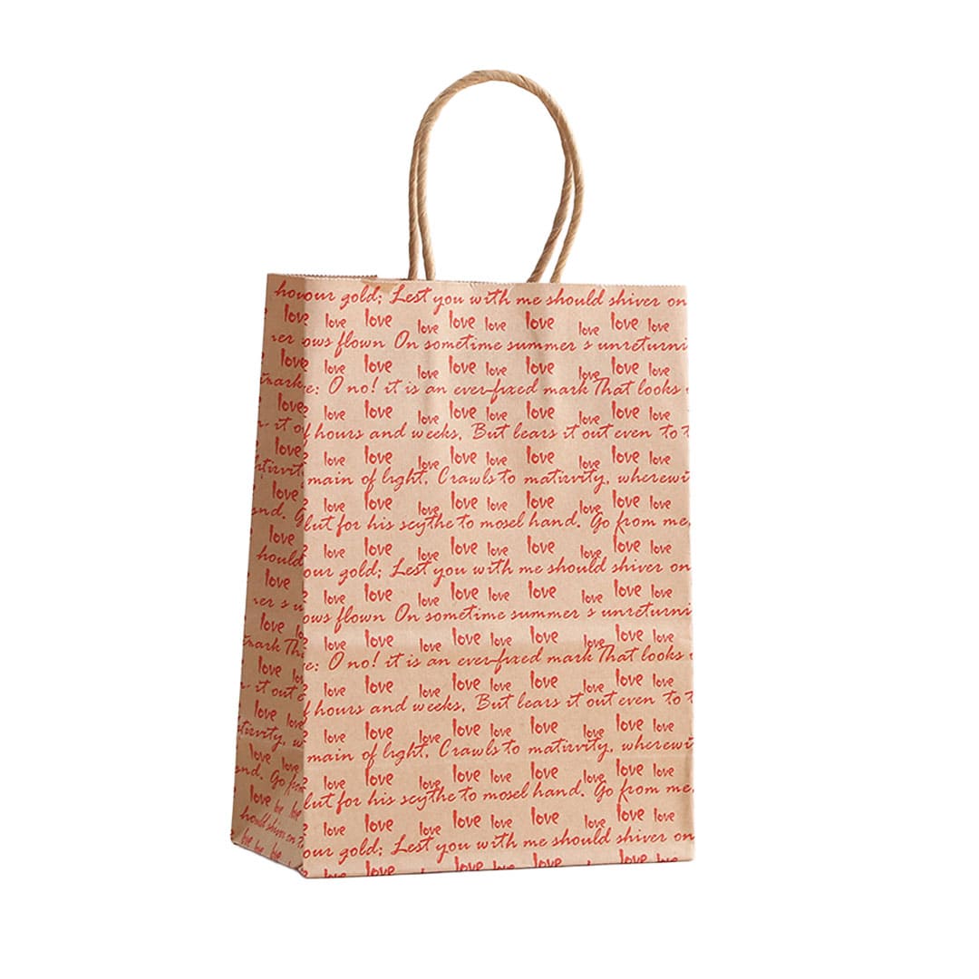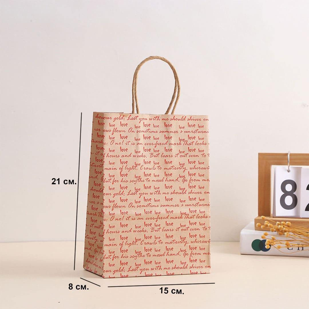 Паперовий подарунковий крафт-пакет з крученими паперовами ручками та плоским дном, та з написом уривка із сонета 116 Вільяма Шекспіра: