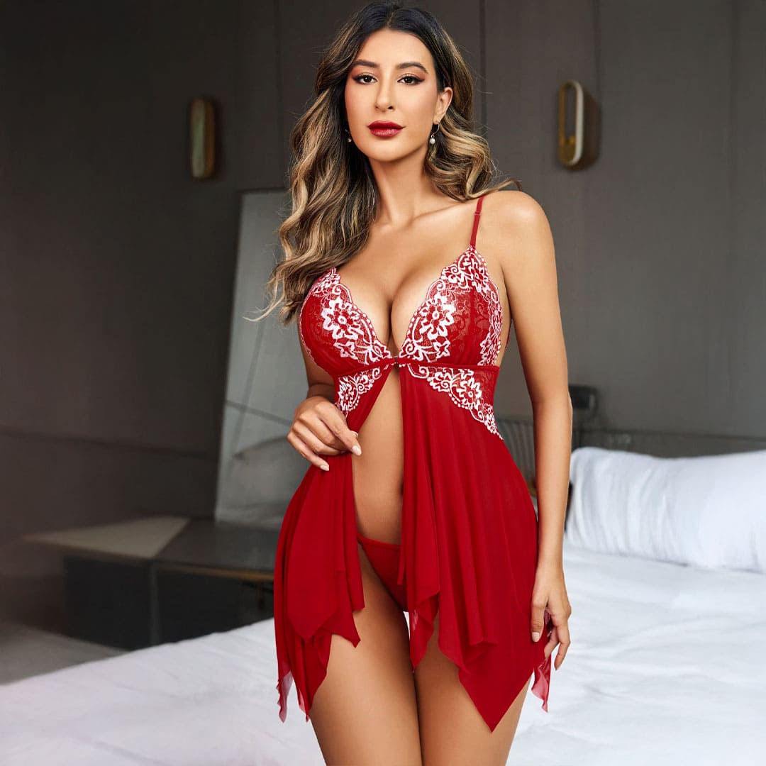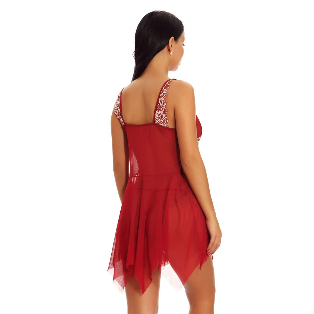 Прозорий асиметричний короткий пеньюар на тонких регульованих бретельках з мереживними чашечками, під грудьми з боків мереживні вставки, спереду по центру застібка, ззаду на брительках кружево. Завдяки розрізу попереду підходить для вагітних.