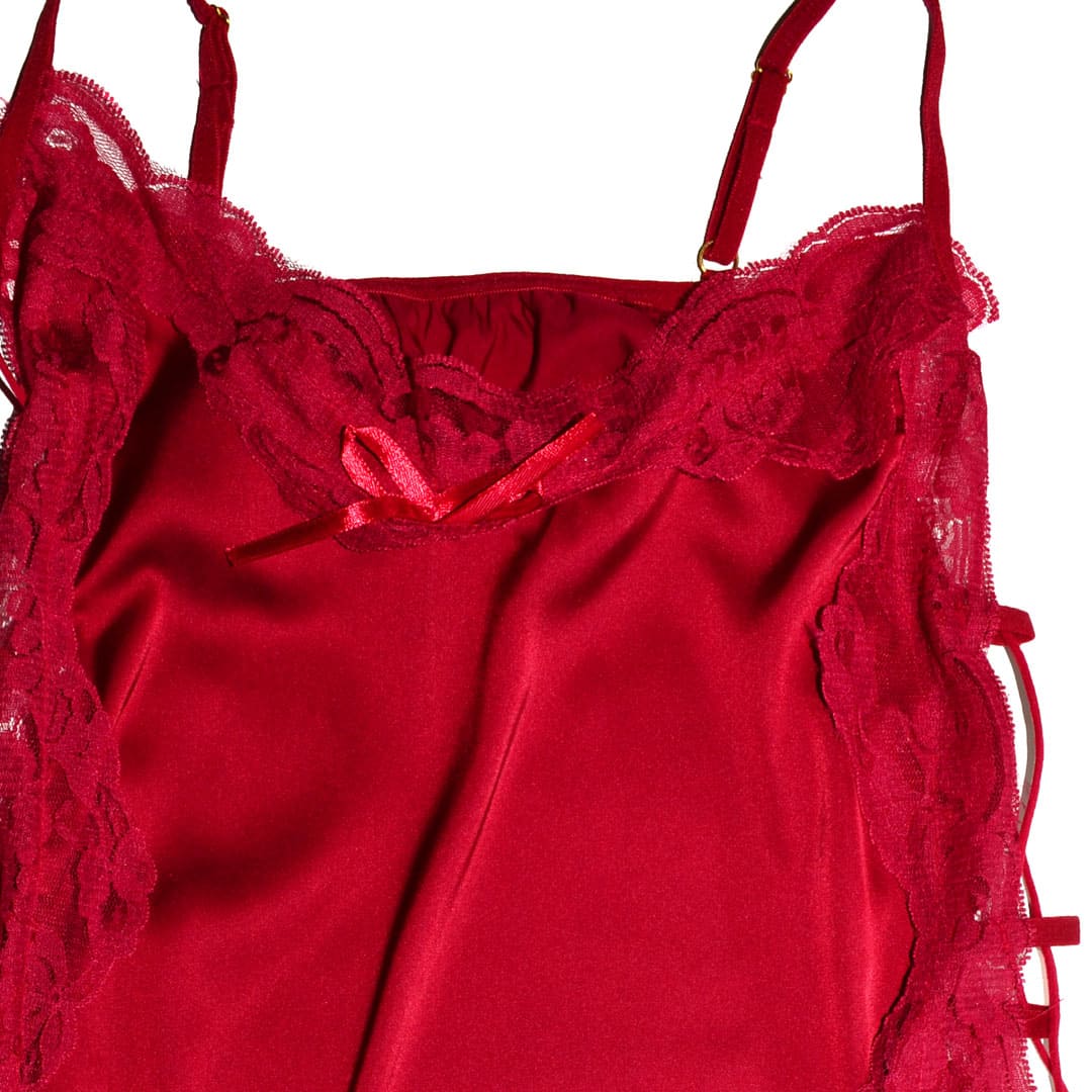 Короткий атласний пеньюар на тонких бретельках, що регулюються, по верху і бокам широке мереживо, передня і задня частина з'єднуються шнурівкою.