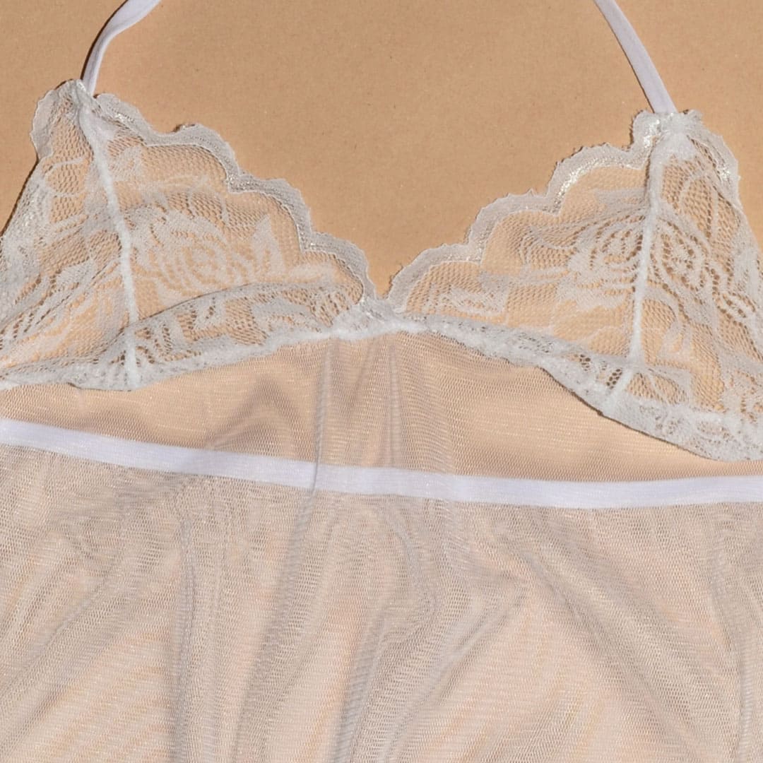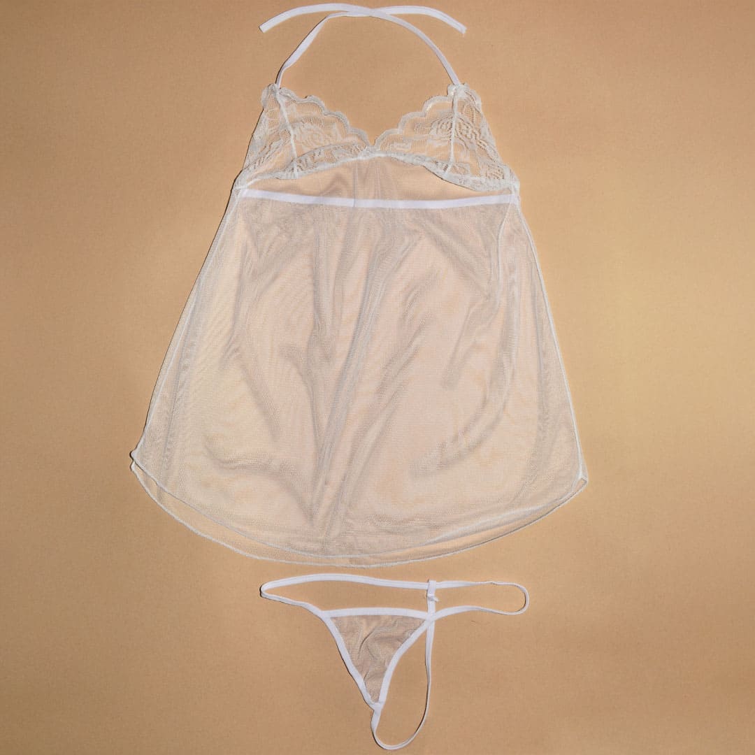 Прозорий короткий пеньюар через шию з білімі мережівнімі чашечками, розкльошені покрою, по низу гофрована облямівка.