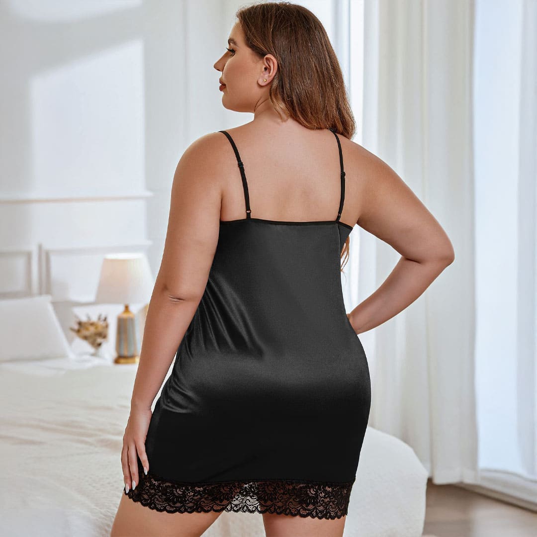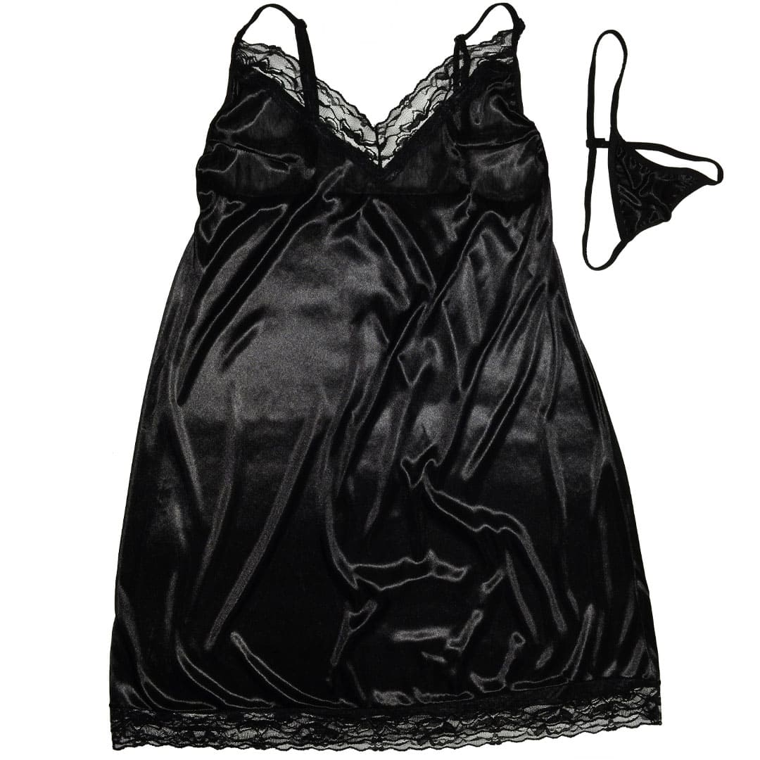 Чорний еротичний набір великого розміру (плюс-сайз): пеньюар і труси з блискучого матеріалу під атлас.