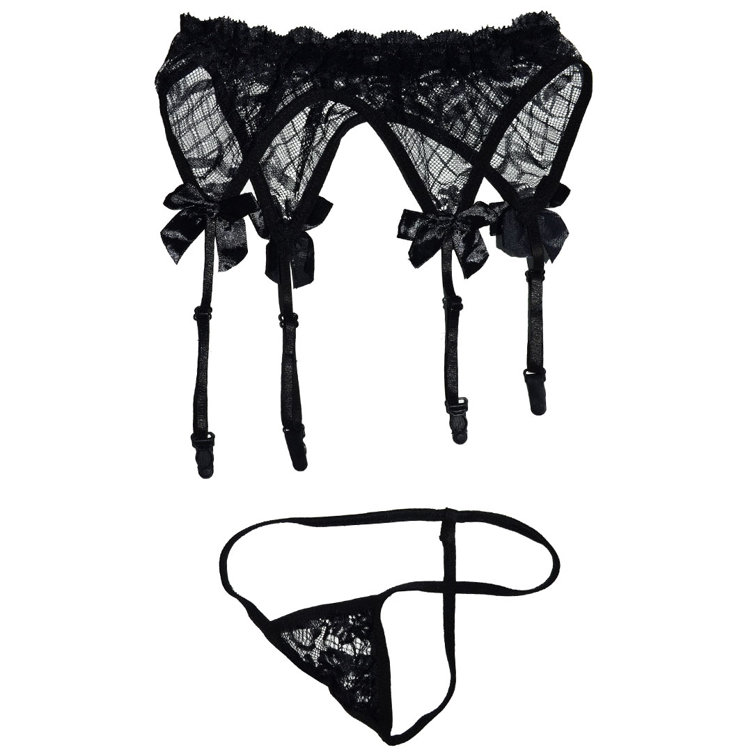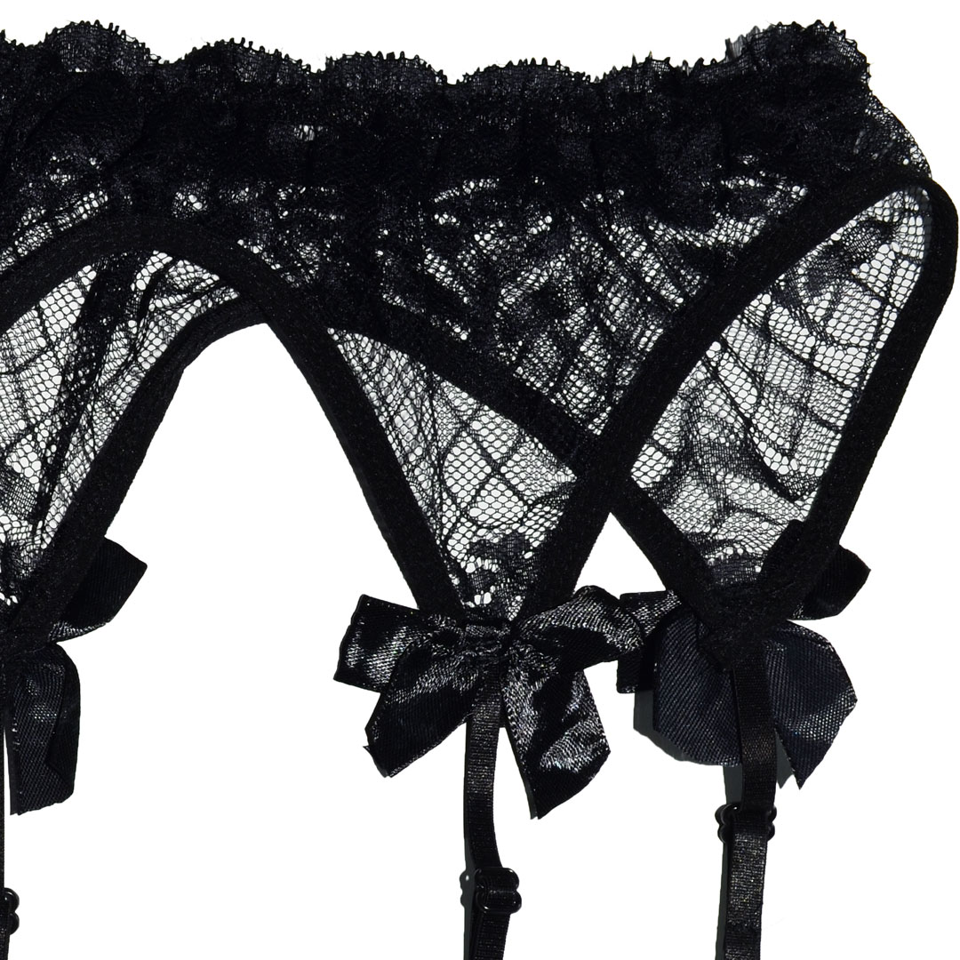 Пояс для панчох (без панчох) на гумці в поясі з прозорого мережива з квітковим малюнком зверху і ромбами внизу, чотири підв'язки, що регулюються, прикрашені атласними бантами зверху.