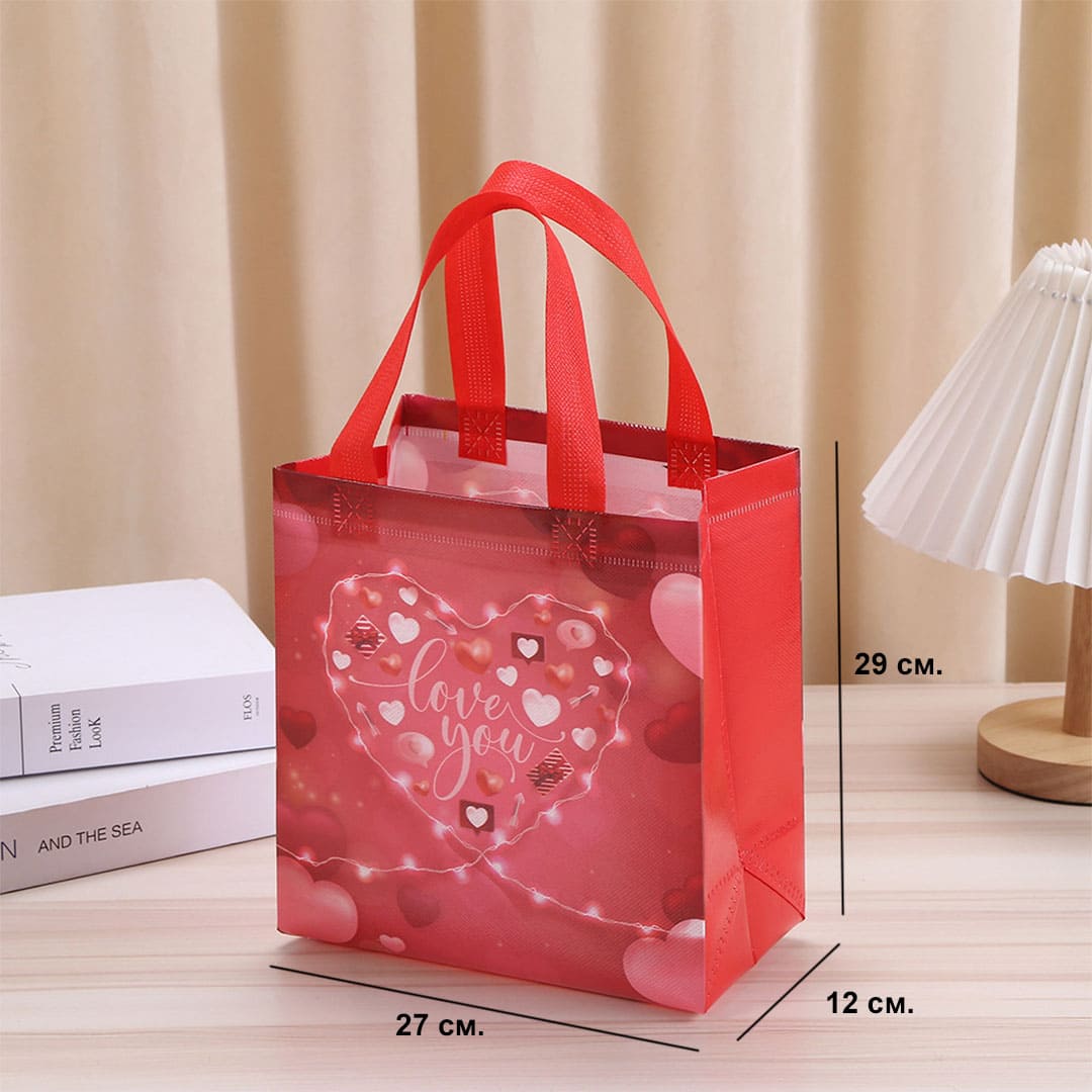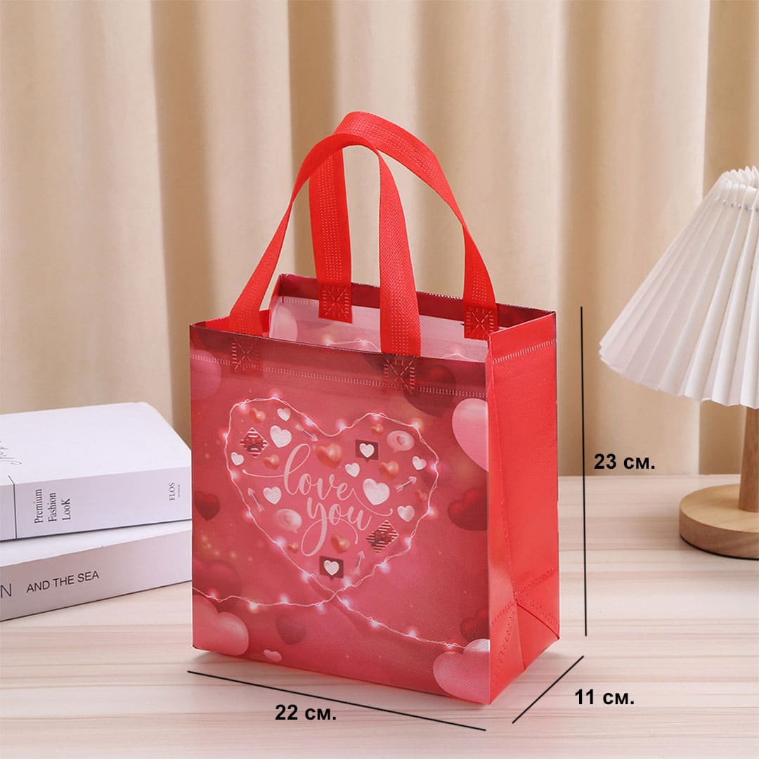 Подарункова ЕкоТорба (шопер) з написом "Love you", петлеві ручки та донне розширення, водонепроникна. Розміри: 23х22х11 см., 29х27х12 см. Матеріал: ламінований спанбонд.