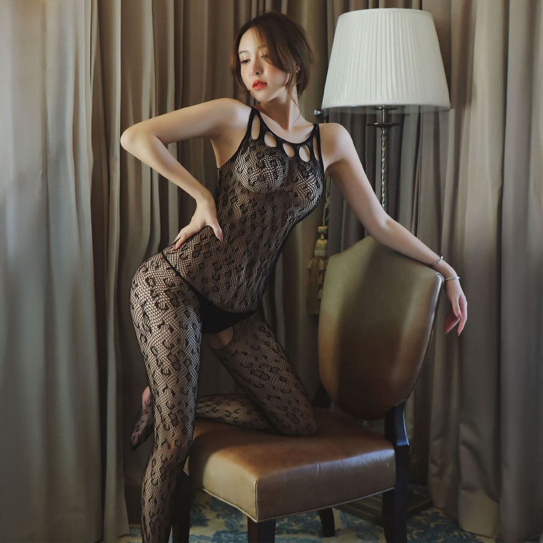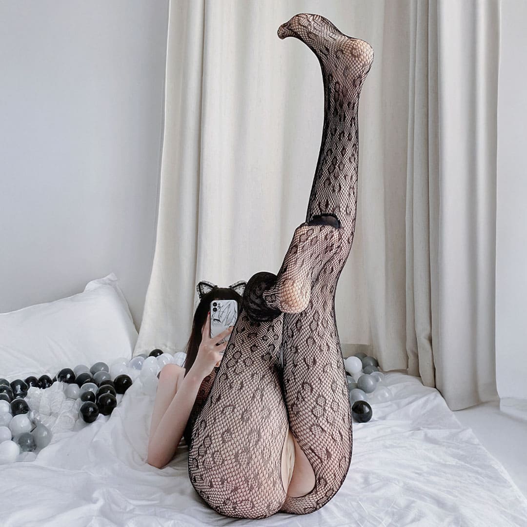 Эротический прозрачный БодиСтокинг (Боди комбинезон Сетка, игровой костюм, костюм для ролевых игр) с рисунком в стиле "Сафари" (леопардовый принт) на широких бретелях с вырезами круги вокруг горловины, по центру ластавницы (в паху) разрез.